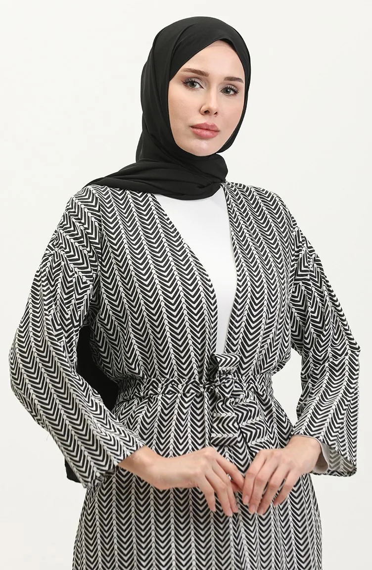 Desenli Kuşaklı Abaya 83005-01 Siyah Beyaz