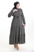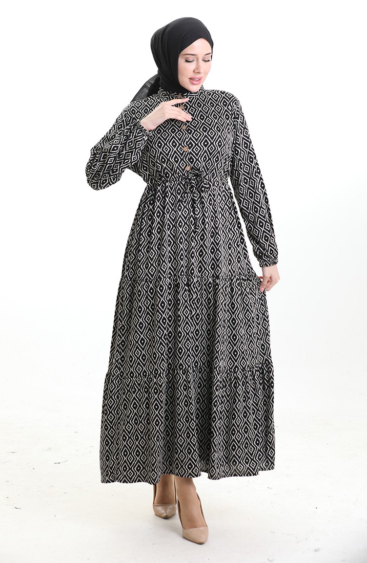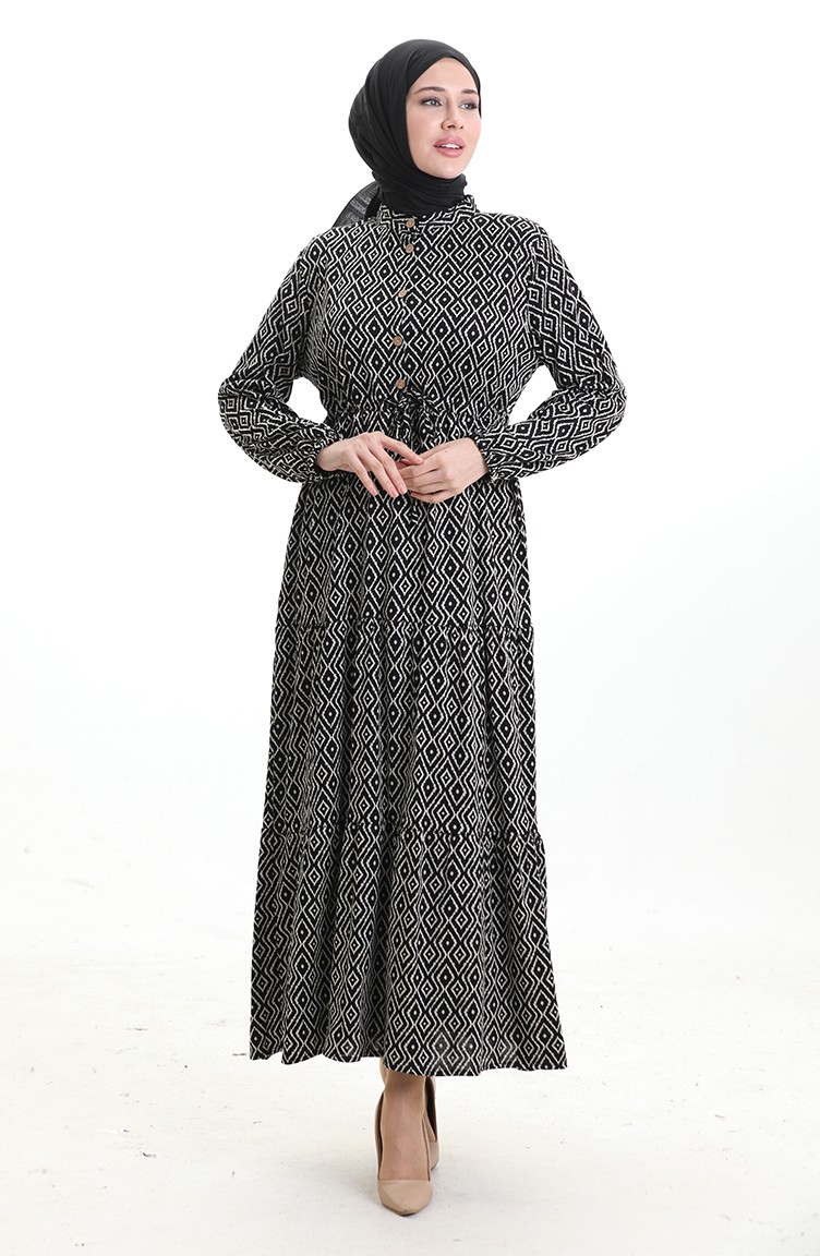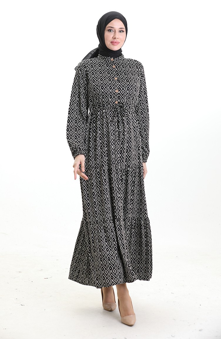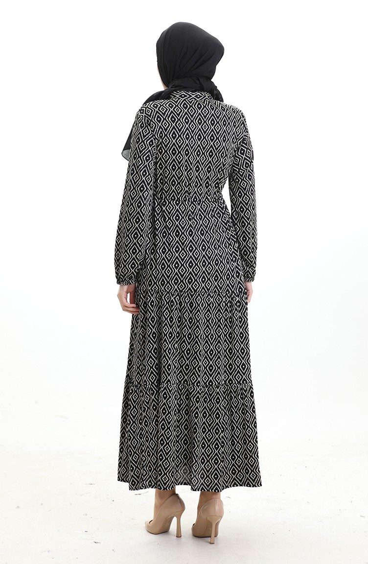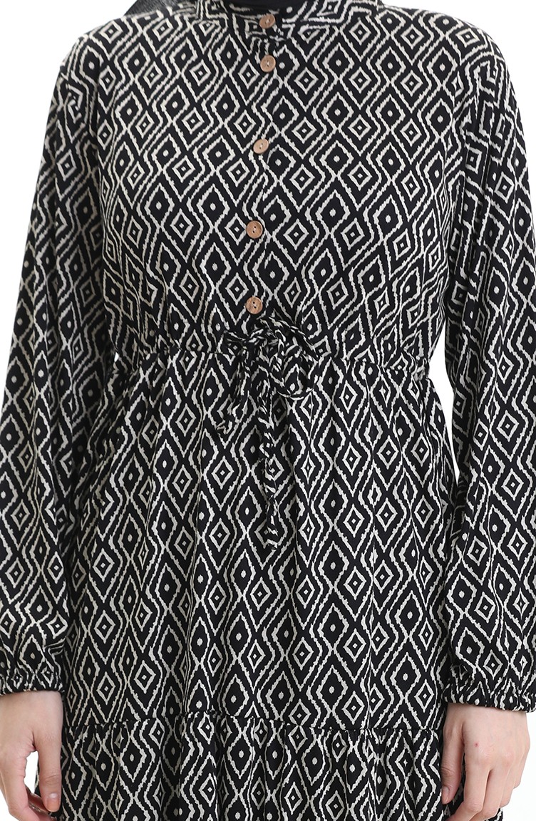 فستان بنمط هندسي بخصر مربوط 0195-01 أسود 0195-01