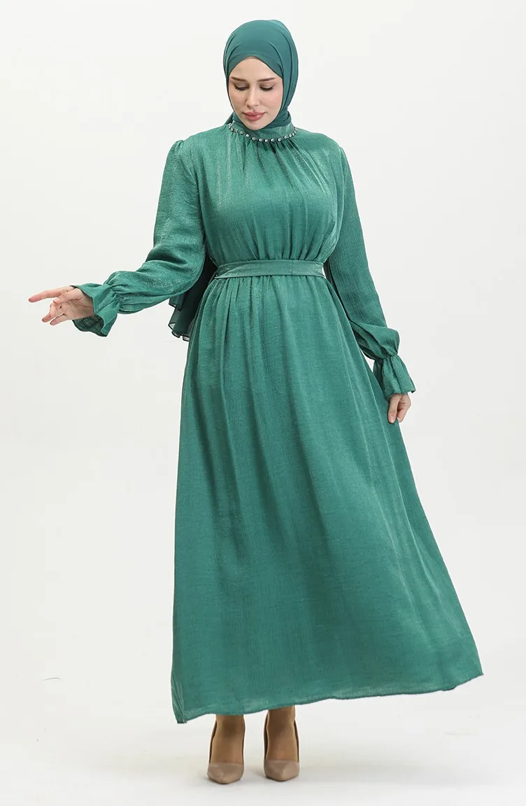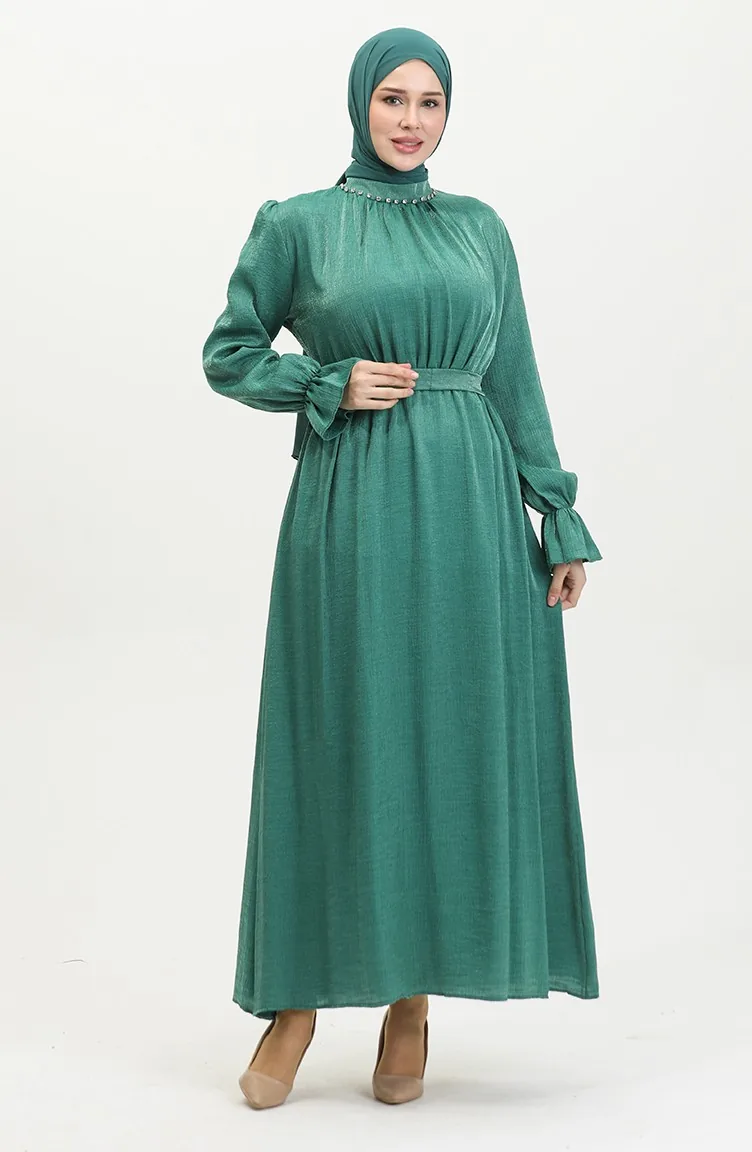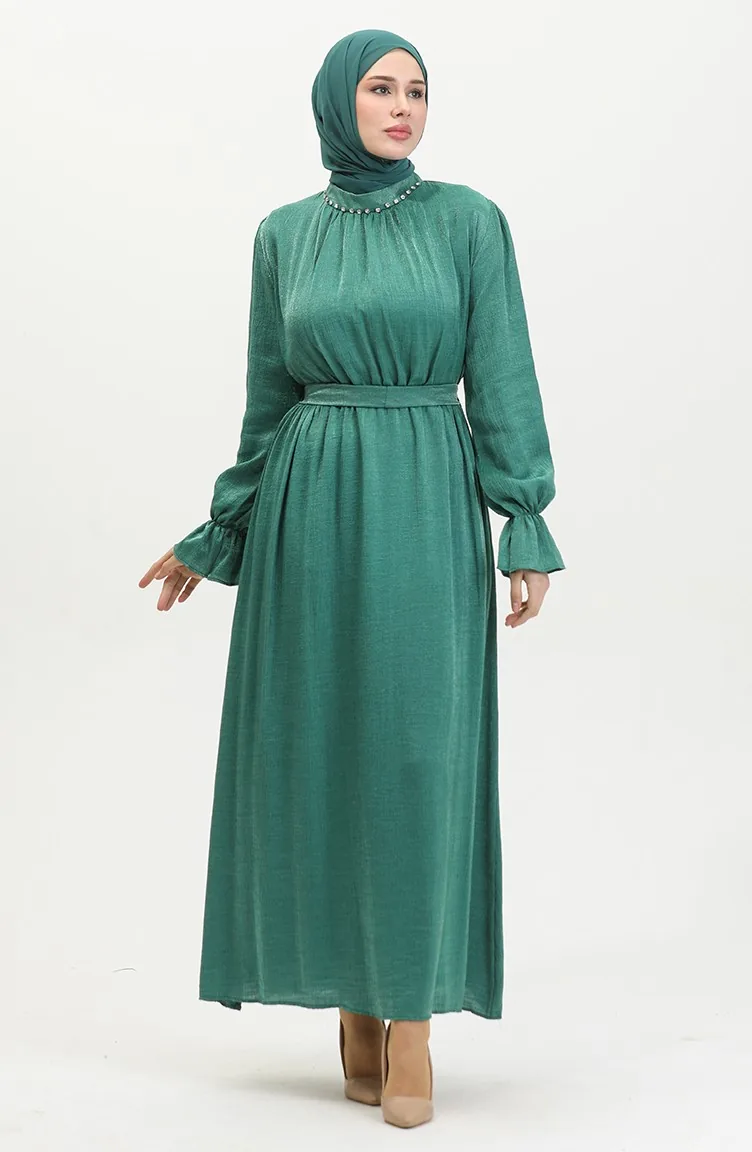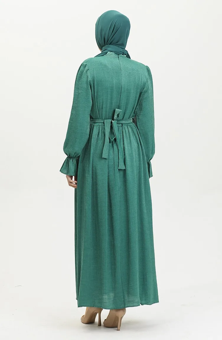 فستان كتان بحزام للمحجبات 81853-07 أخضر زمردي 81853-07