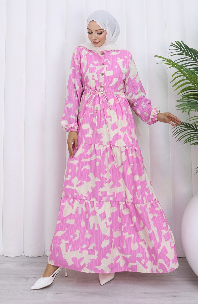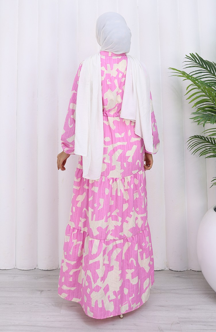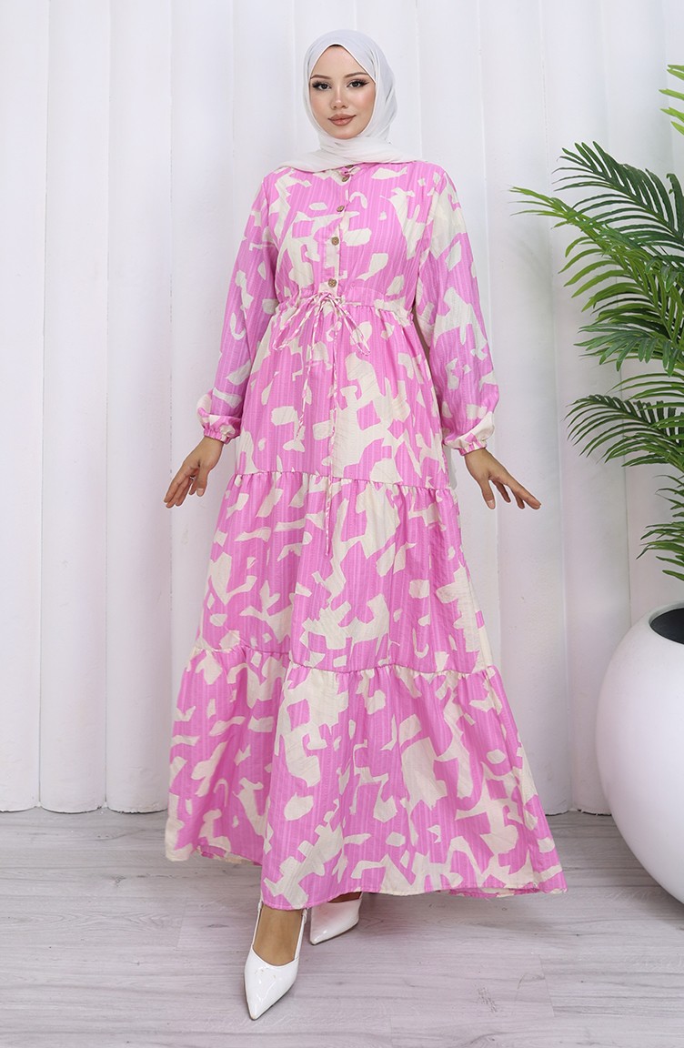 فستان منقوش بياقة جدّ وخصر مربوط 0191-05 وردي 0191-05