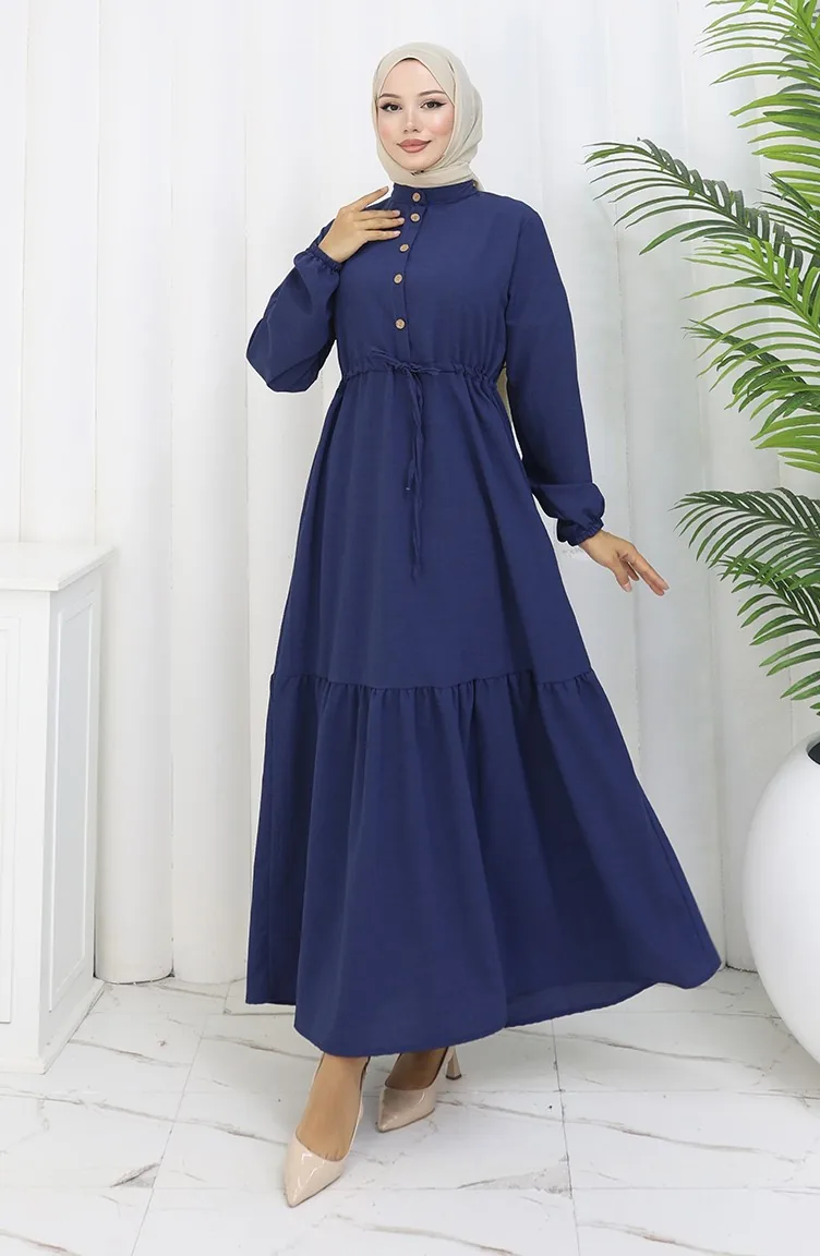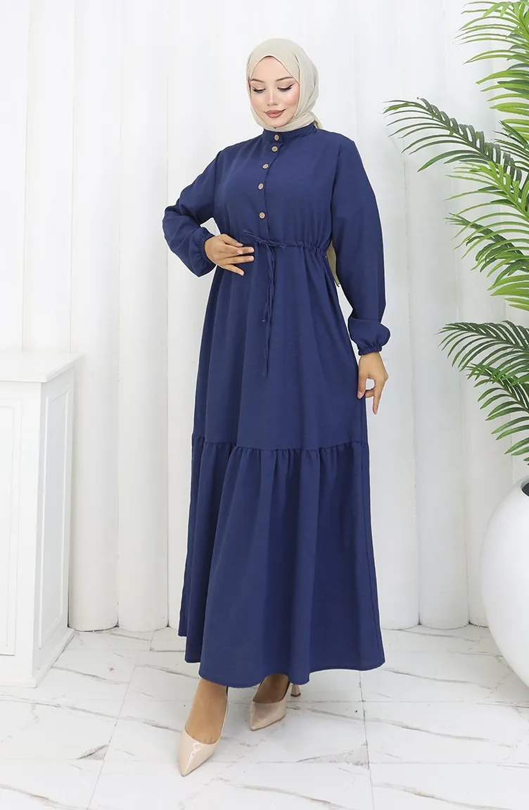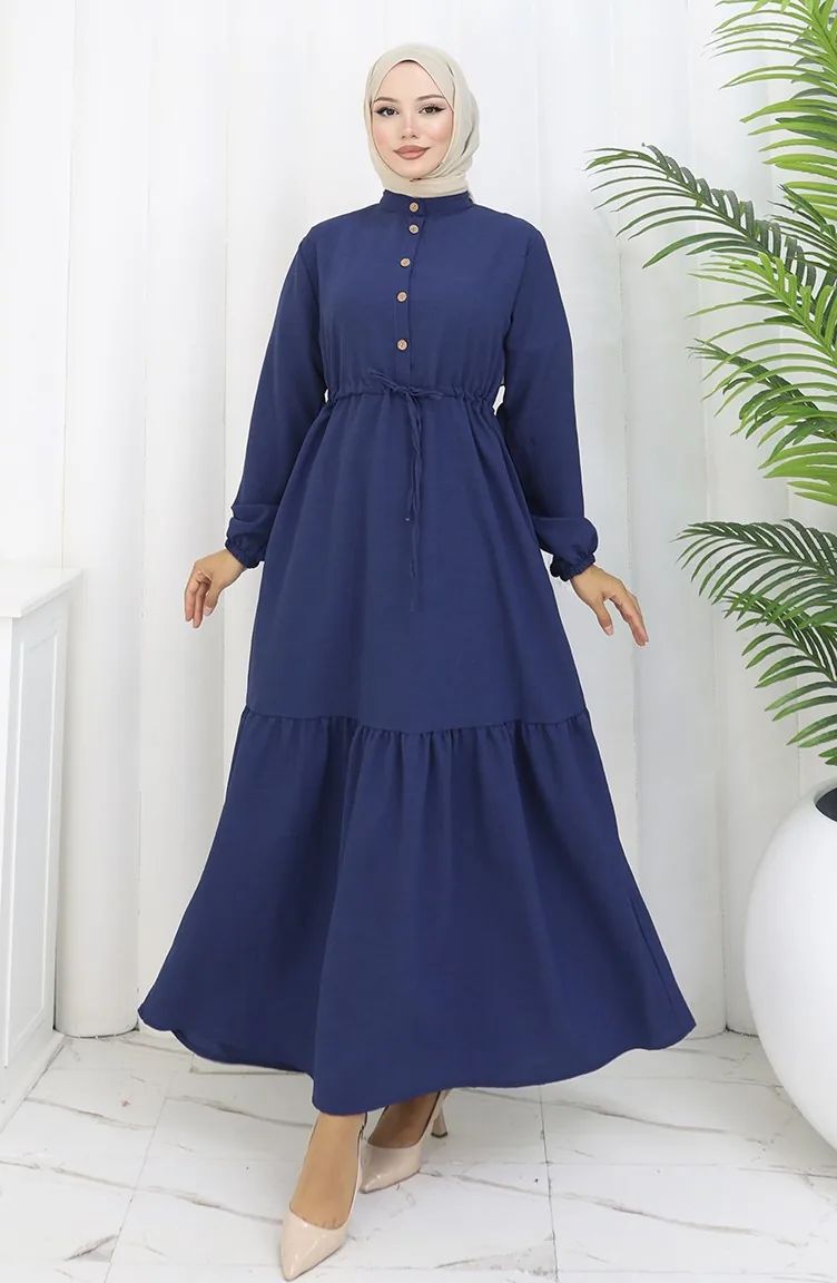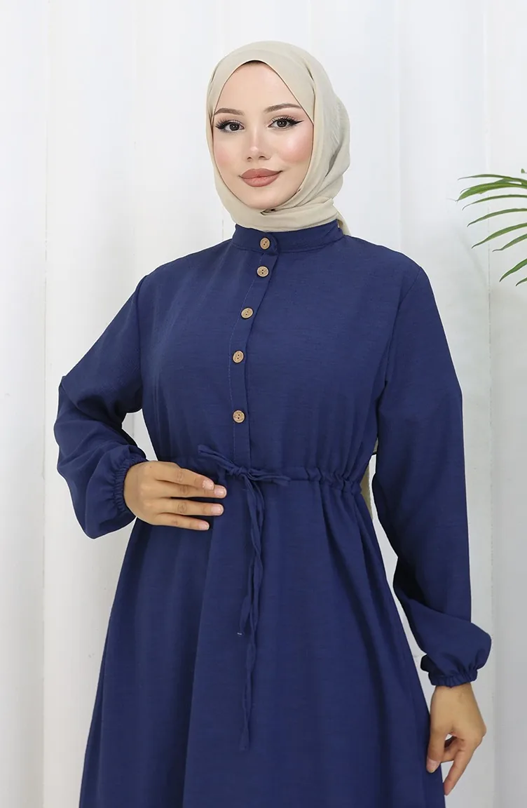 فستان نصف أزرار مع ربطة عند الخصر 0182-07 أزرق غامق 0182-07