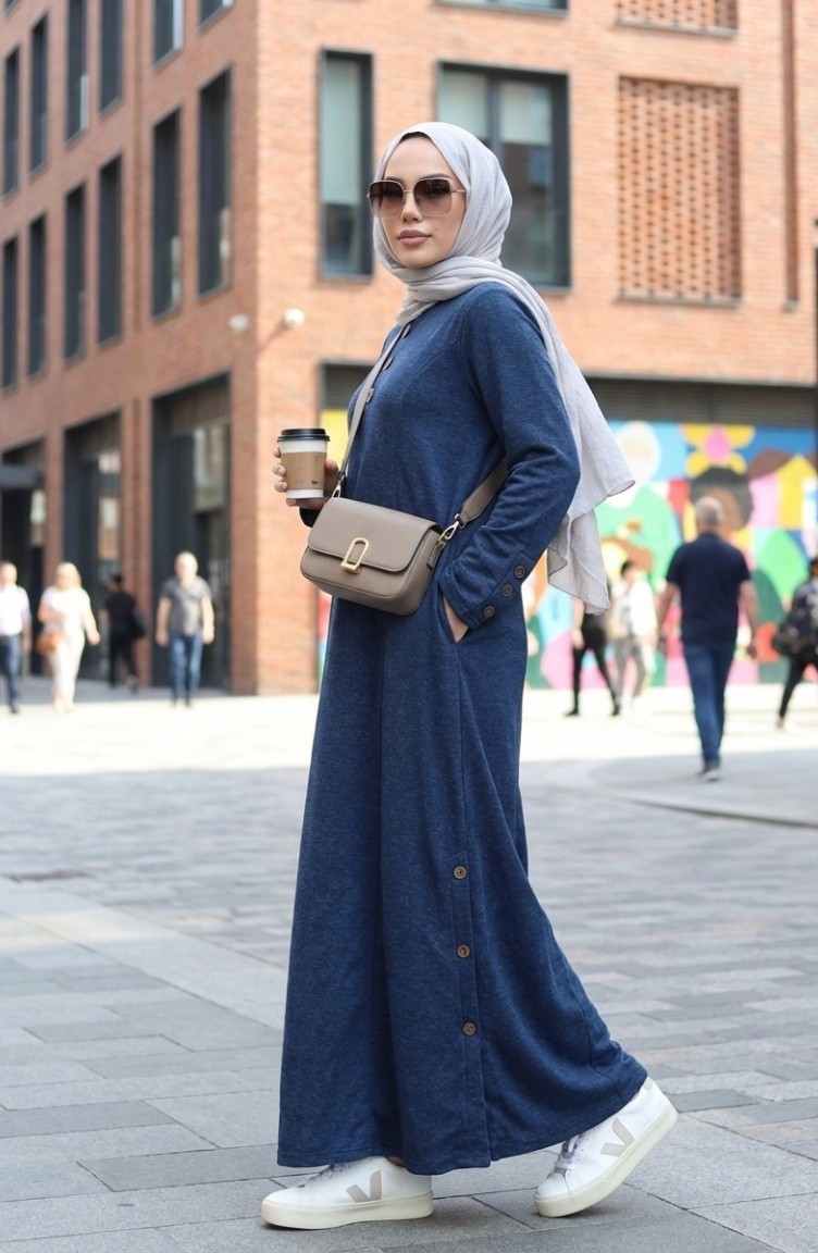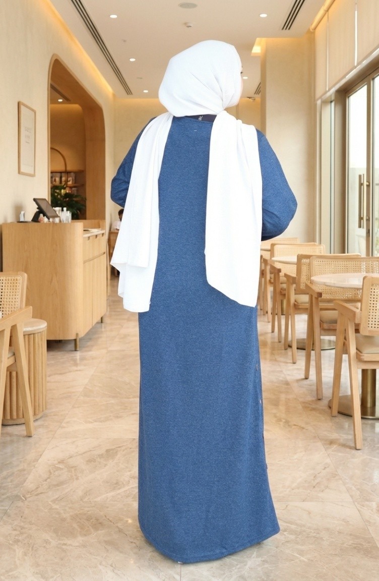 فستان شتوي محتشم من قماش محبوك مزين بأزرار، رقم الموديل 2183-01، لون كحلي 2183-01