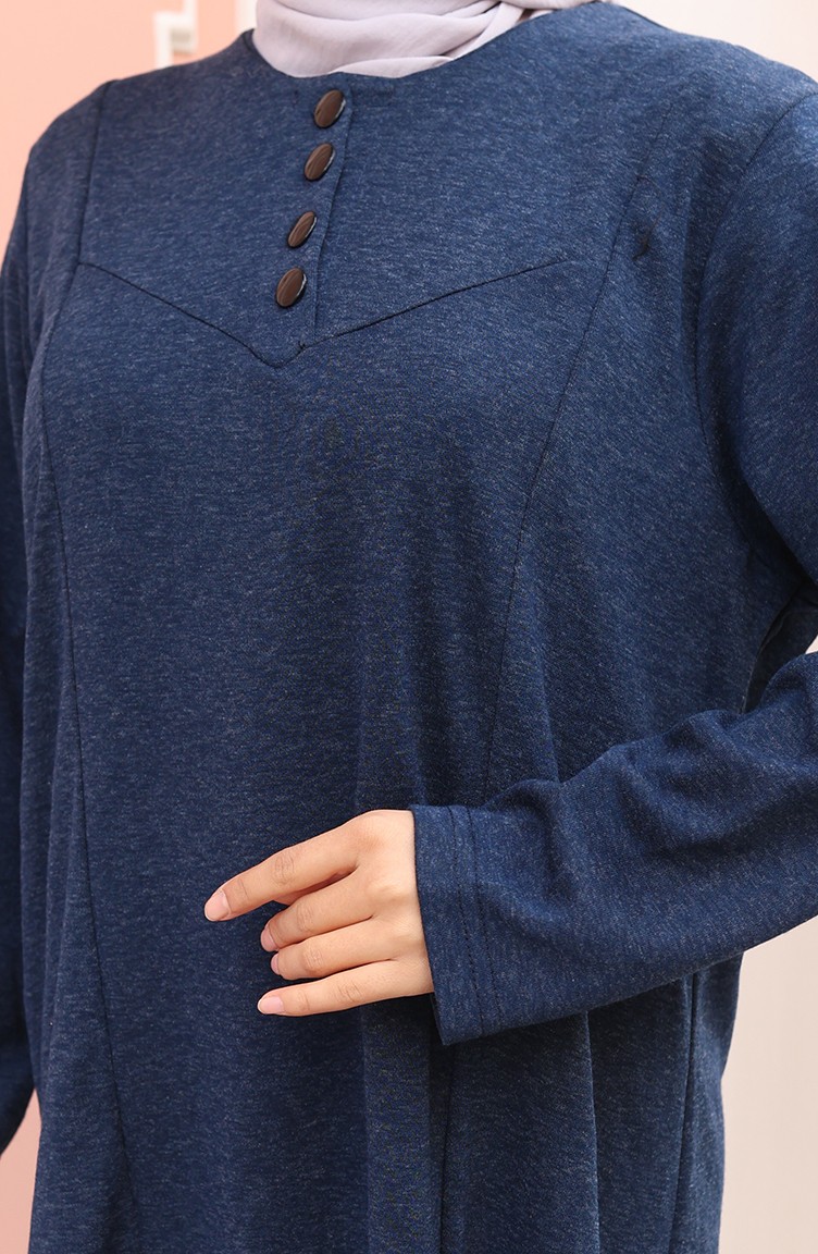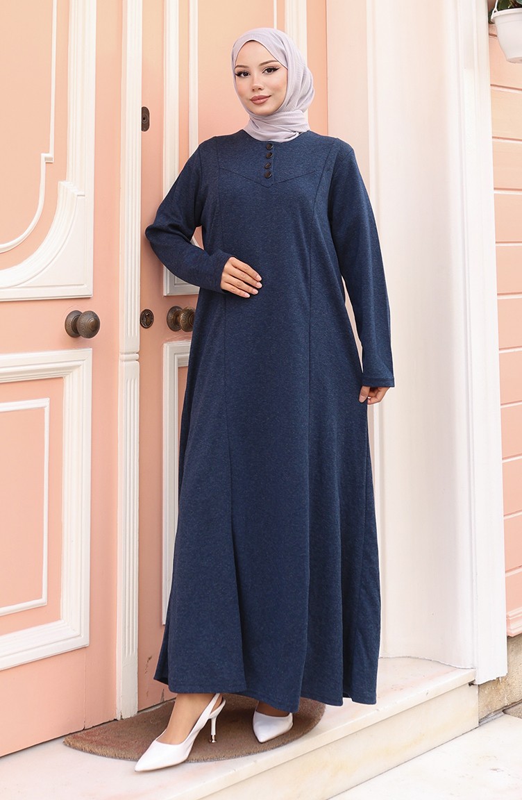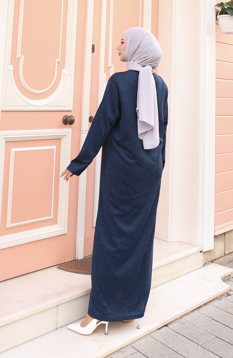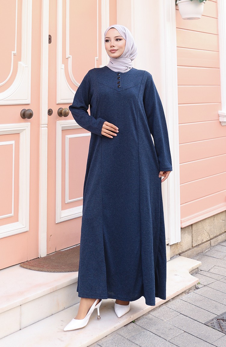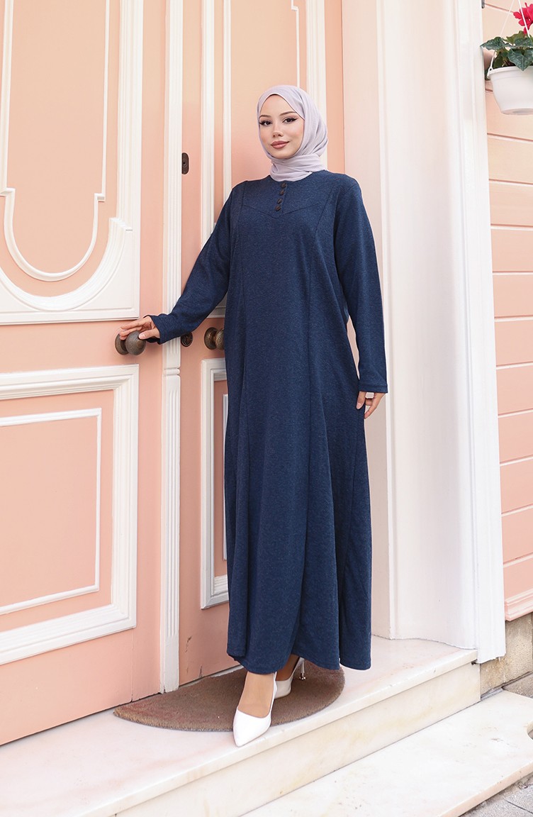 فستان حجاب شتوي محبوك بأزرار وتفاصيل 2184-05 أزرق داكن 2184-05