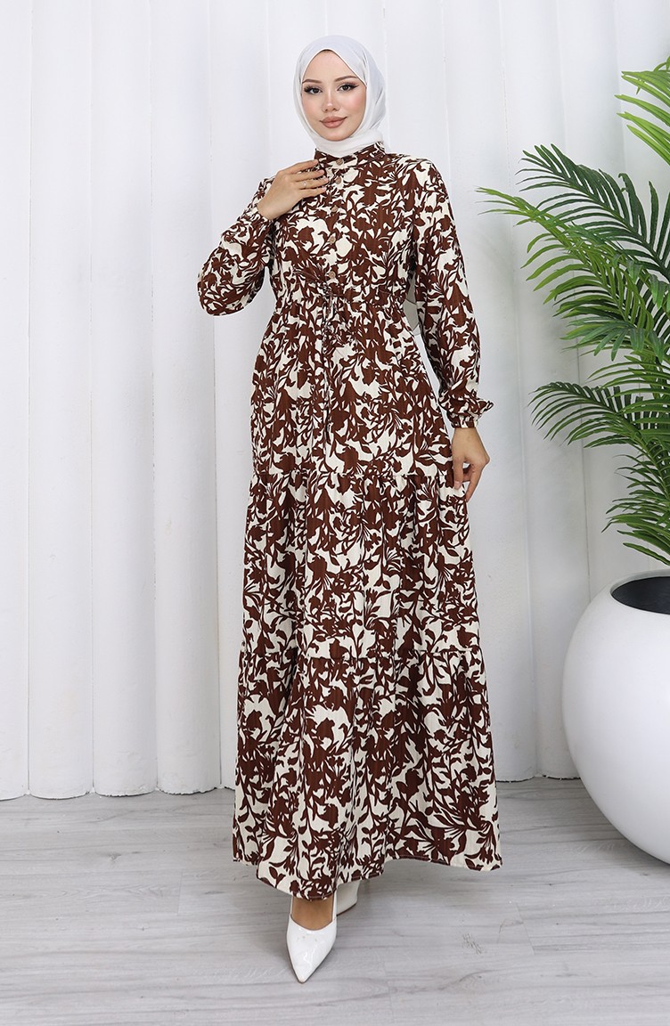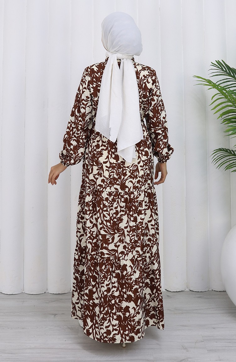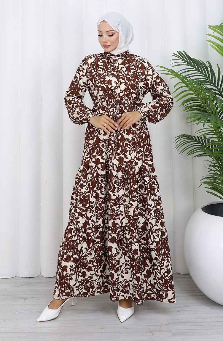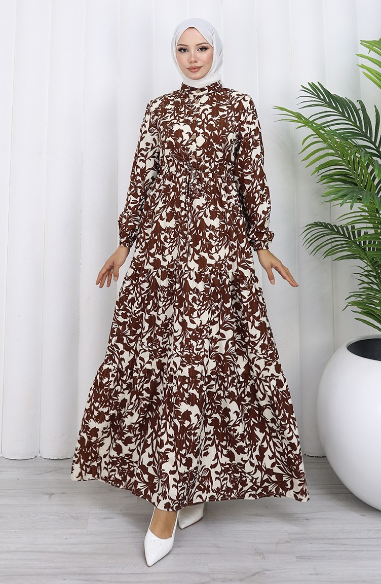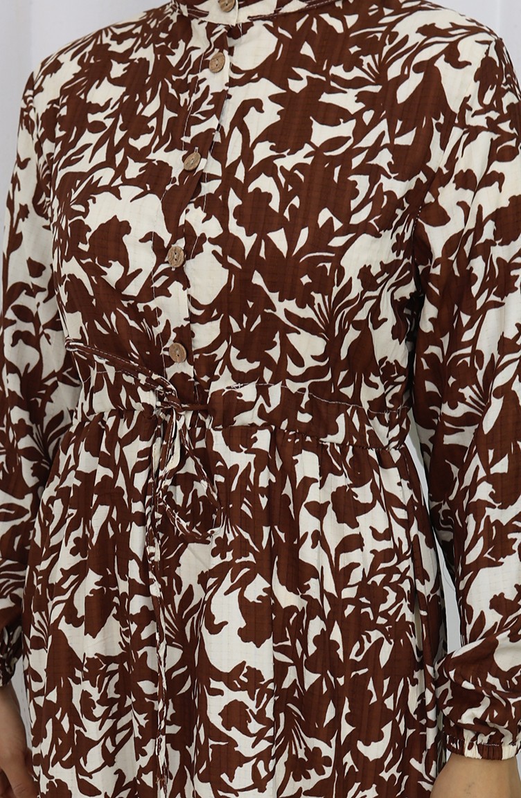 فستان منقوش بياقة ماندرين وخصر مربوط 0190-03 بني 0190-03