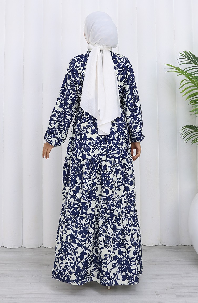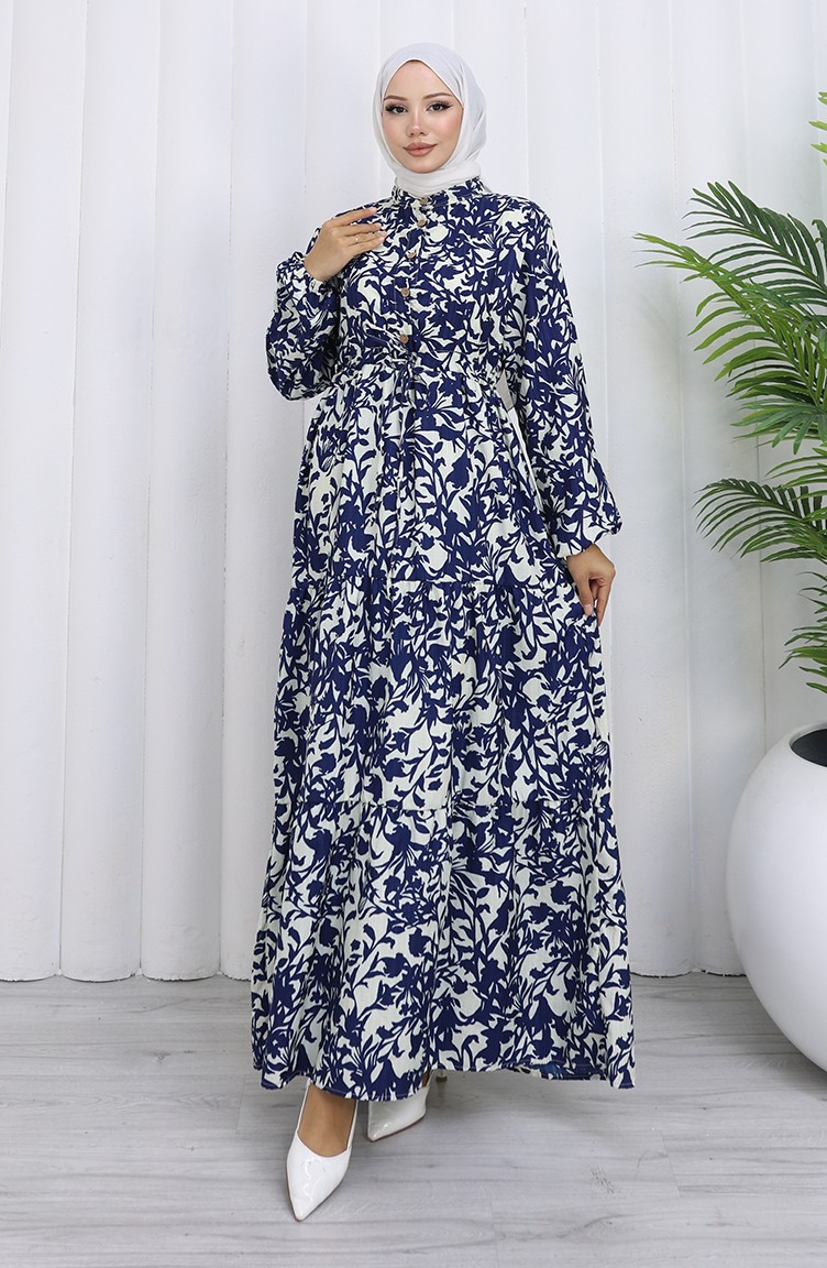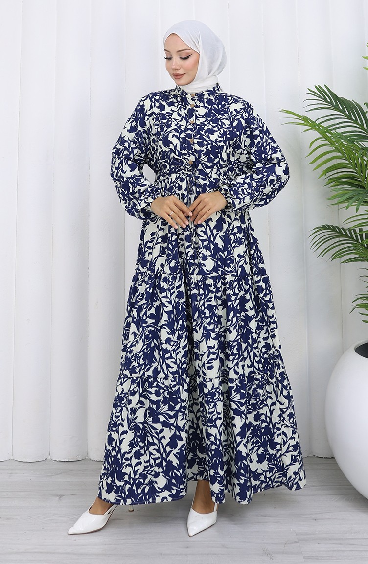 فستان منقوش بياقة ماندرين وخصر مربوط 0190-04 أزرق داكن 0190-04