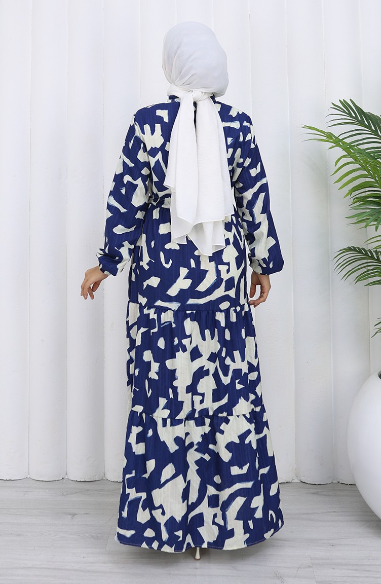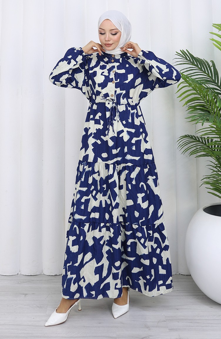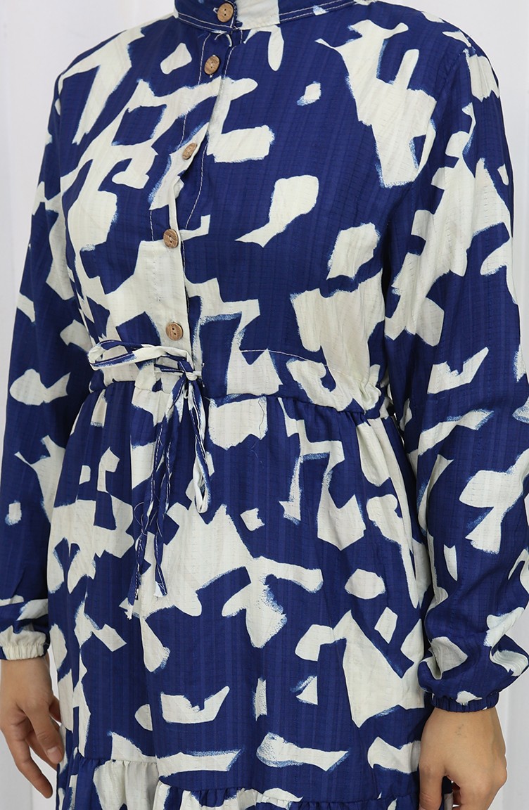 فستان منقوش بياقة ماندرين وخصر مربوط 0191-02 أزرق داكن 0191-02