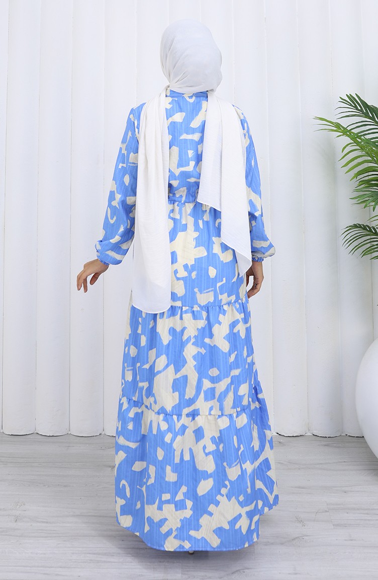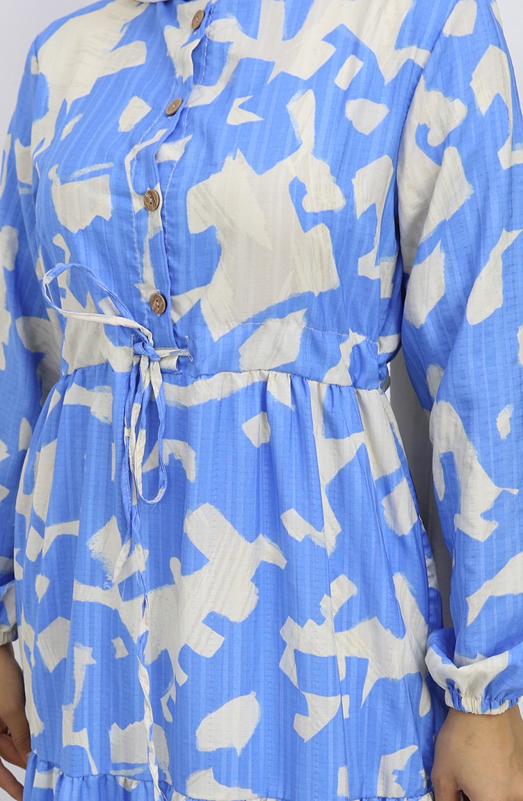 فستان منقوش بياقة صينية وخصر مربوط 0191-03 نيلي 0191-03