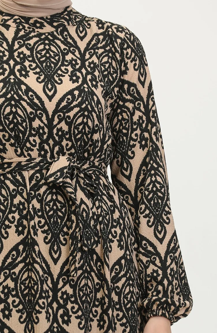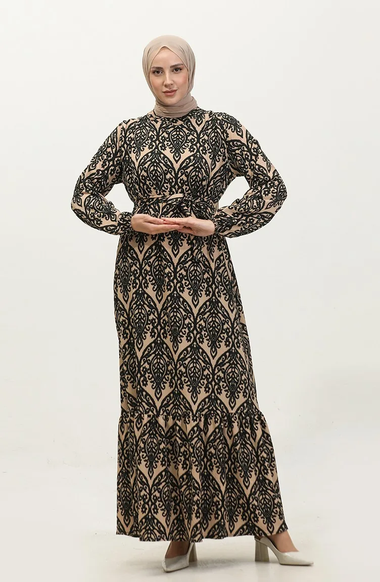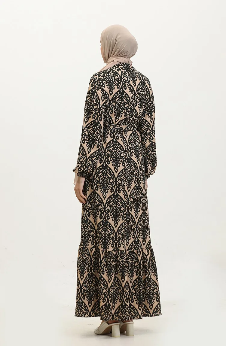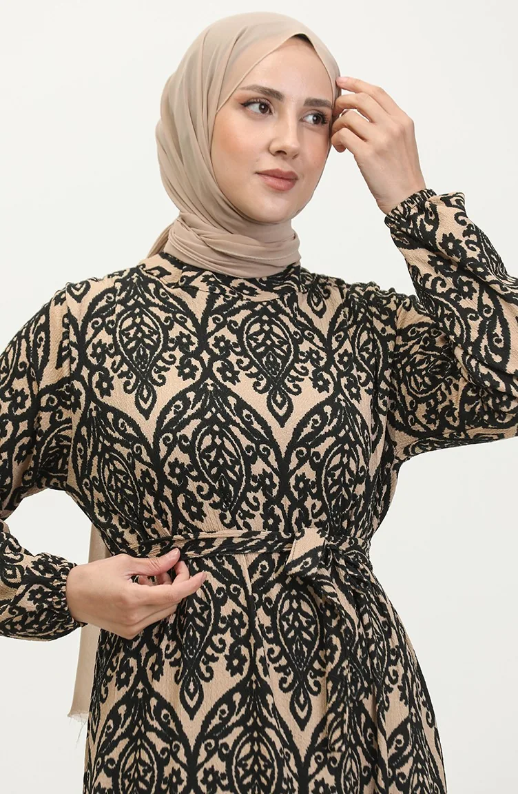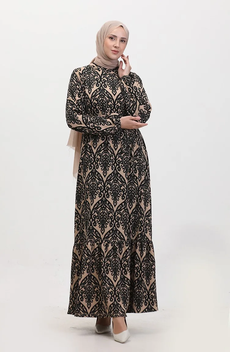 فستان فيسكوز منقوش 0348-03 بني فاتح أسود 0348-03