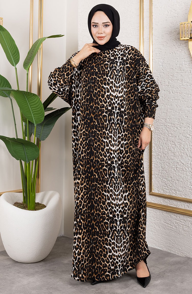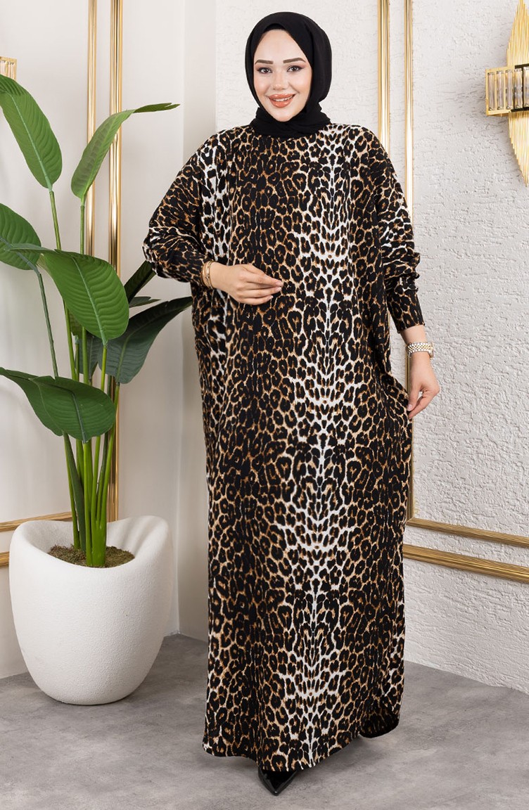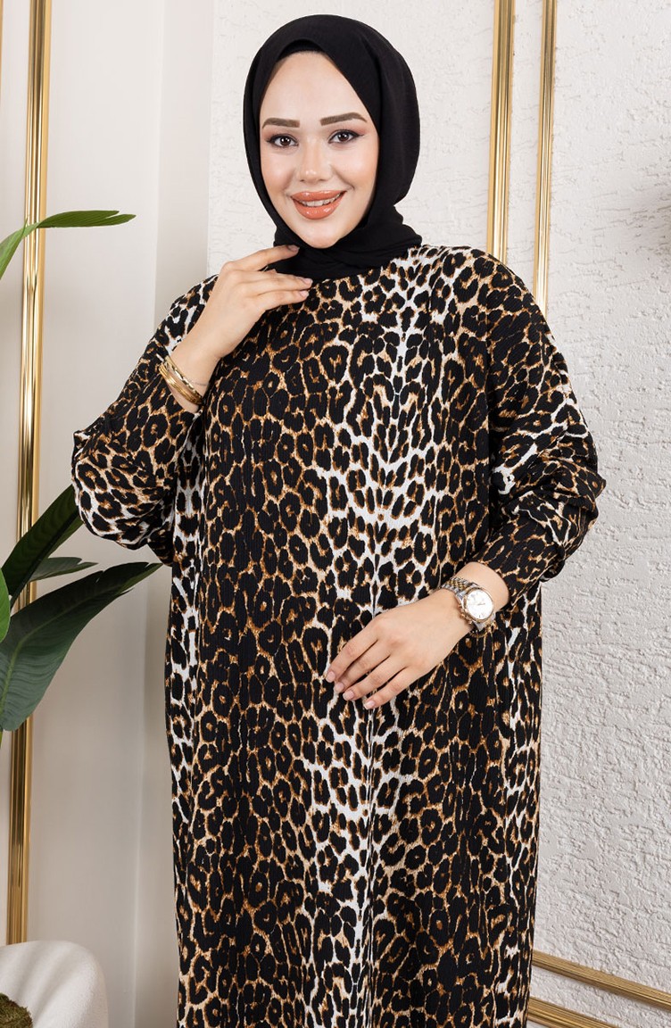 فستان كريب منقوش 7137-05 أسود بني 7137-05