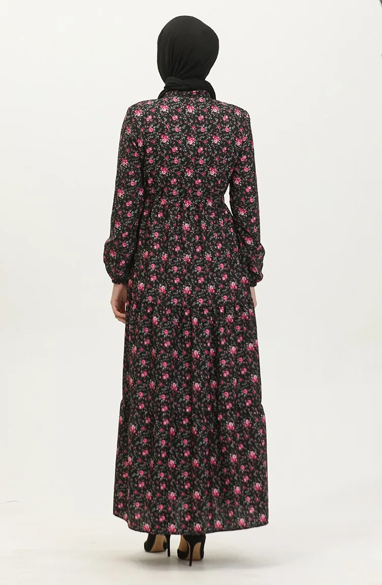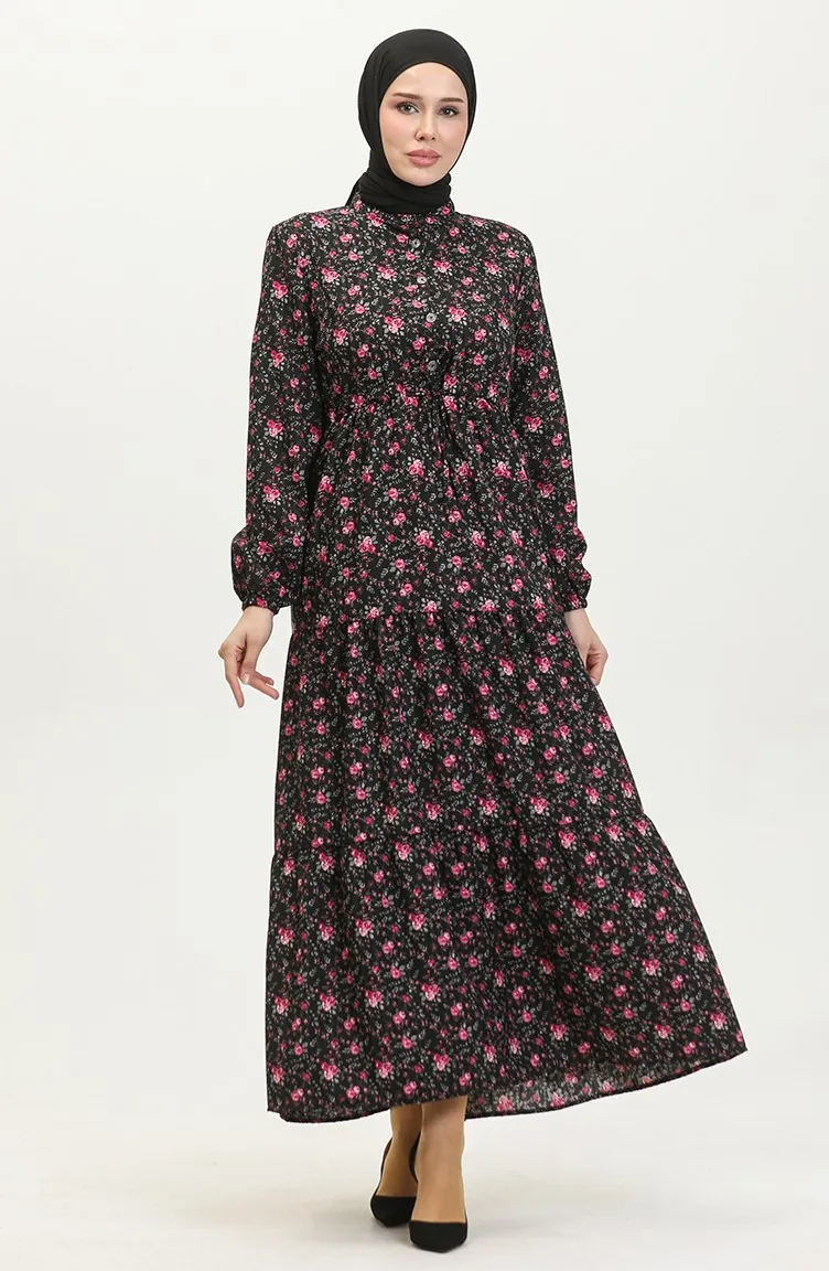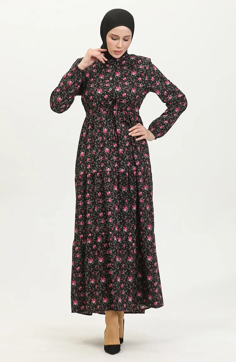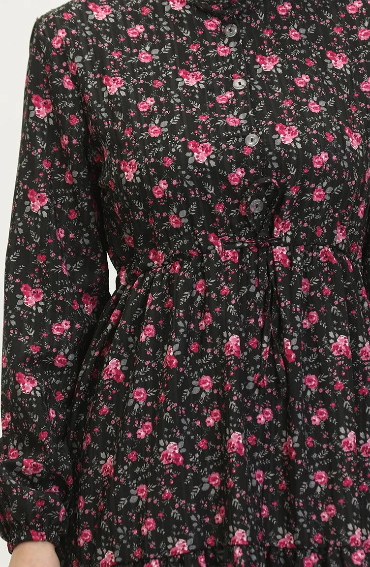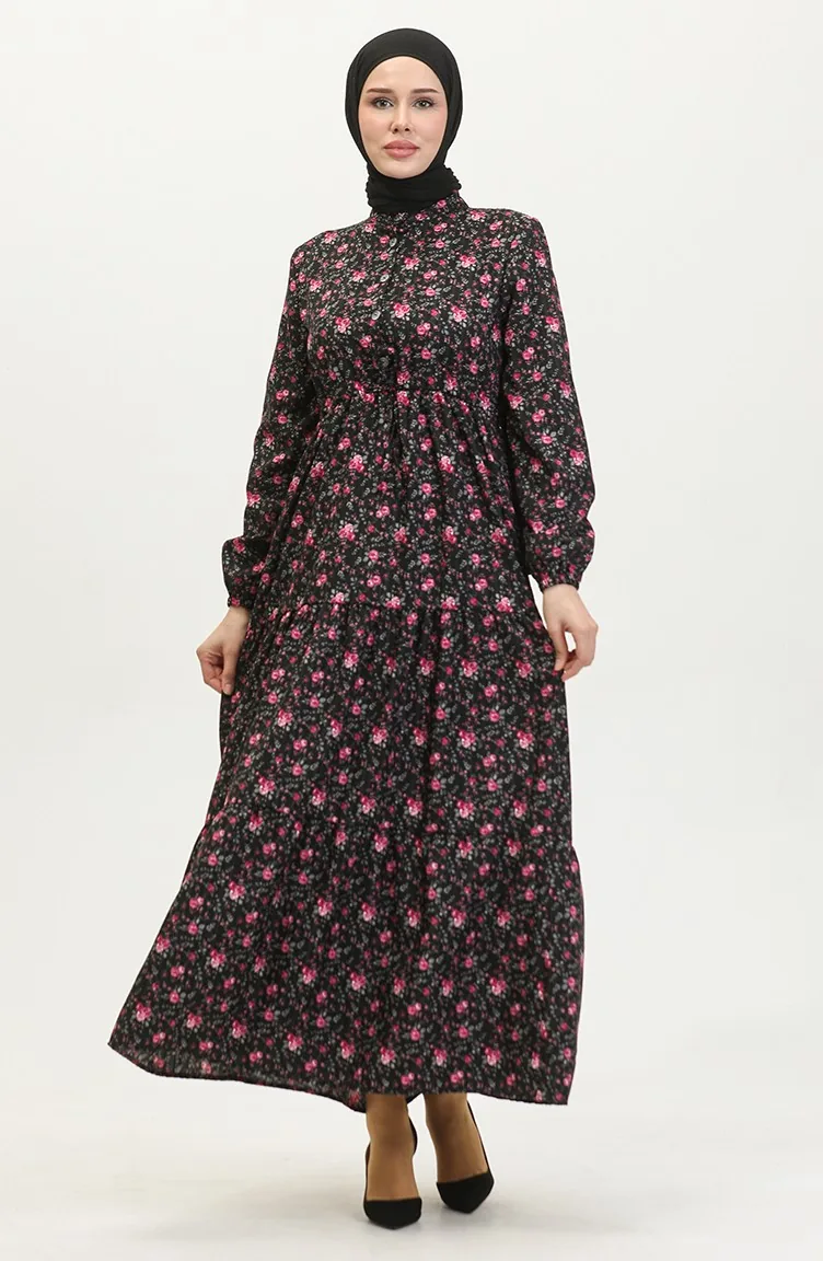 فستان بنقش أزهار 0401-01 أسود 0401-01