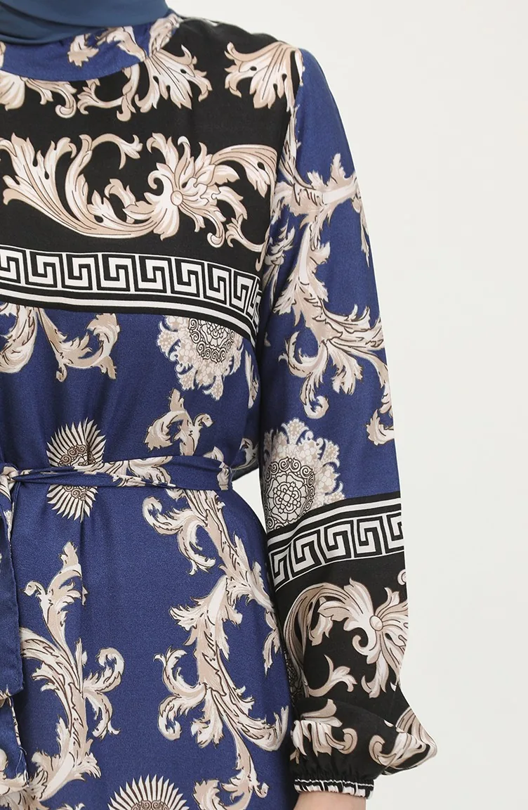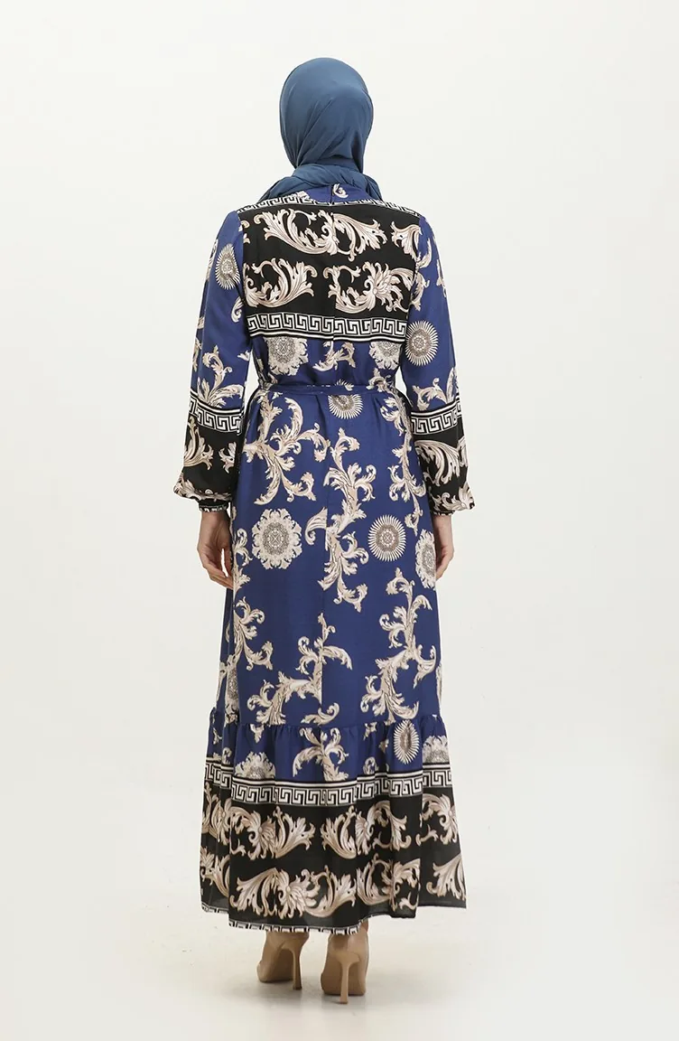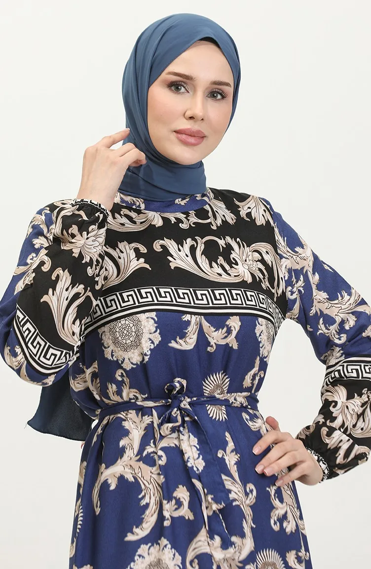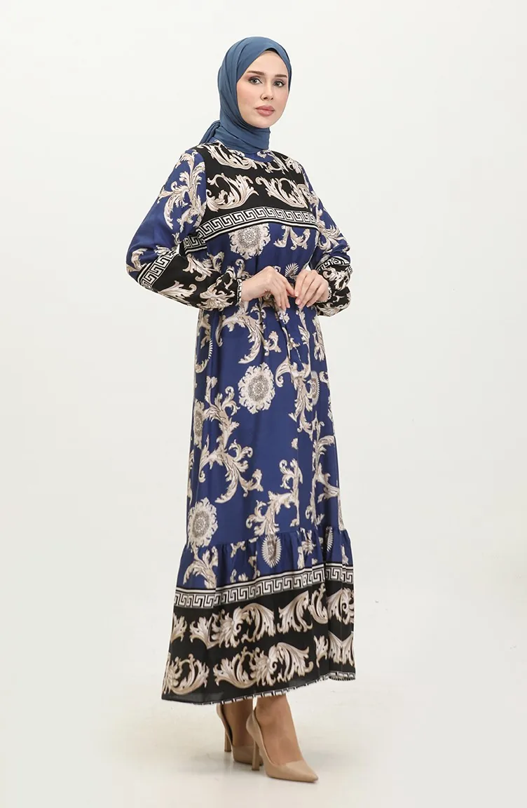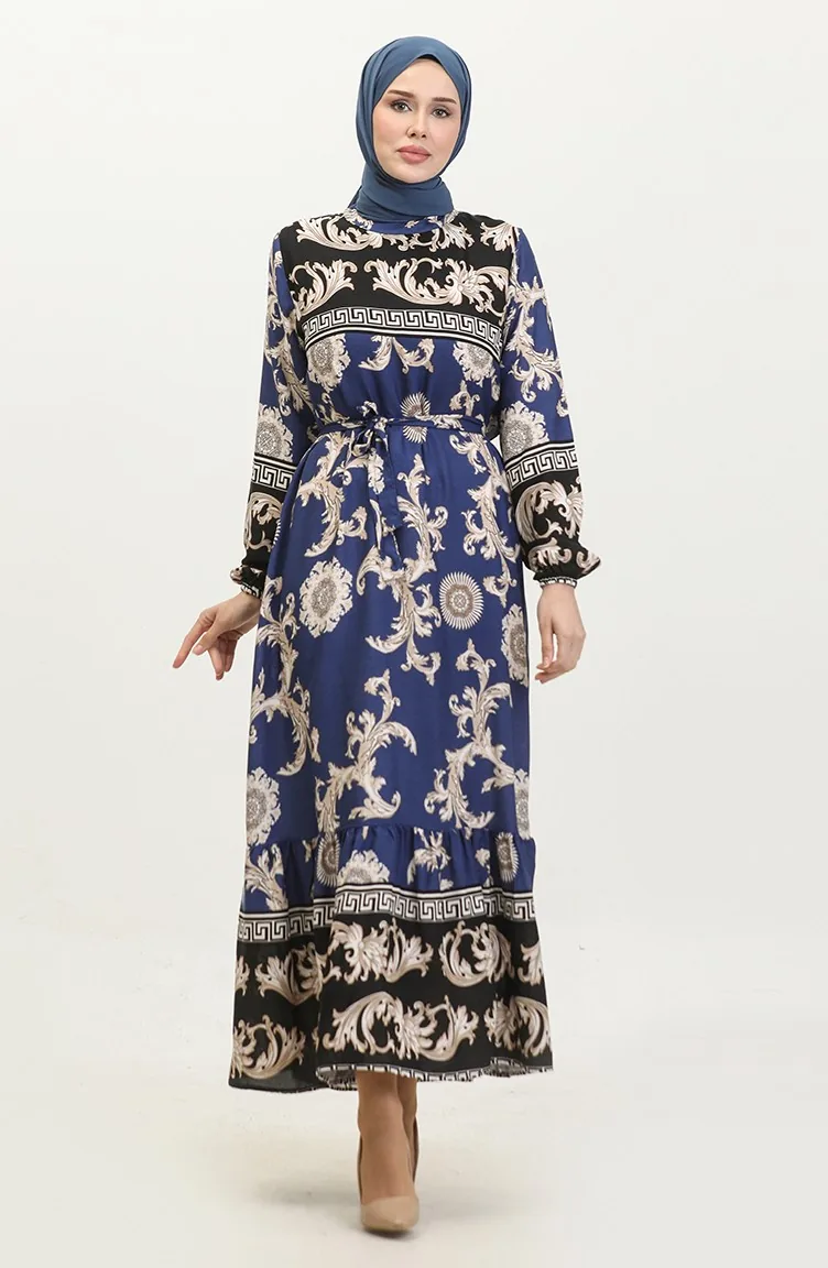 فستان منقوش للمحجبات 0377-03 أسود كحلي 0377-03