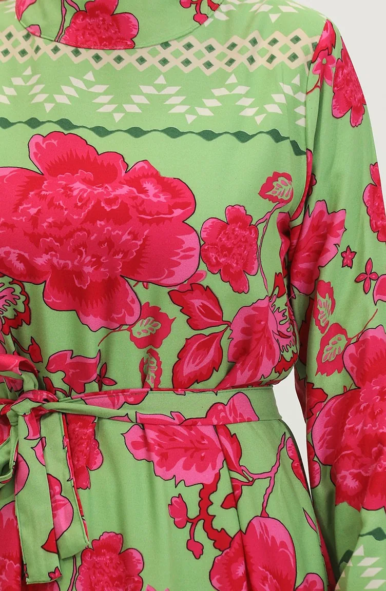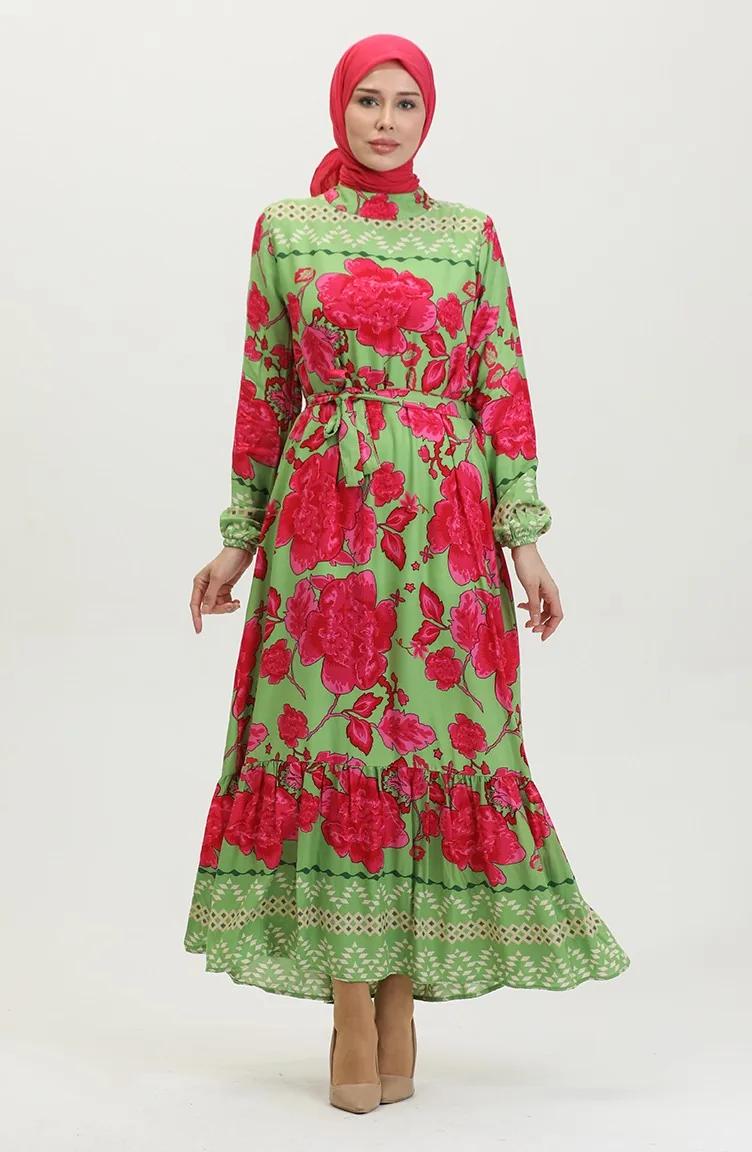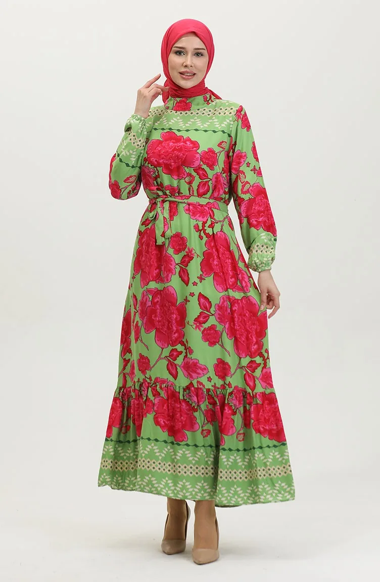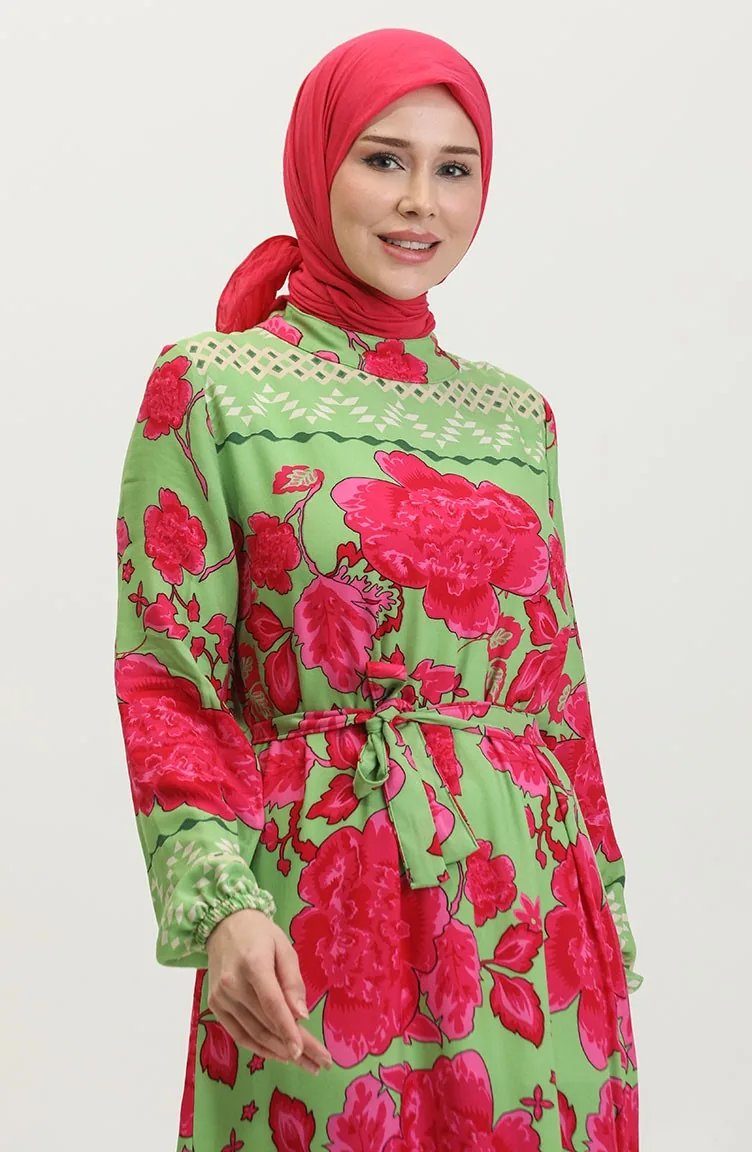 فستان فيسكوز منقوش بحزام 0386-04 أخضر مينت 0386-04