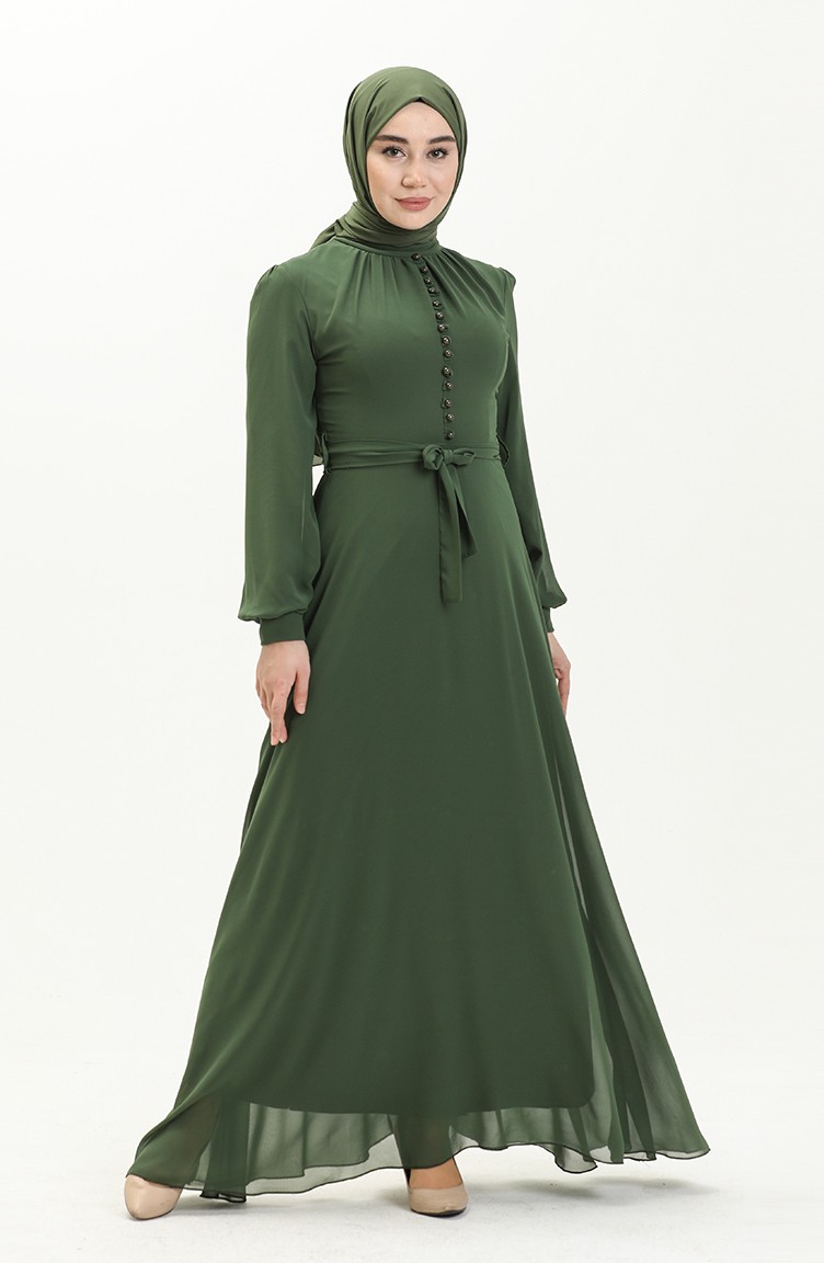 ذو لون الحشيشي. قماش الشيفون نسيج شفاف و خفيف. ذو مظهر سادة. تستخدم في الأقمشة الرقيقة لمنع المخايلة. المنتج طويلة الأكمام. استعمل فيها الياقة الدائرية. مناسب لجميع المواسم. هناك مقاسات كبيرة.