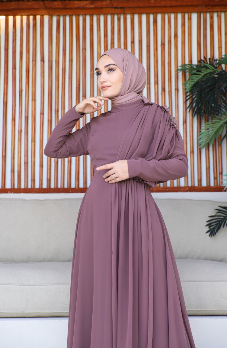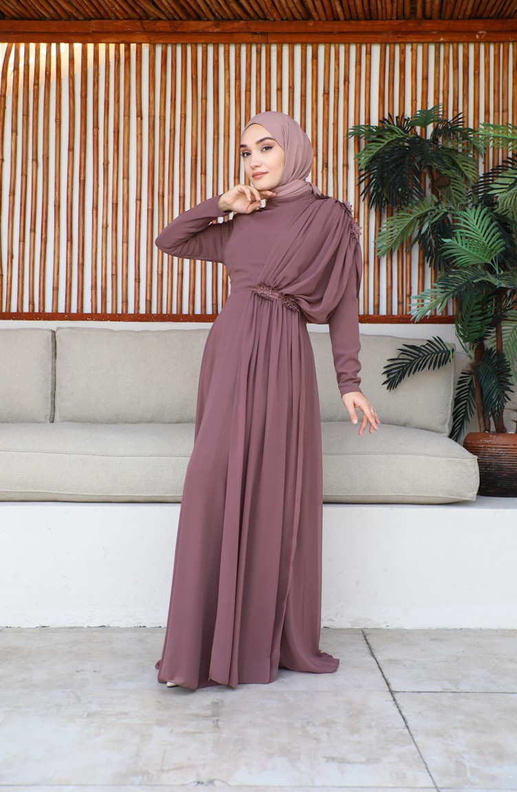 فستان سهرة شيفون بدانتيل 5571-01 وردي فاتح 5571-01