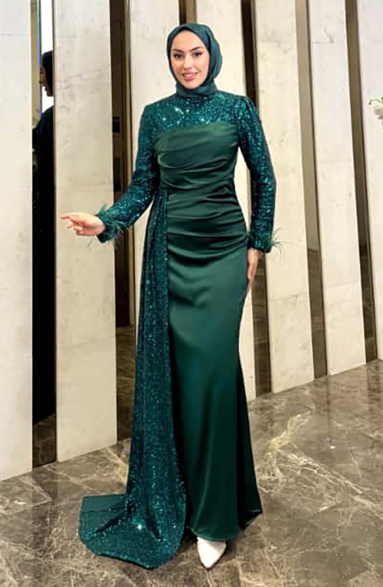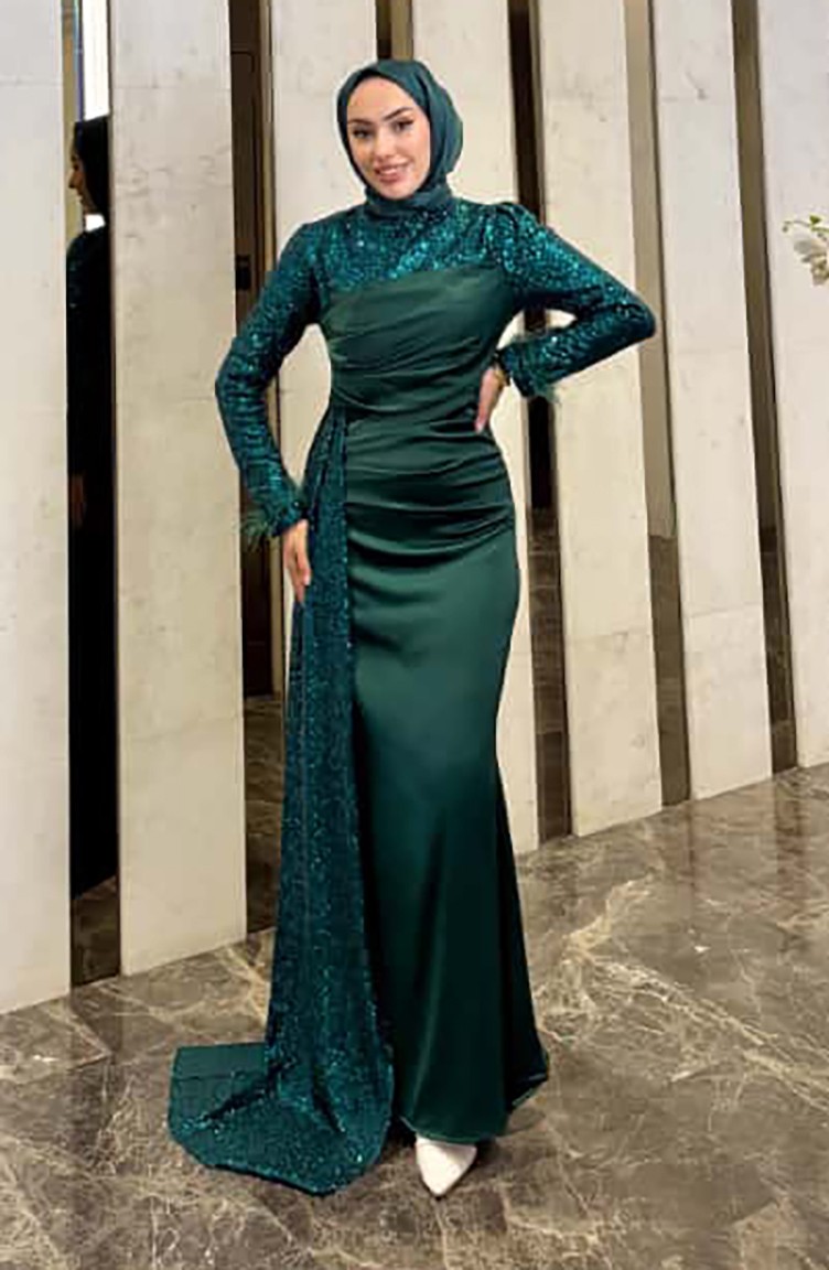 فستان سهرة ساتان لامع 4667-03 أخضر زمردي 4667-03