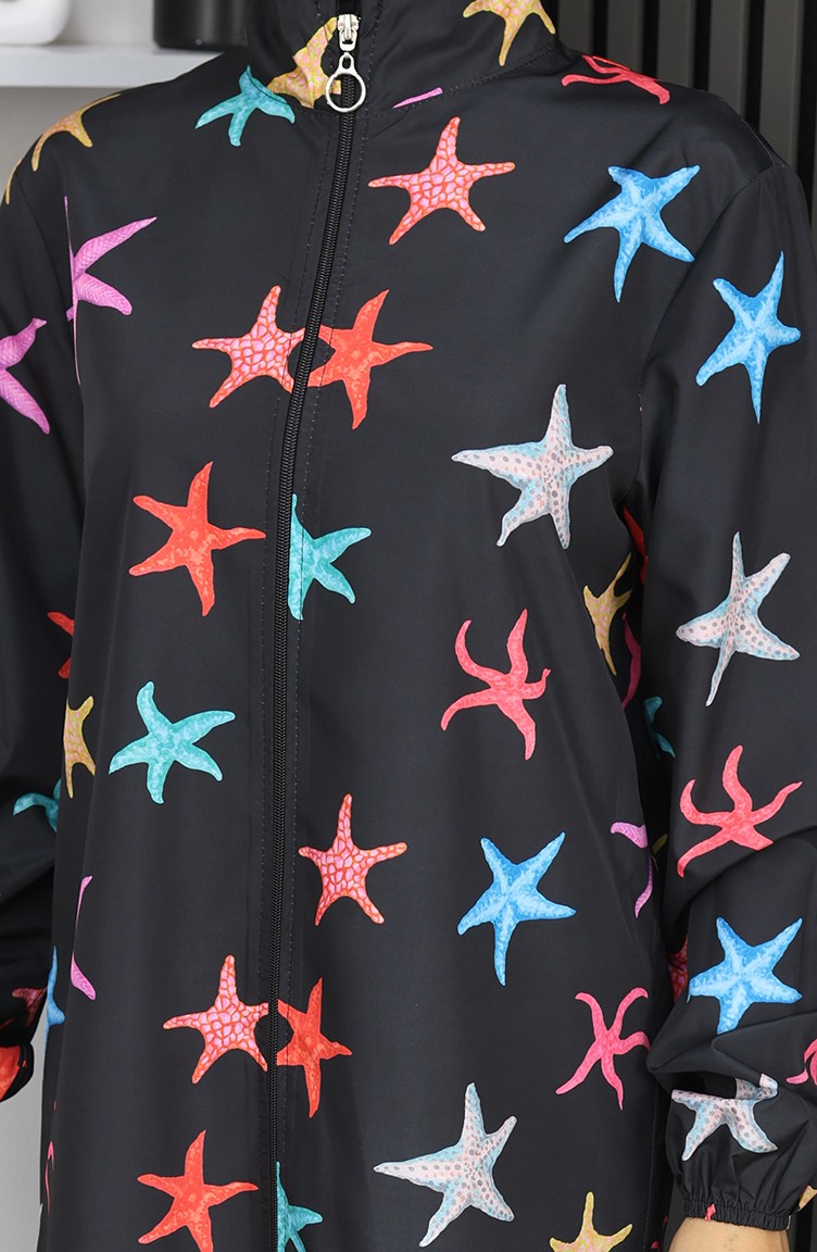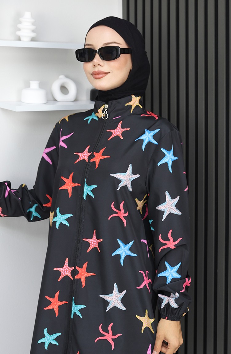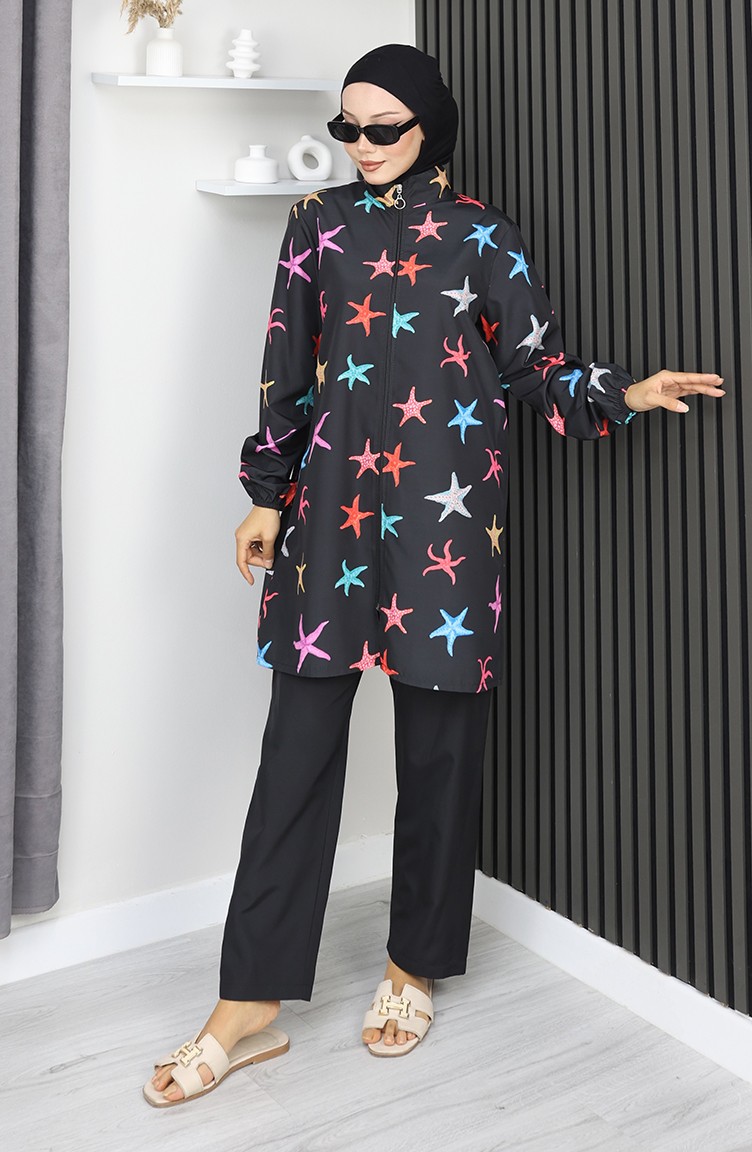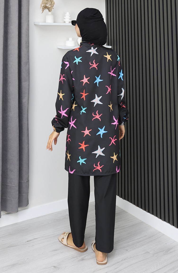 طقم ملابس سباحة محجبات بنقشة نجمة البحر، مكون من 3 قطع، 1903-06، أسود فيروزي 1903-06