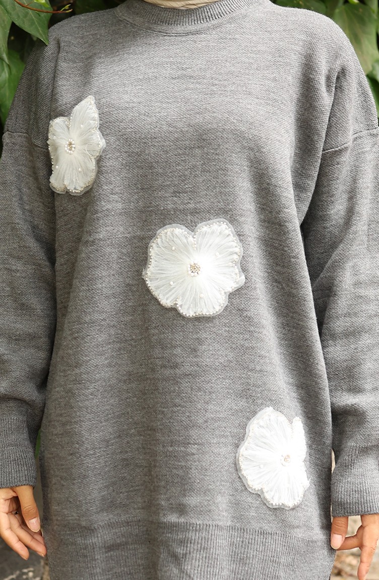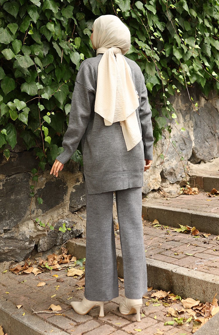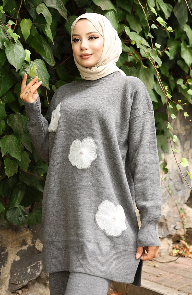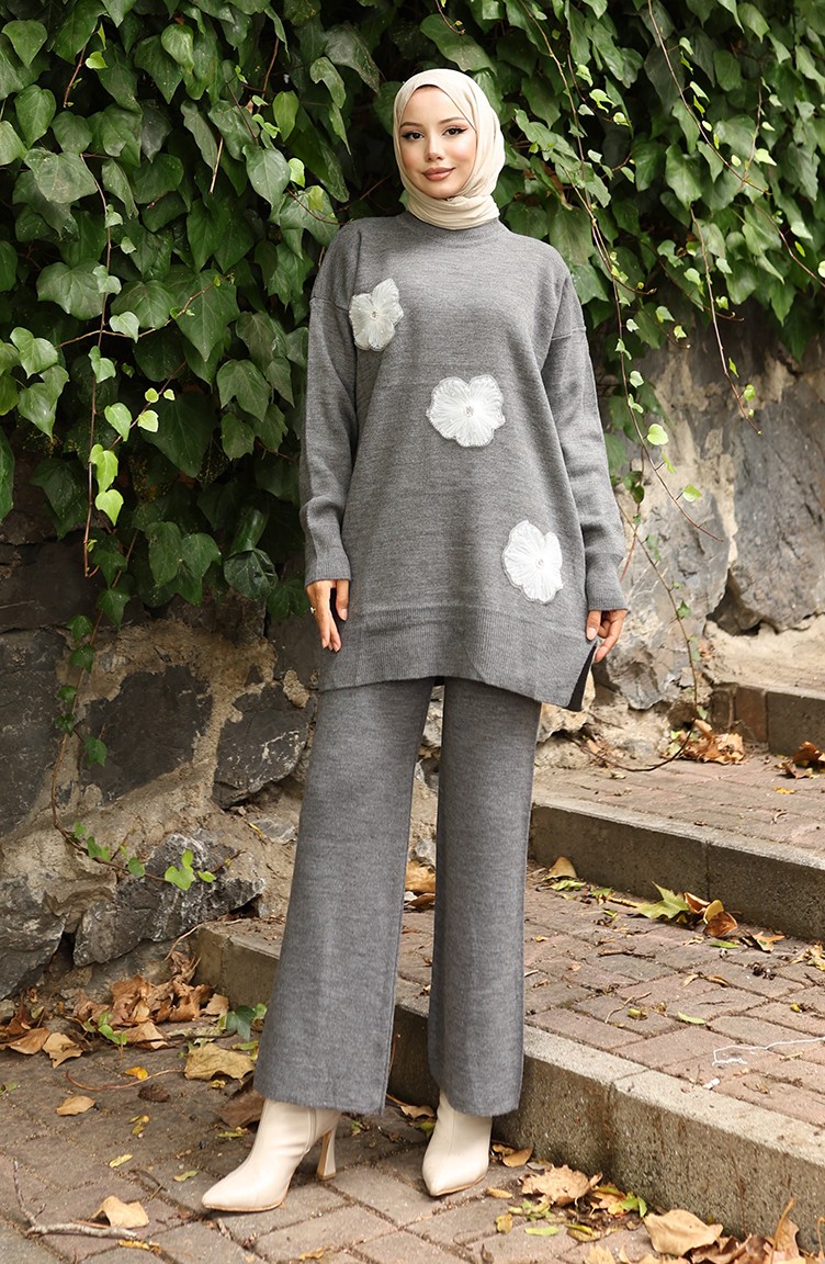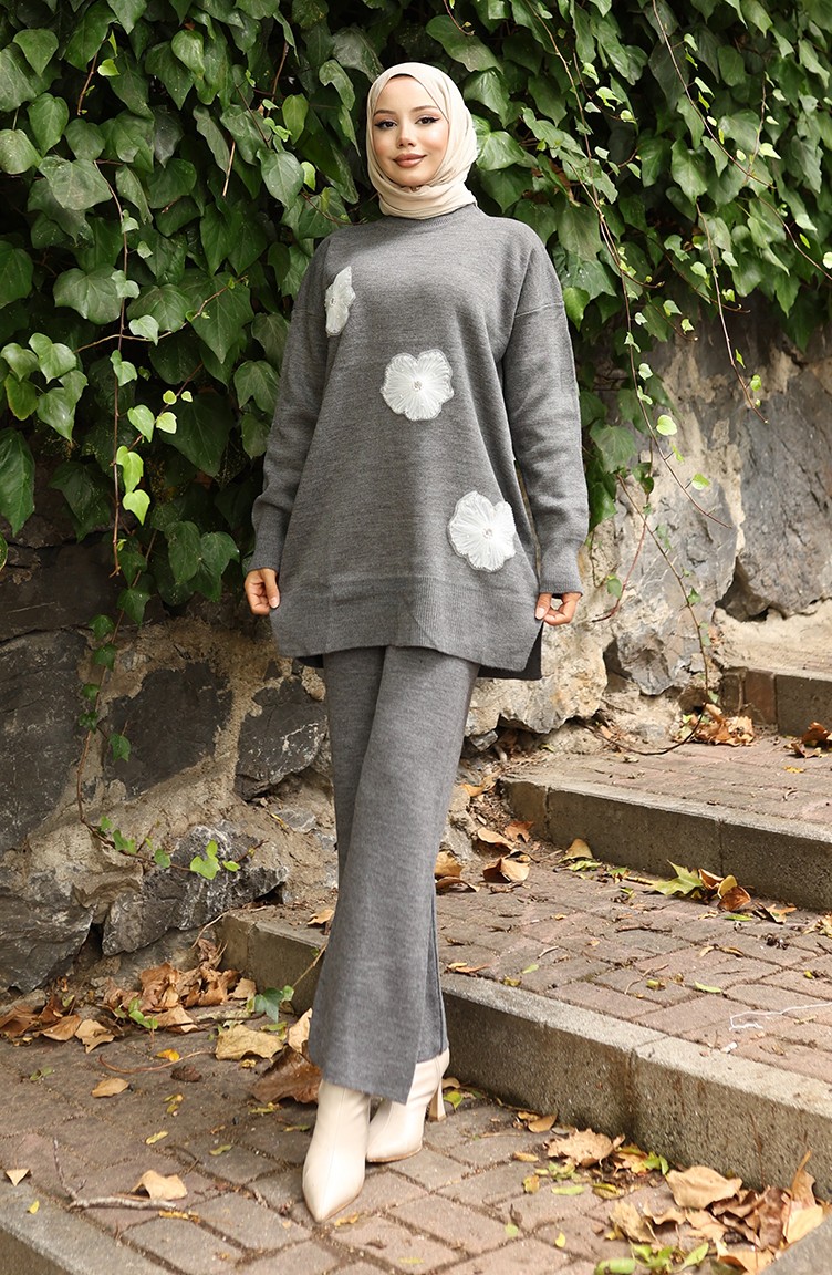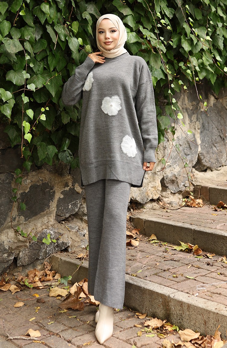 بدلة من قطعتين، بنطلون وقميص محبوك مطرز بالخرز، 1016-04 رمادي 1016-04