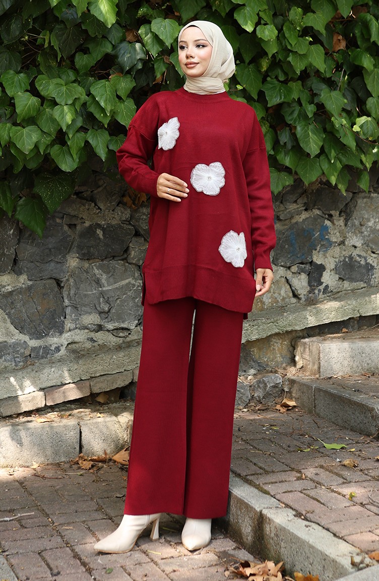 بدلة من قطعتين، بنطال وقميص محبوك مطرز بالخرز، لون أحمر قرمزي، 1016-05 1016-05