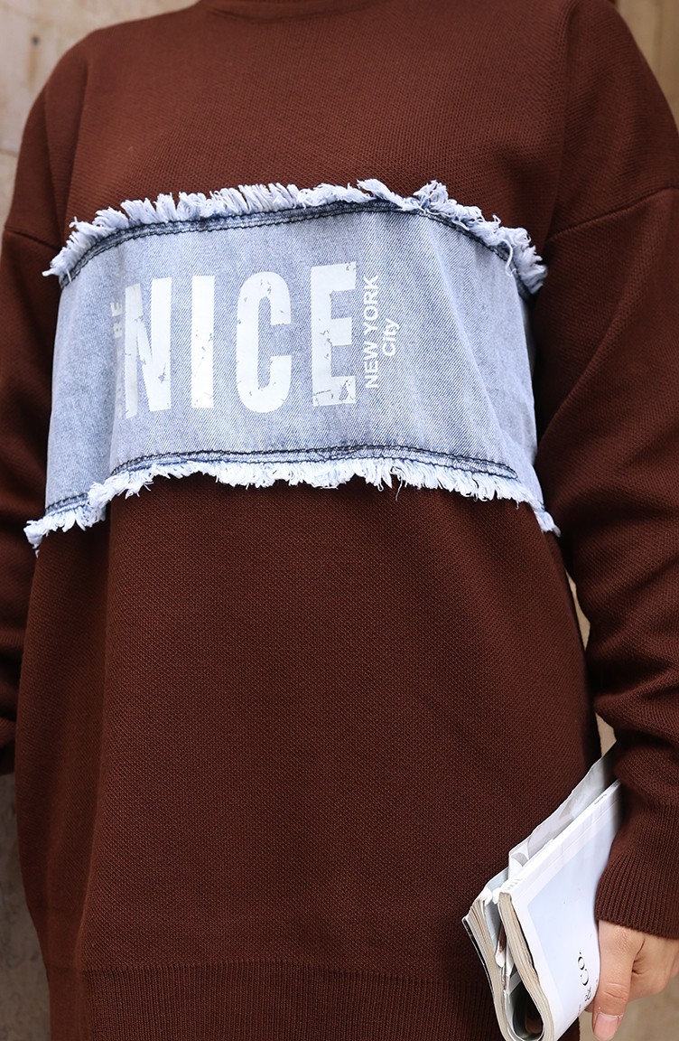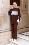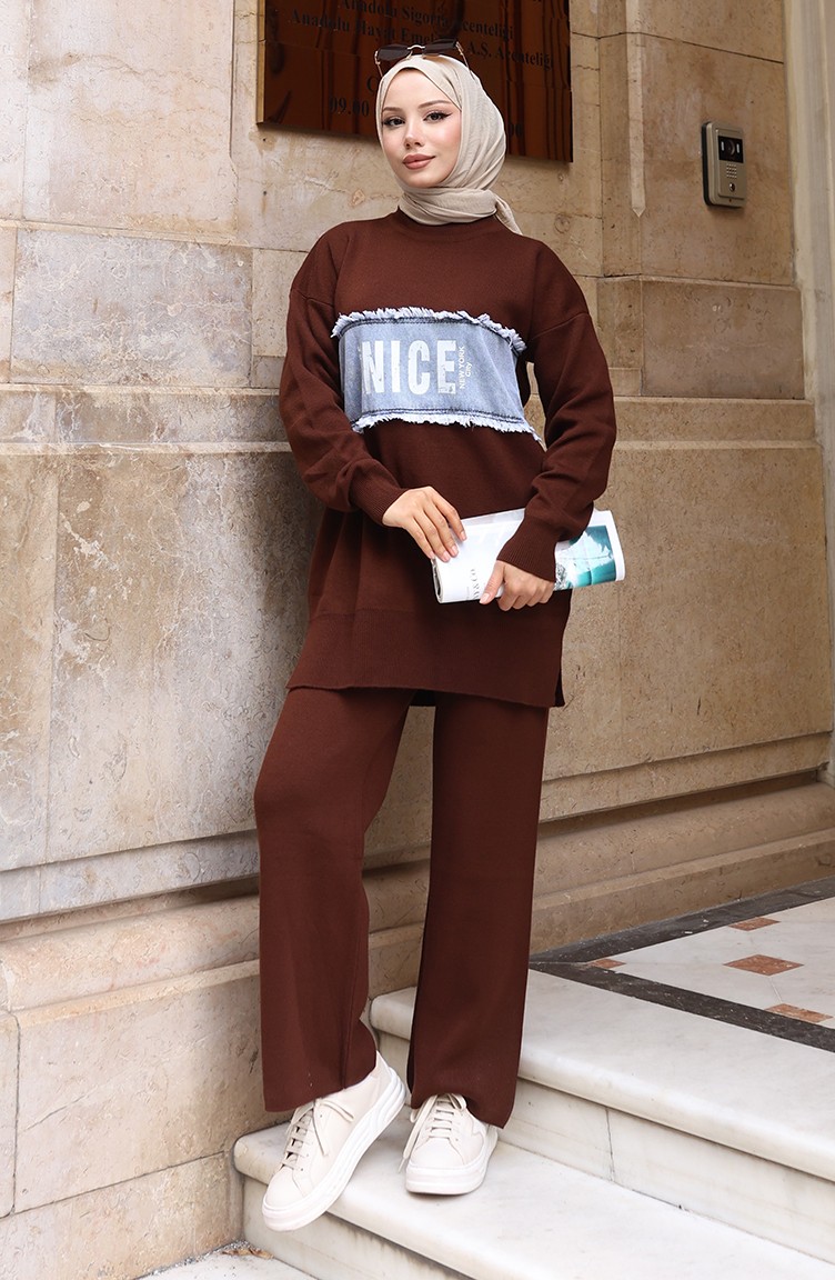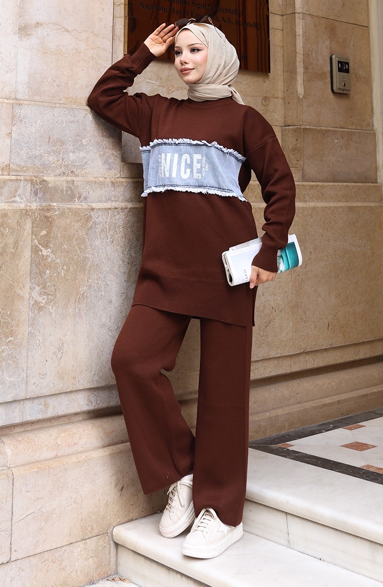 طقم تونيك وبنطلون جينز محبوك من قطعتين، 1094-06 بني 1094-06