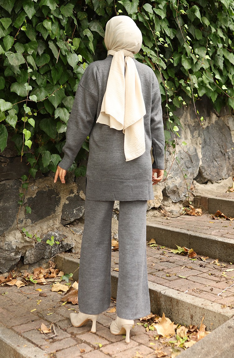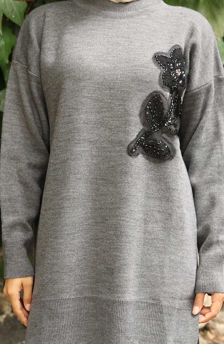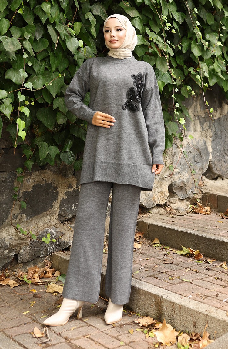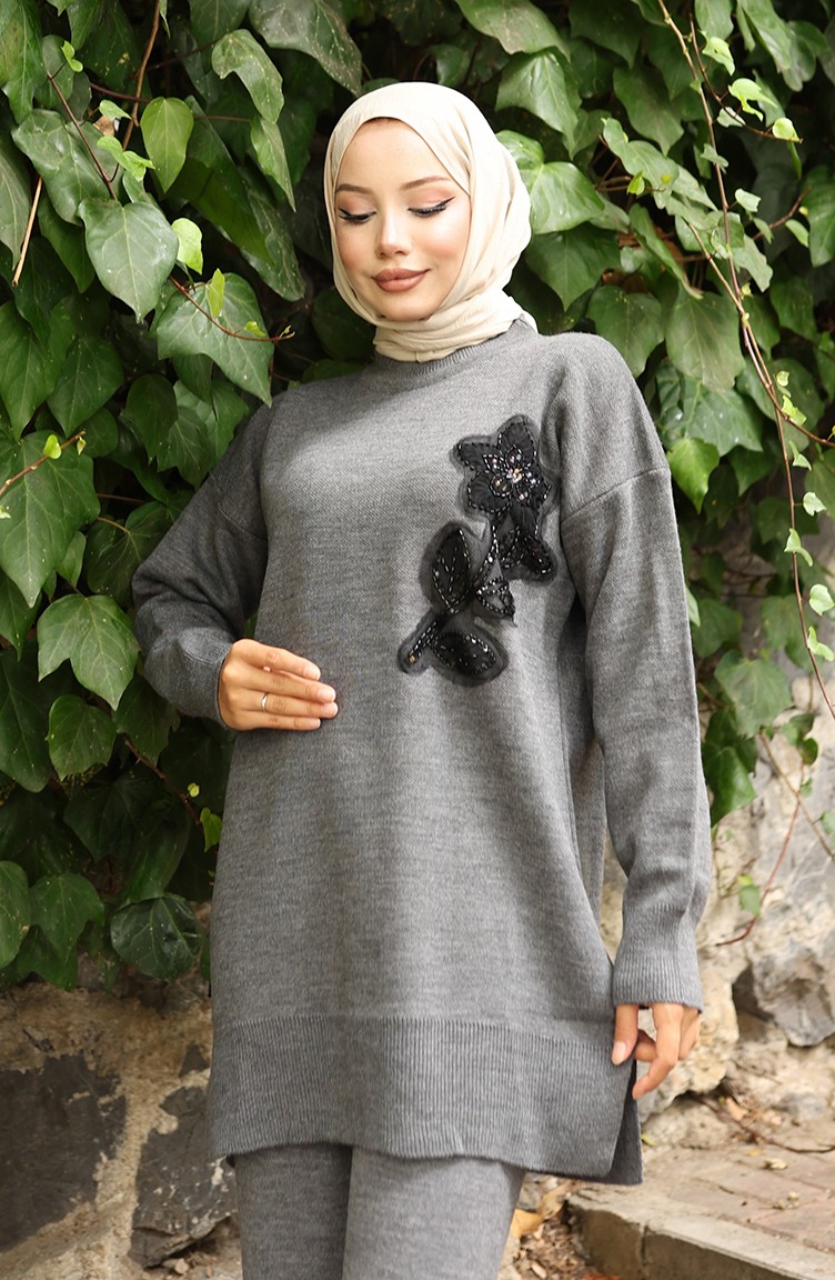 بدلة من قطعتين، بنطال وقميص محبوك مطرز بالورود، 1067-01 رمادي 1067-01