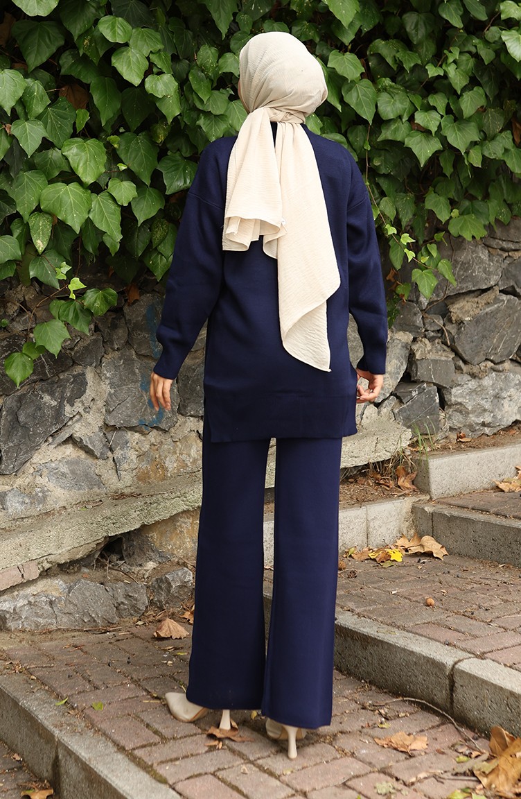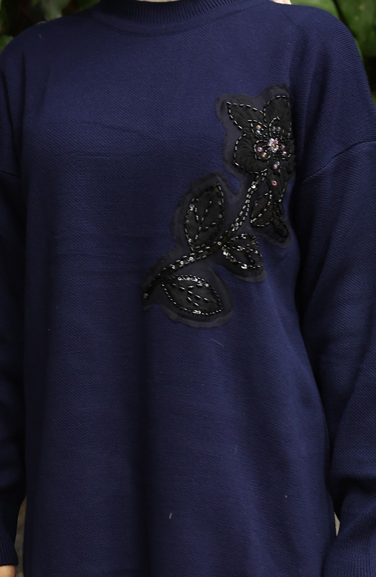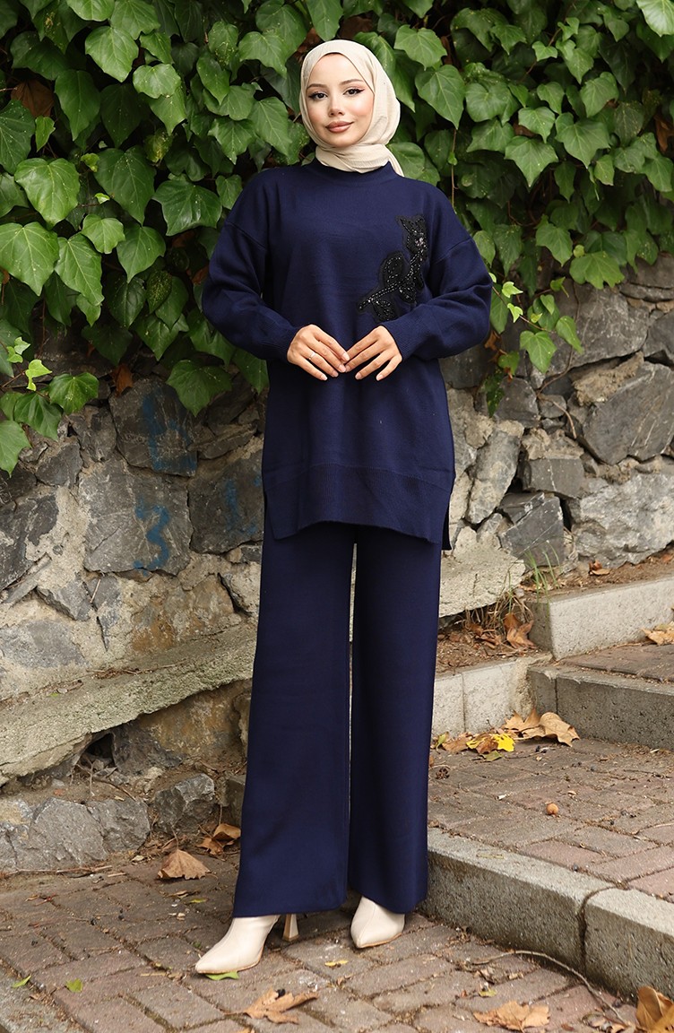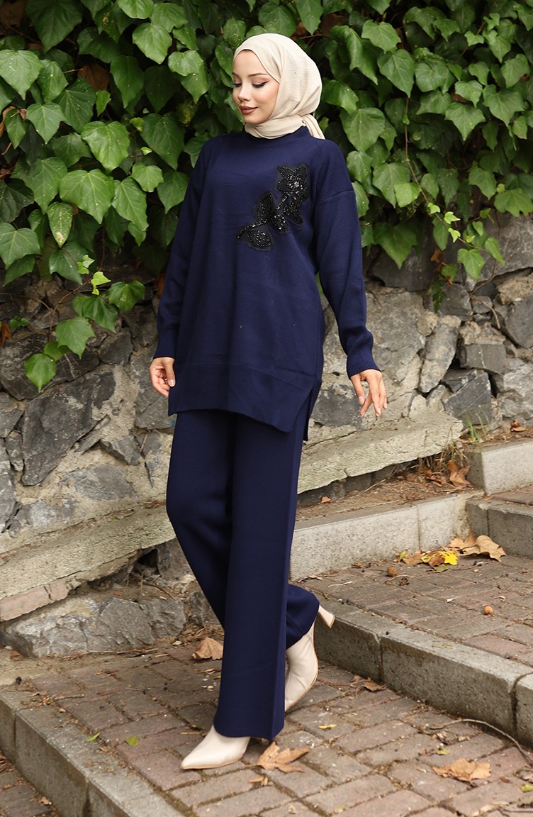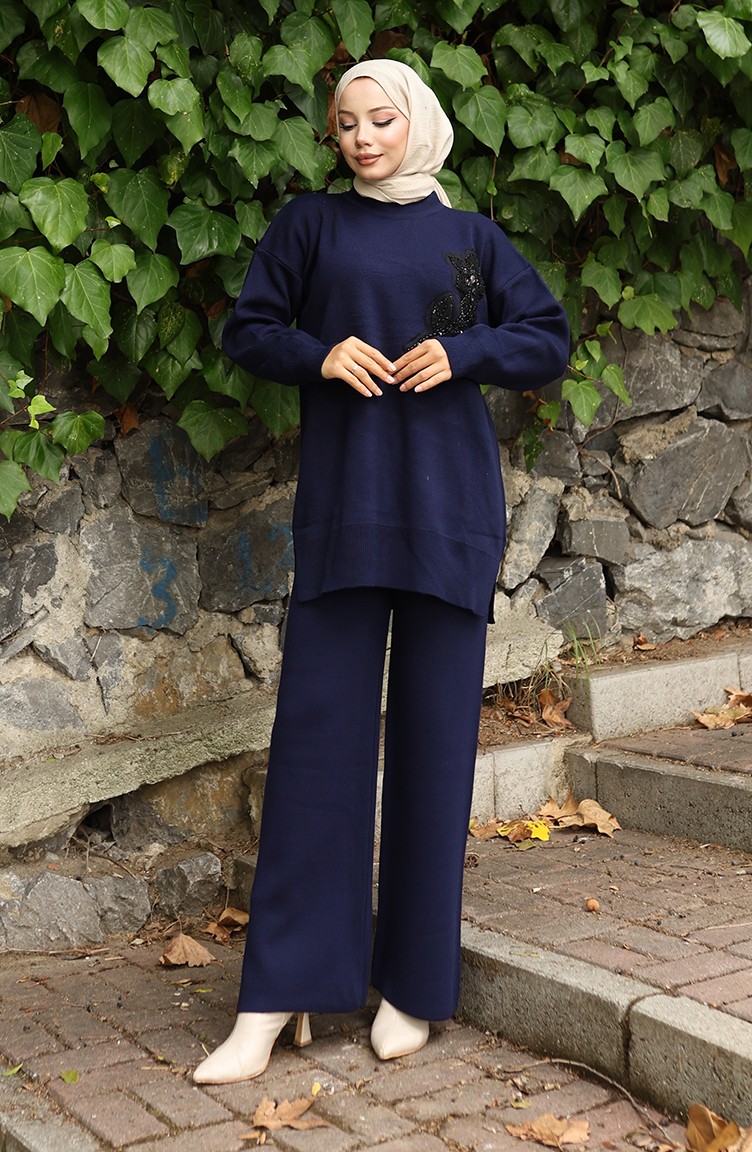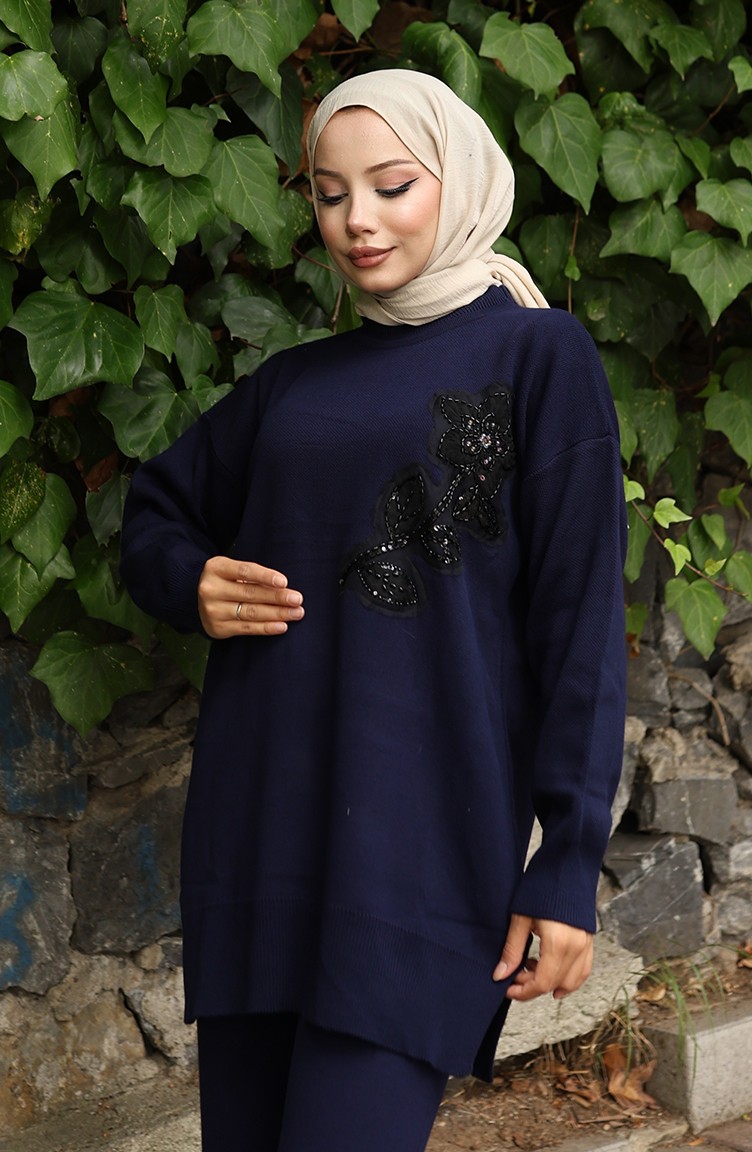 بدلة من قطعتين، بنطال وقميص محبوك مطرز بالورود، 1067-04 أزرق داكن 1067-04