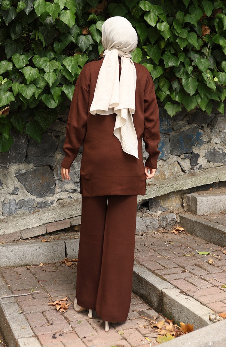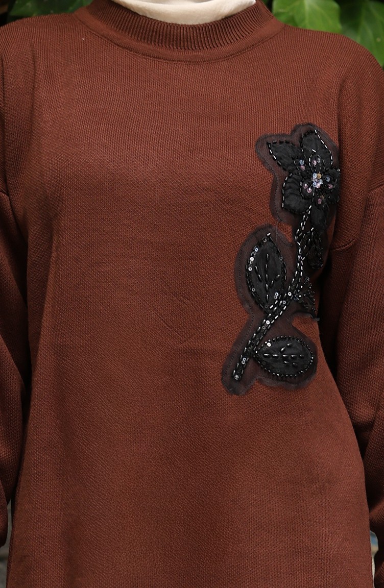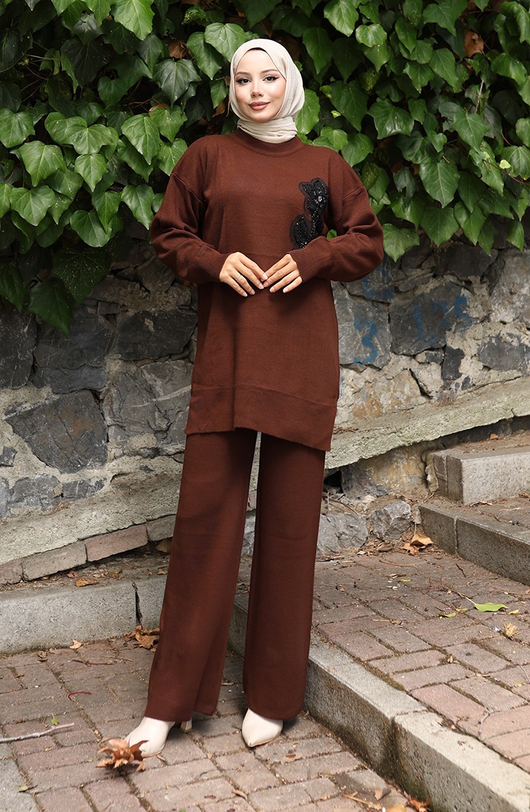 بدلة من قطعتين، بنطال وبنطلون، تونك، مطرز بالورود، 1067-08، بني 1067-08
