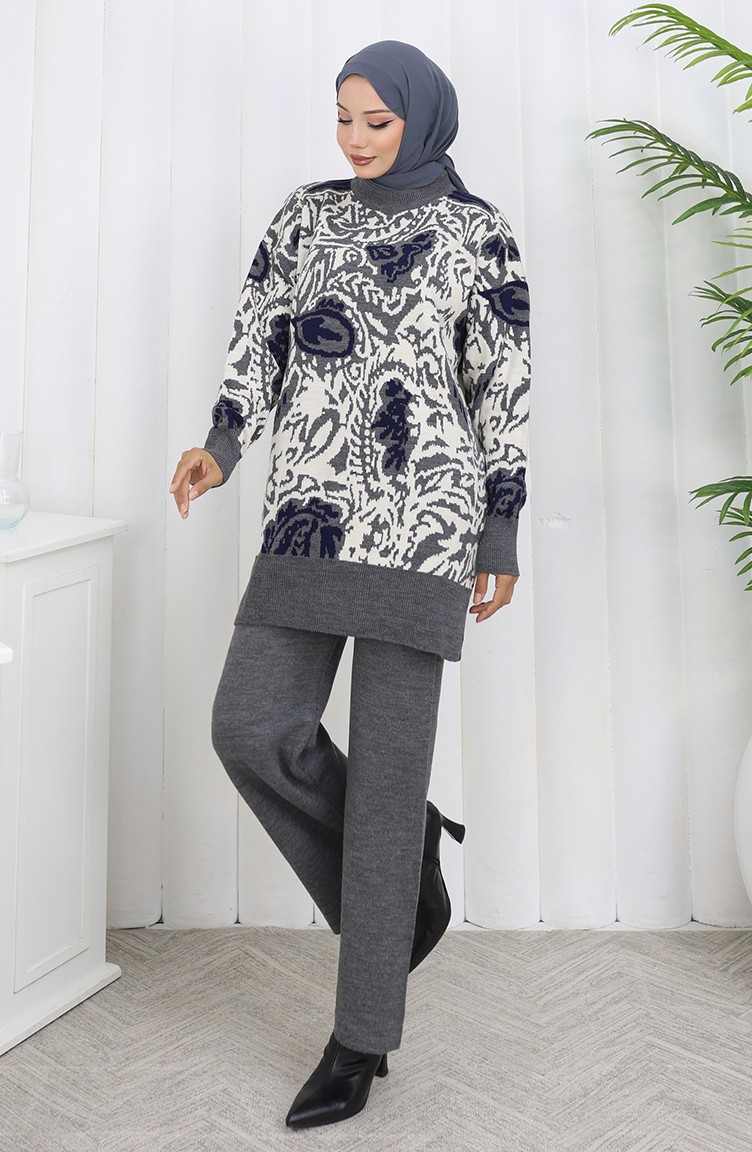 طقم تونيك وبنطلون محبوك مزخرف من قطعتين 1060-01 رمادي 1060-01