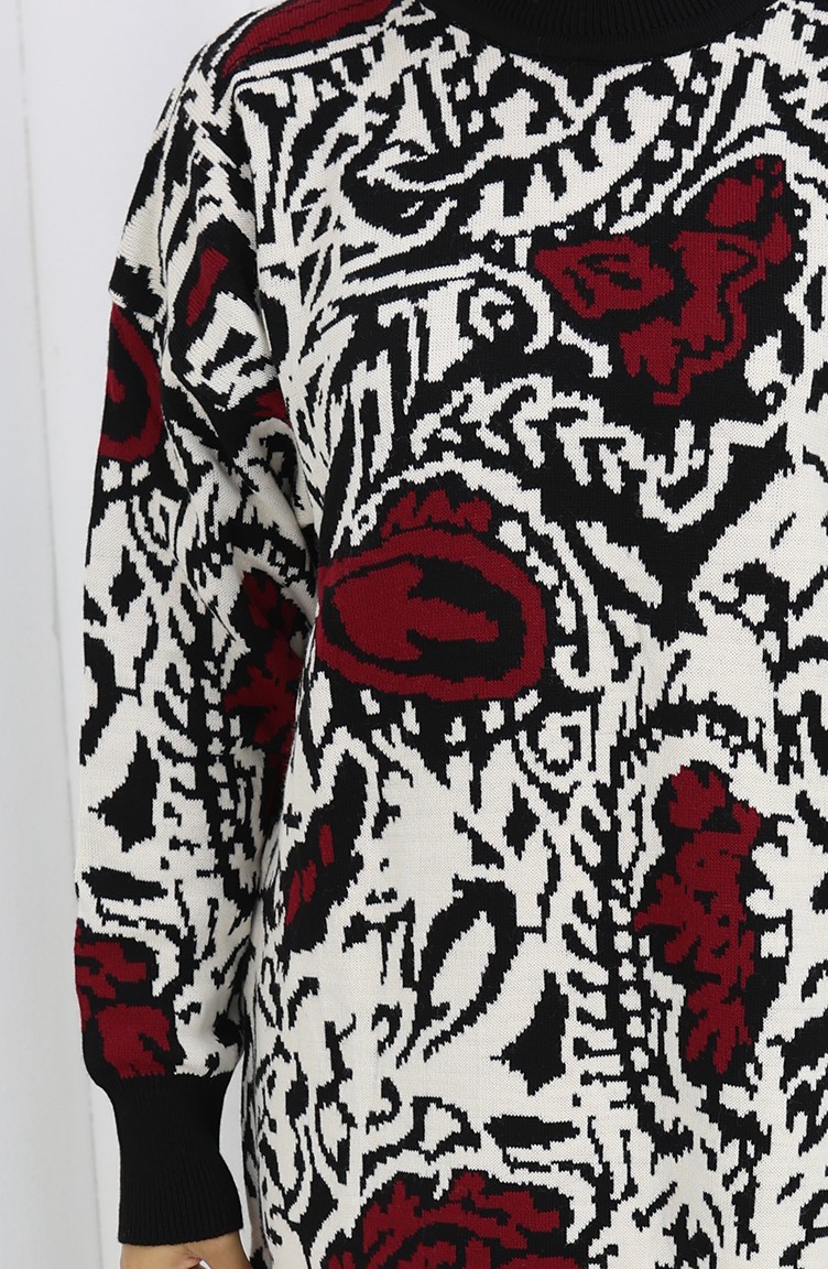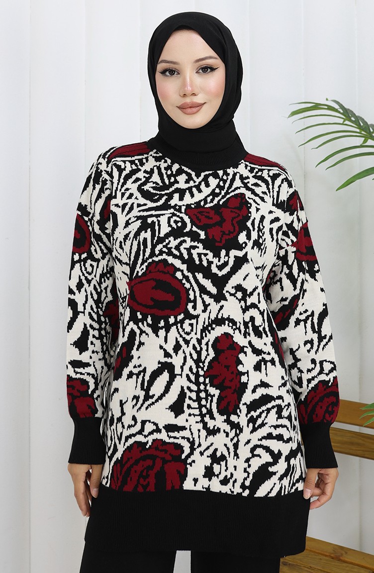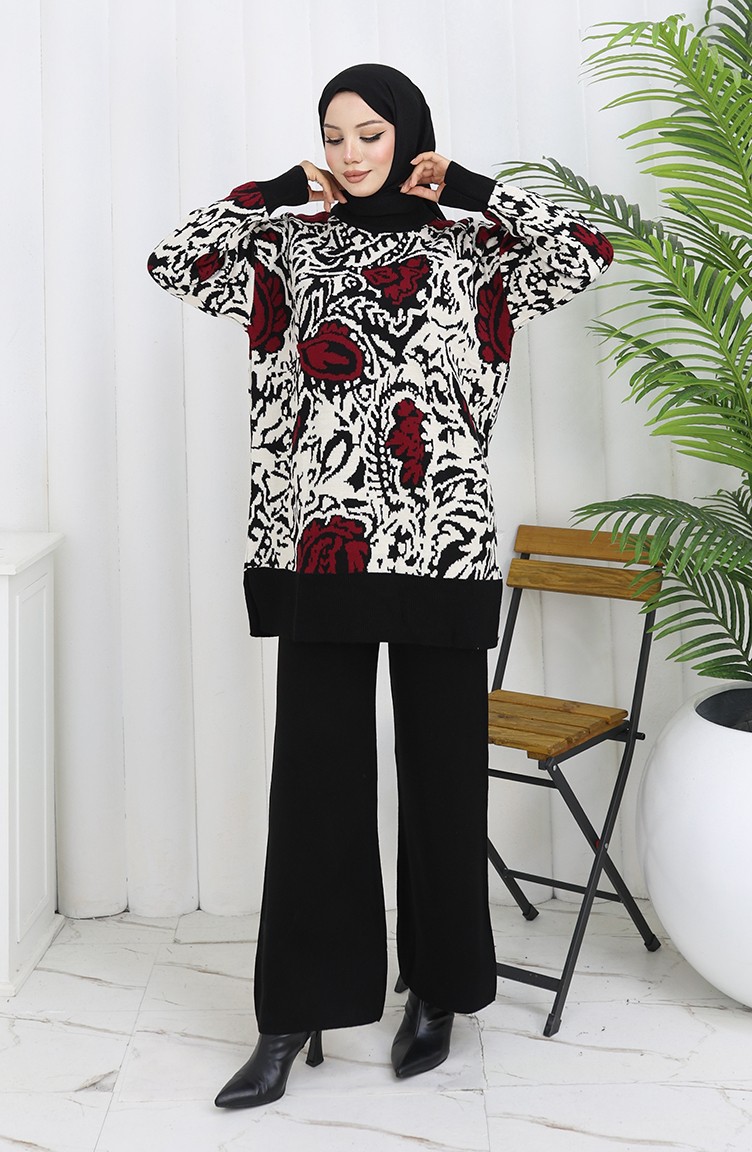 بدلة من قطعتين من تونيك مزخرف وبنطلون 1060-06 أسود وأحمر قرمزي 1060-06