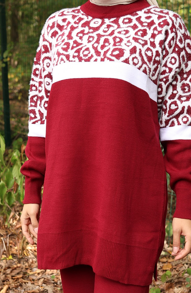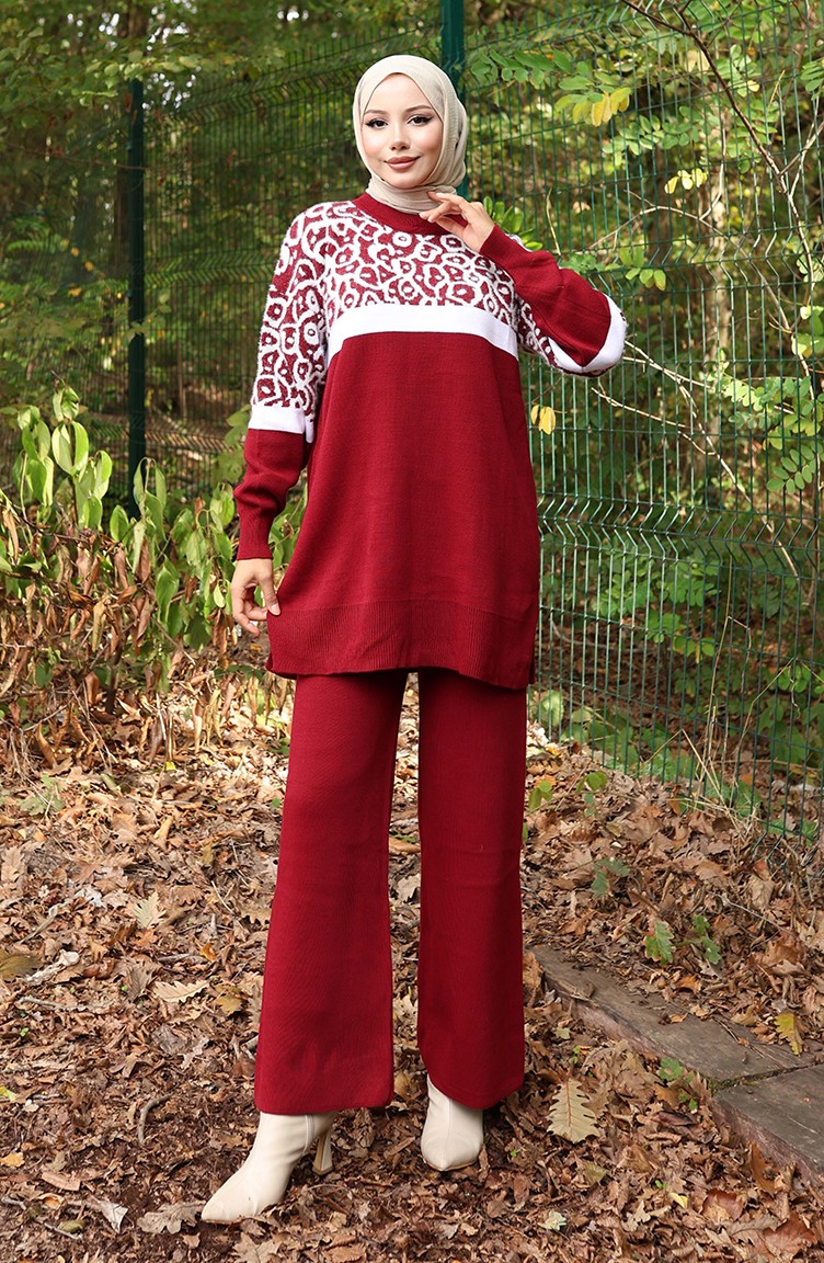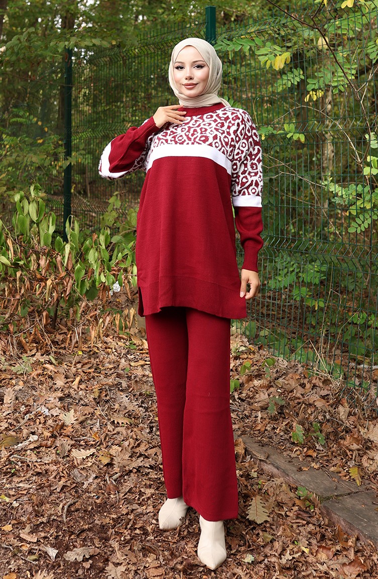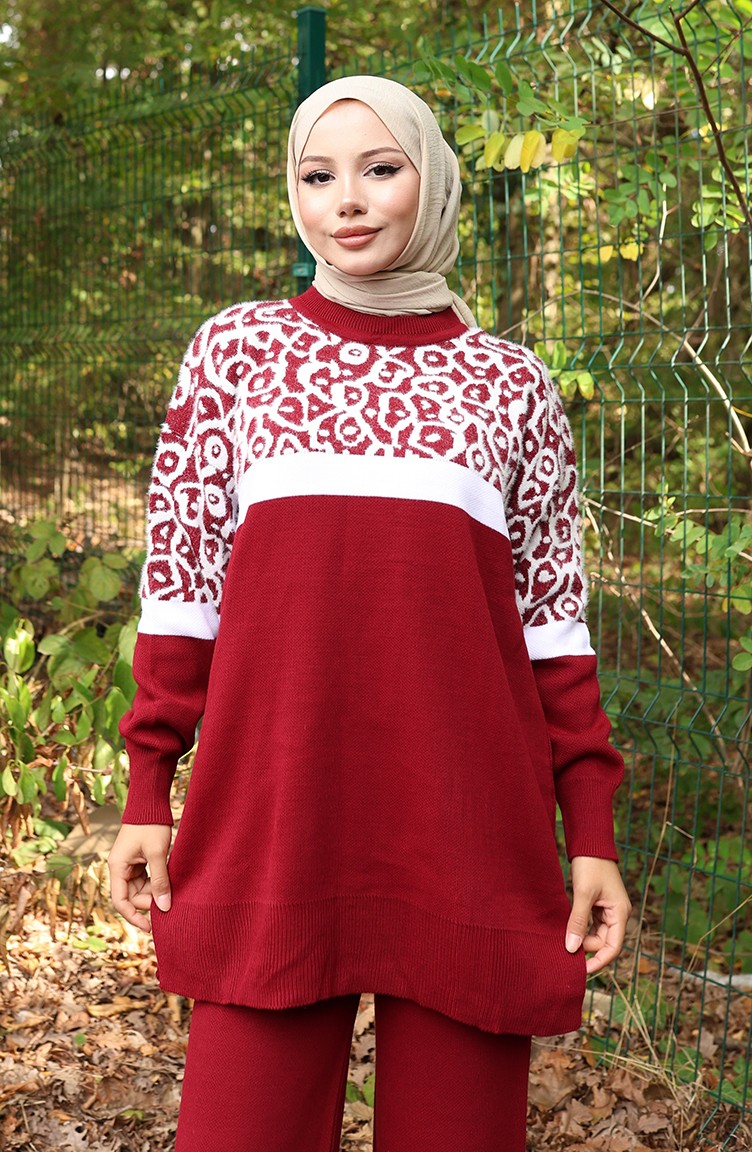 بدلة من قطعتين من التونيك المزخرف والمزخرف، لون أحمر قرمزي، موديل 1013-06 1013-06
