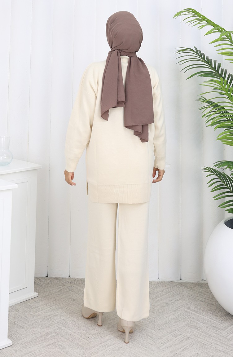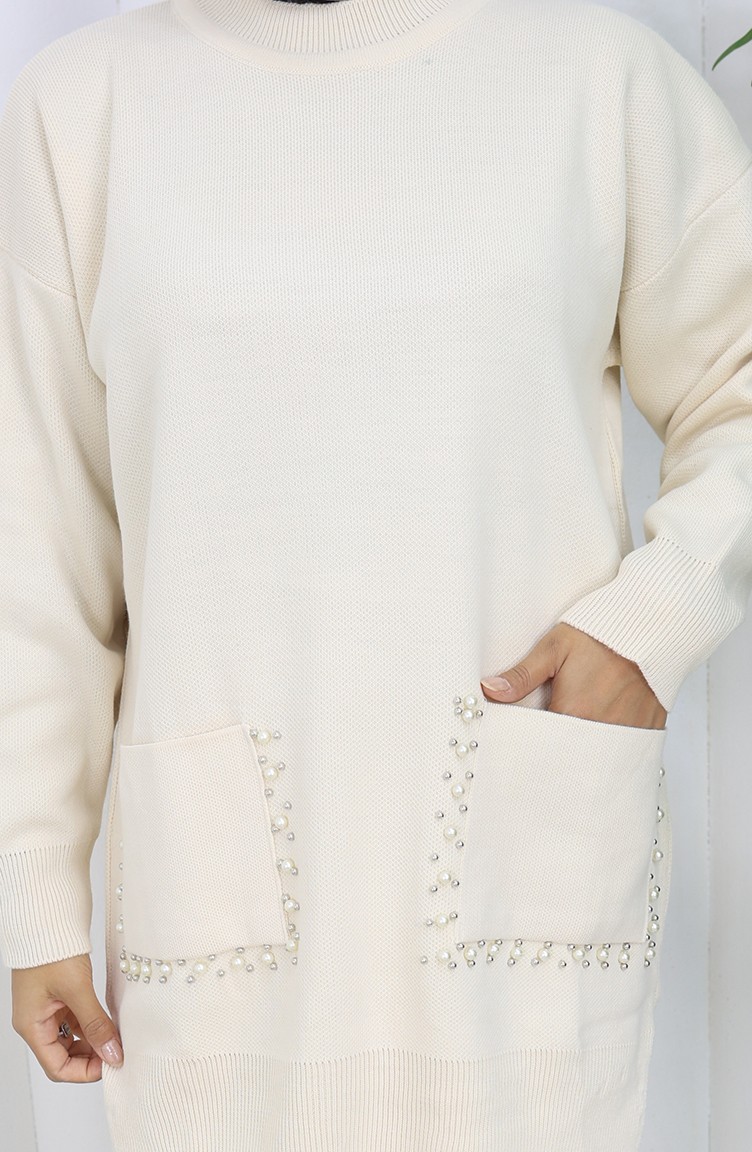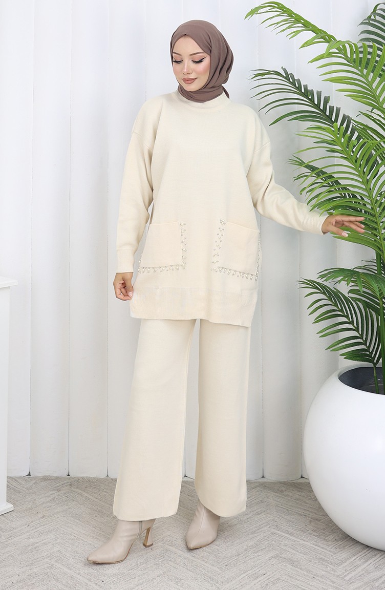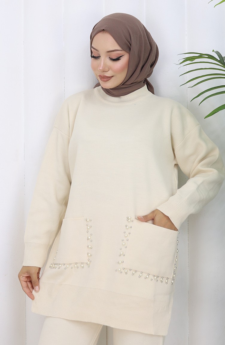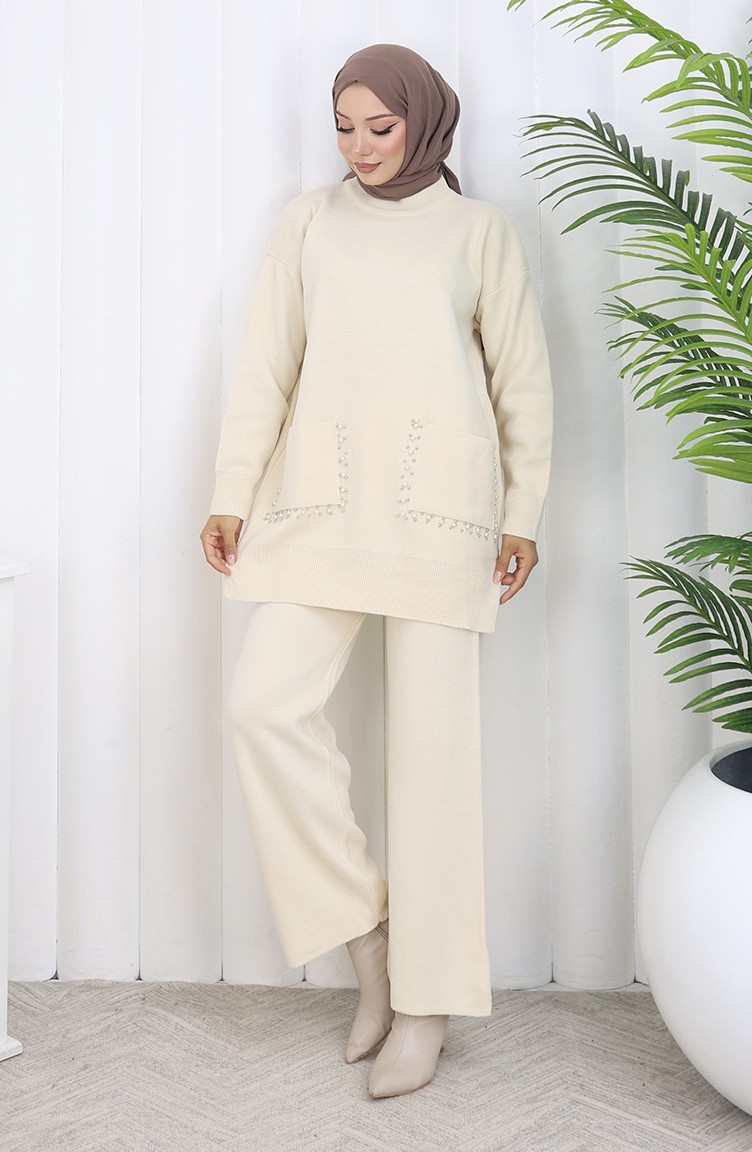طقم تونيك وبنطلون محبوك بجيوب لؤلؤية من قطعتين 1070-01 بيج 1070-01