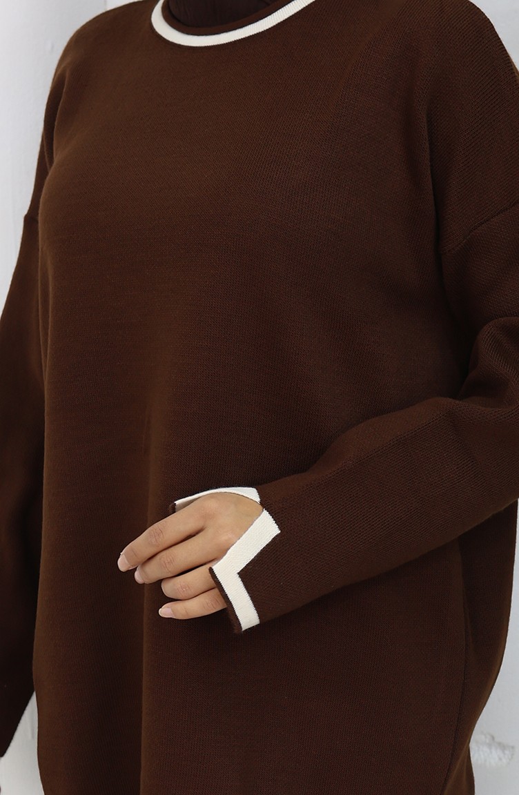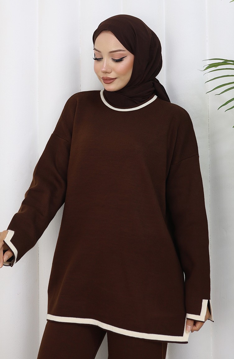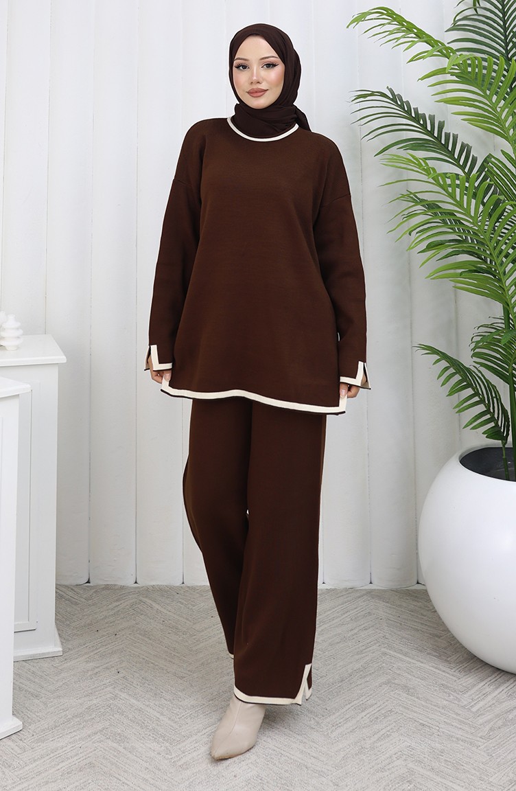 طقم من قطعتين من بنطلون وكنزة محبوكة بتفاصيل شق 0011-03 بني 0011-03