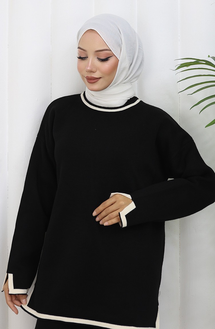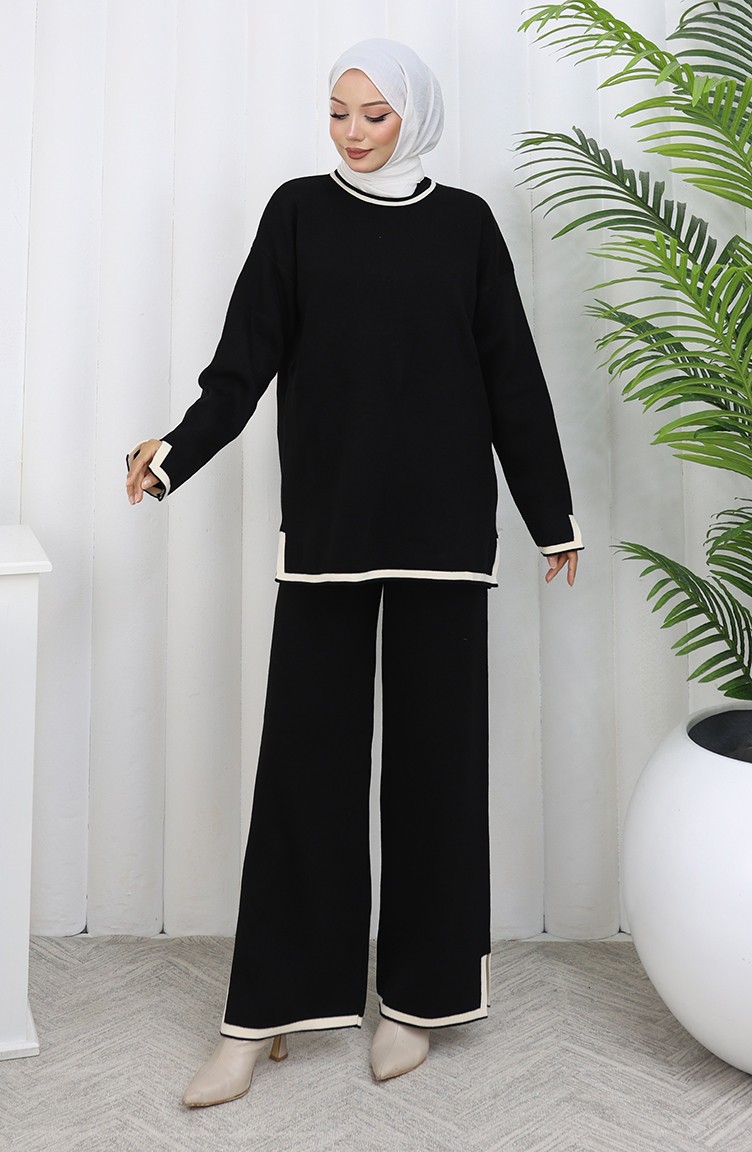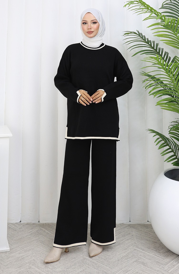 طقم من قطعتين من بنطلون وسويت شيرت محبوك بتفاصيل شق 0011-04 أسود 0011-04