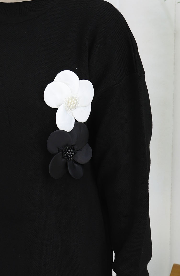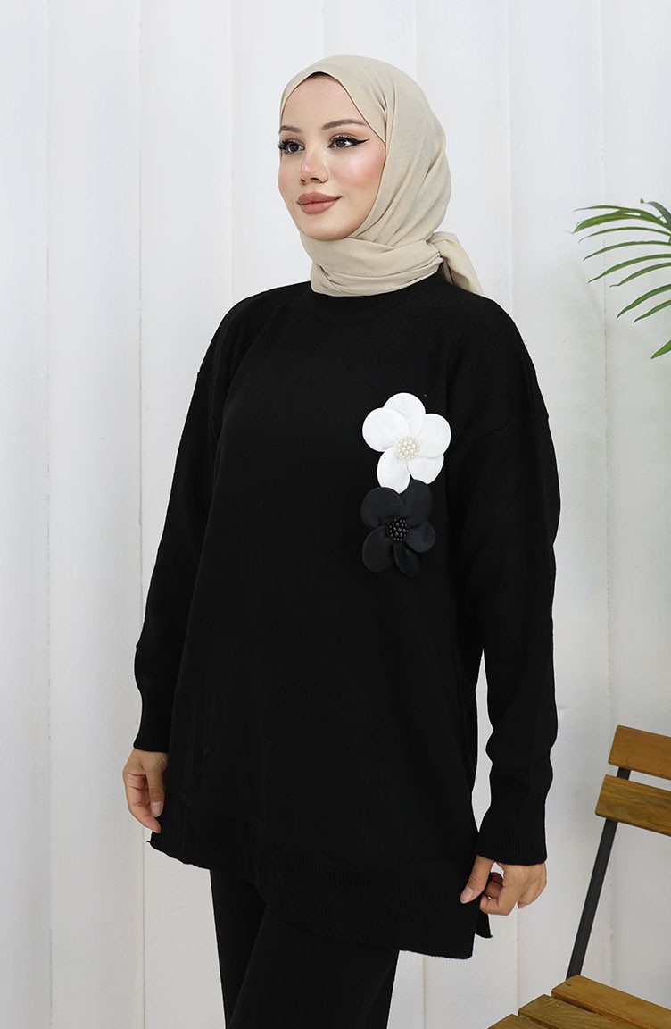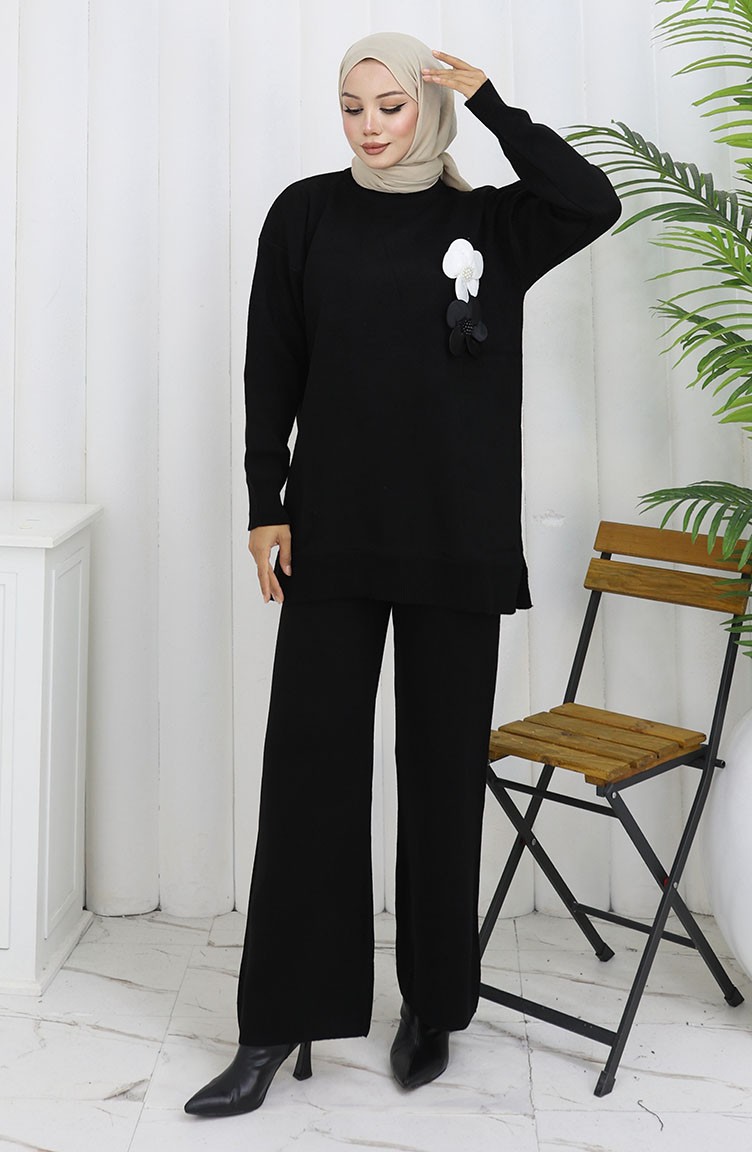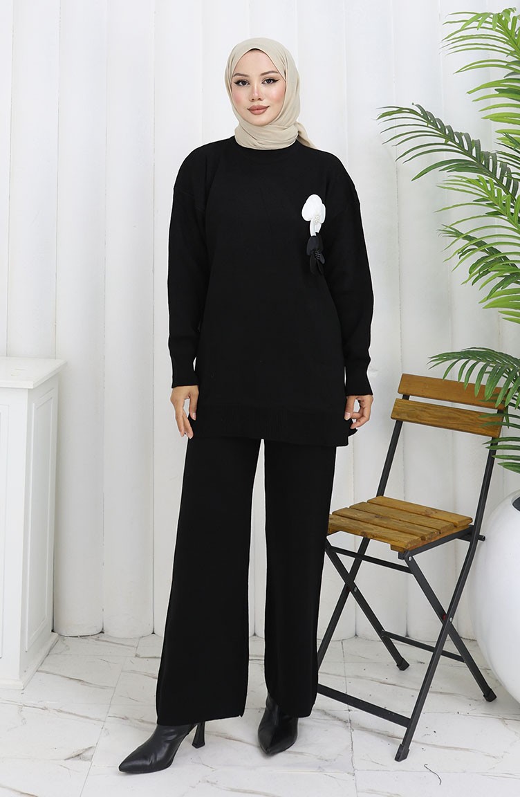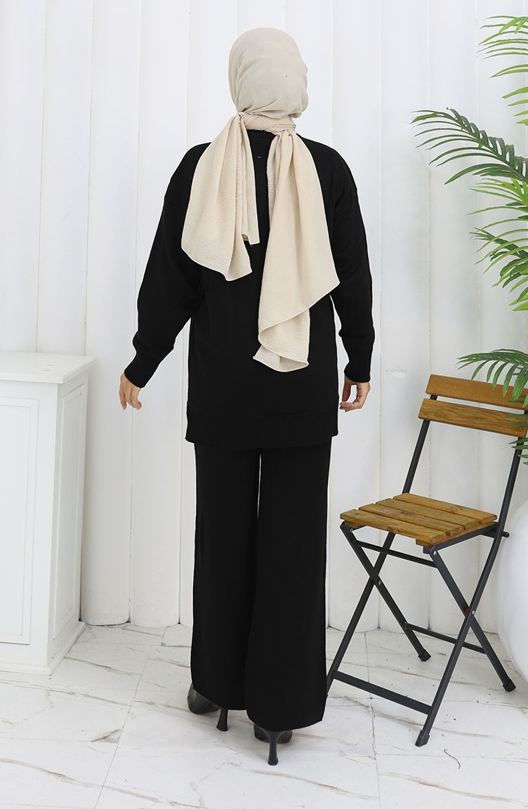 بدلة محبوكة من قطعتين، سترة وبنطلون بياقة مدورة، لون أسود، 1015-01 1015-01