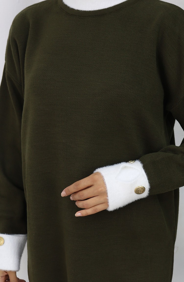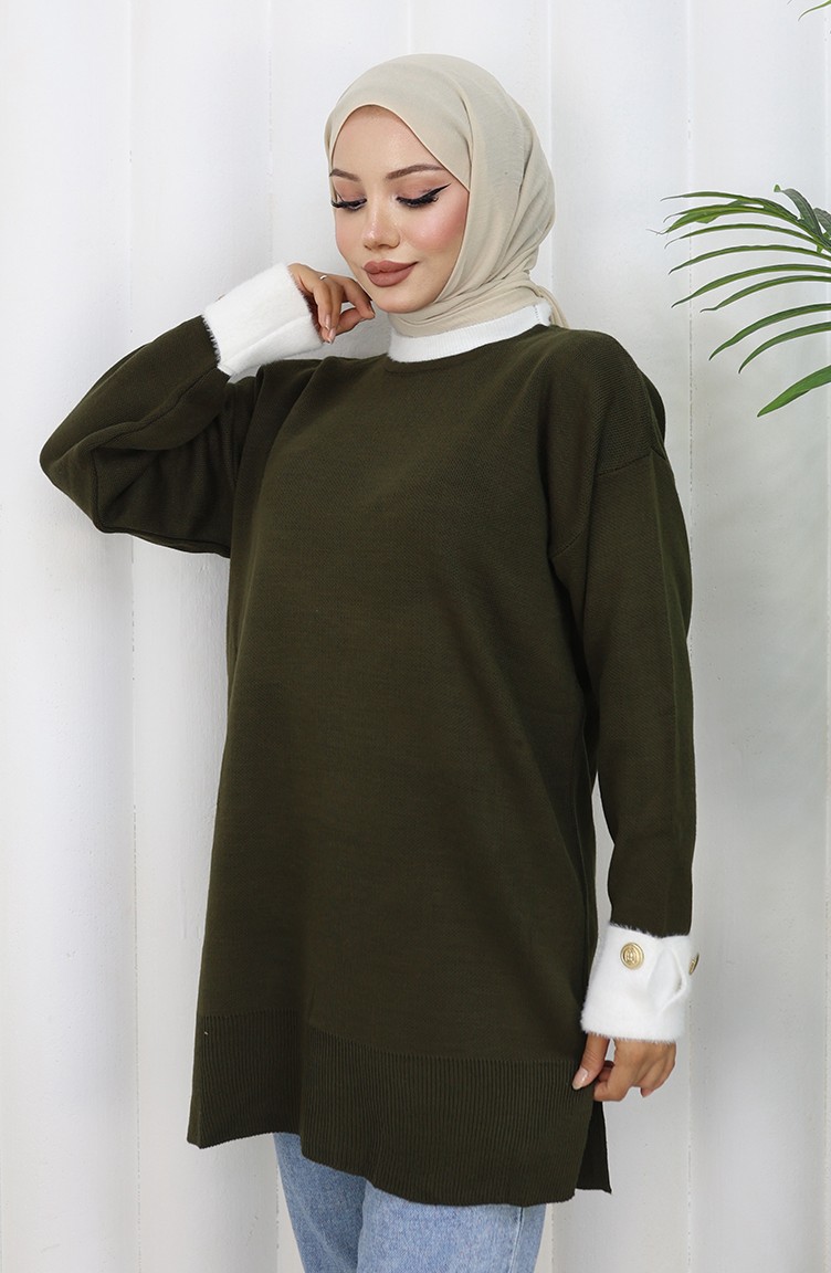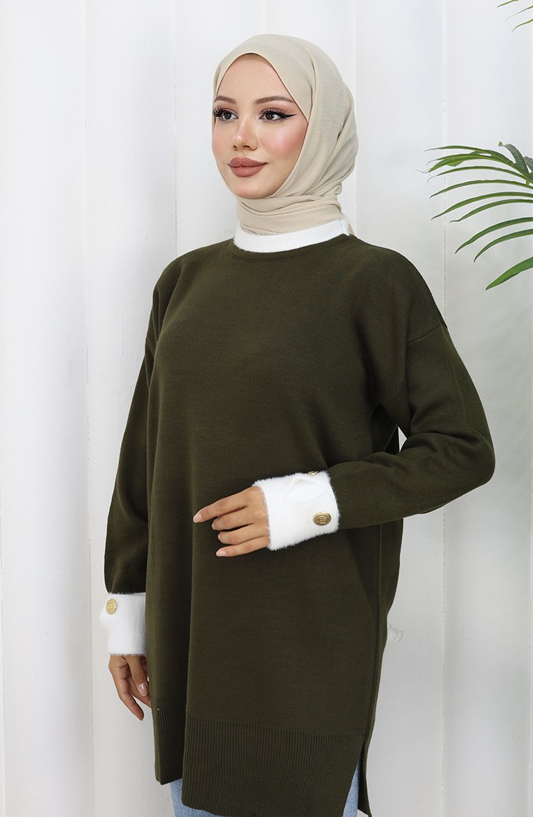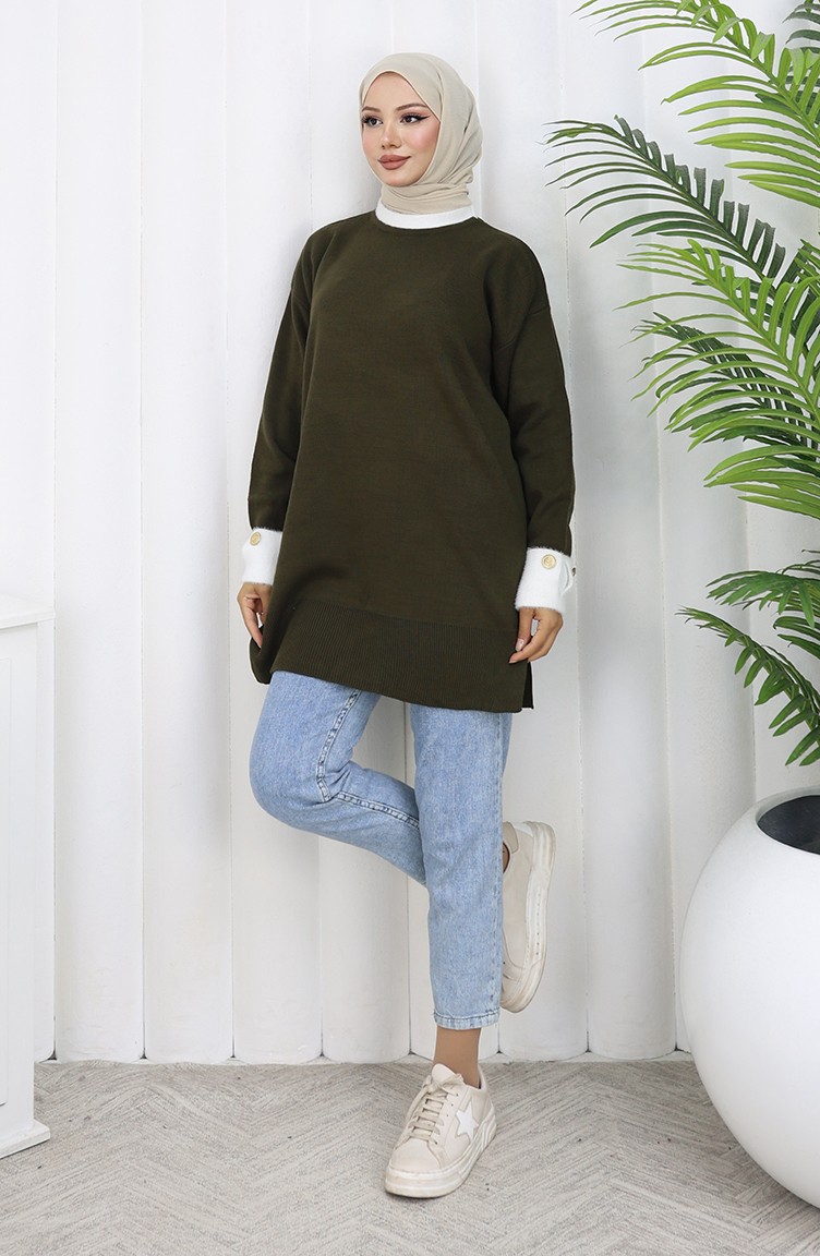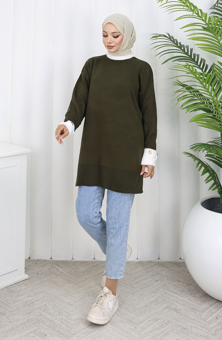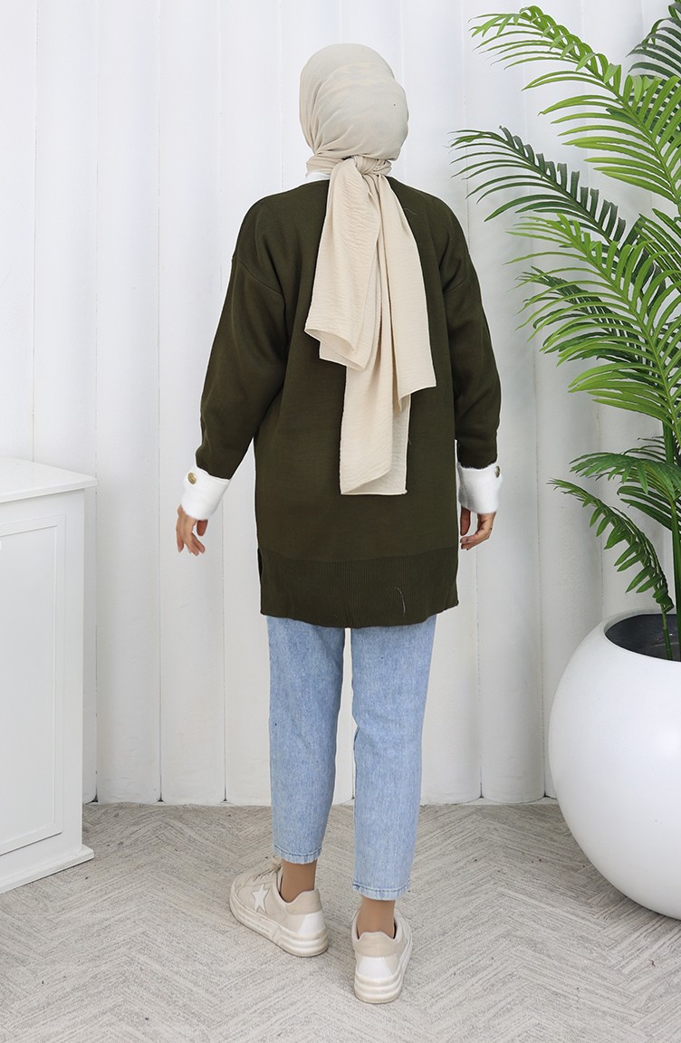 سترة محبوكة مع تفاصيل أزرار على الأكمام 3000-03 كاكي 3000-03