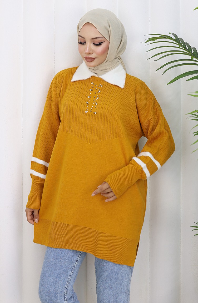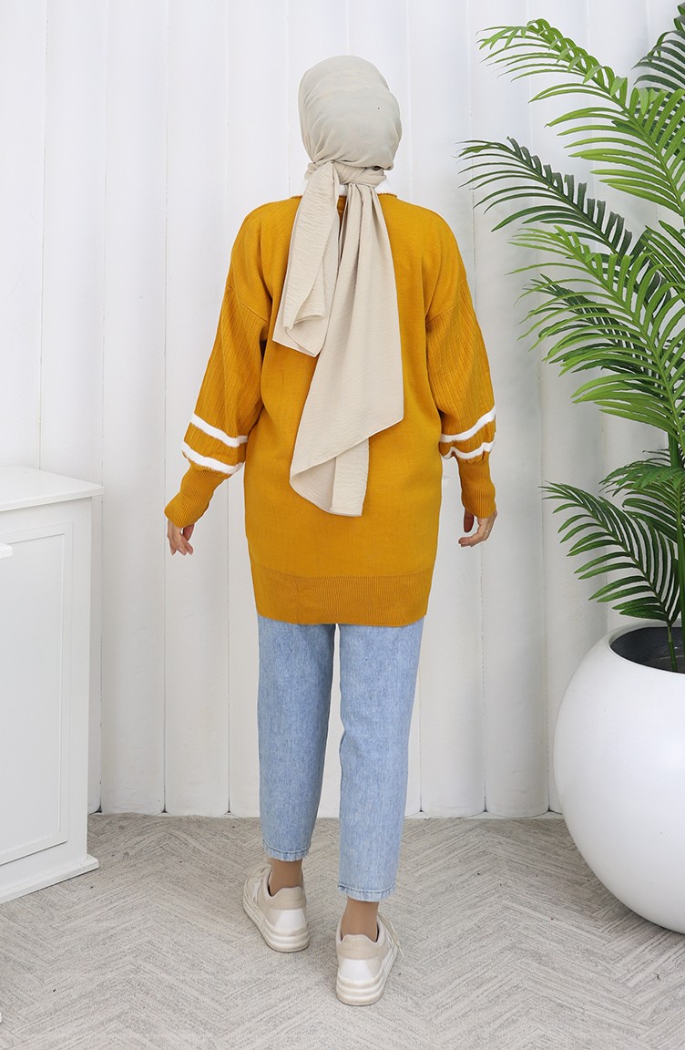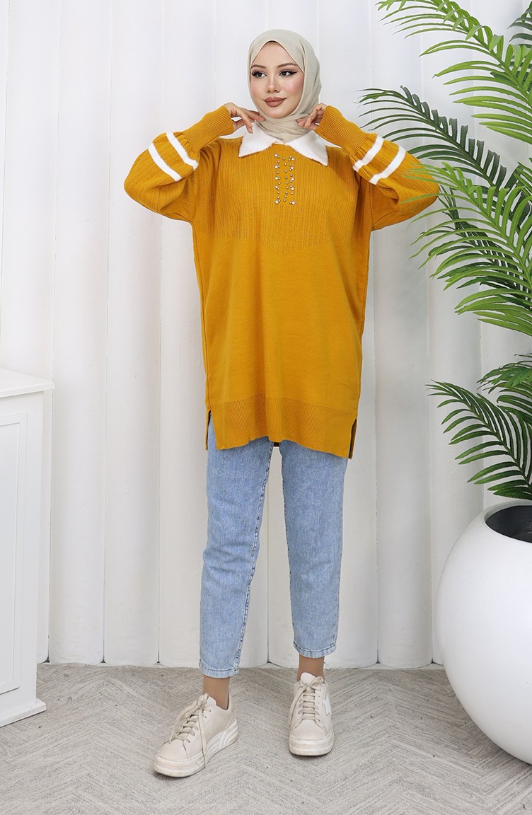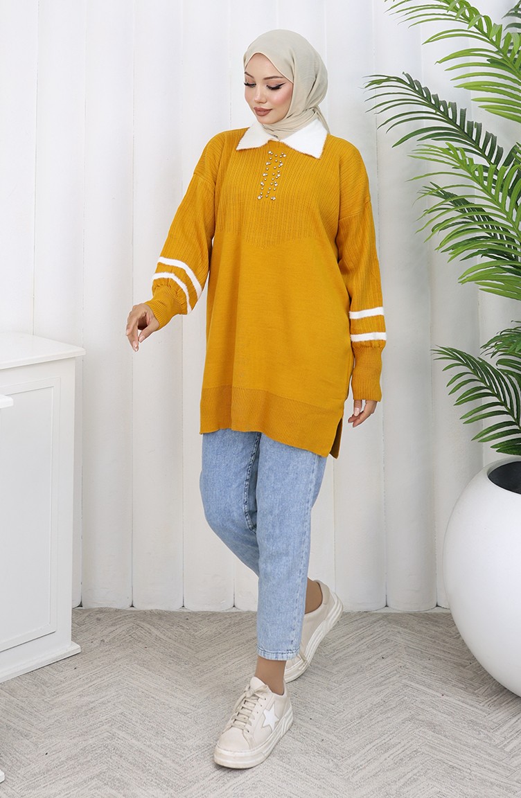 لون الخردل استخدامها. صممه النسيج الاكريليك. ذو مظهر سادة. التونيك عند لبسه مع قطعة اخرى تعطي تلاؤما جميلا. Balon Kol. مصممة من القماش السميك. القياس التي في الصورة هي قياس العارضة.