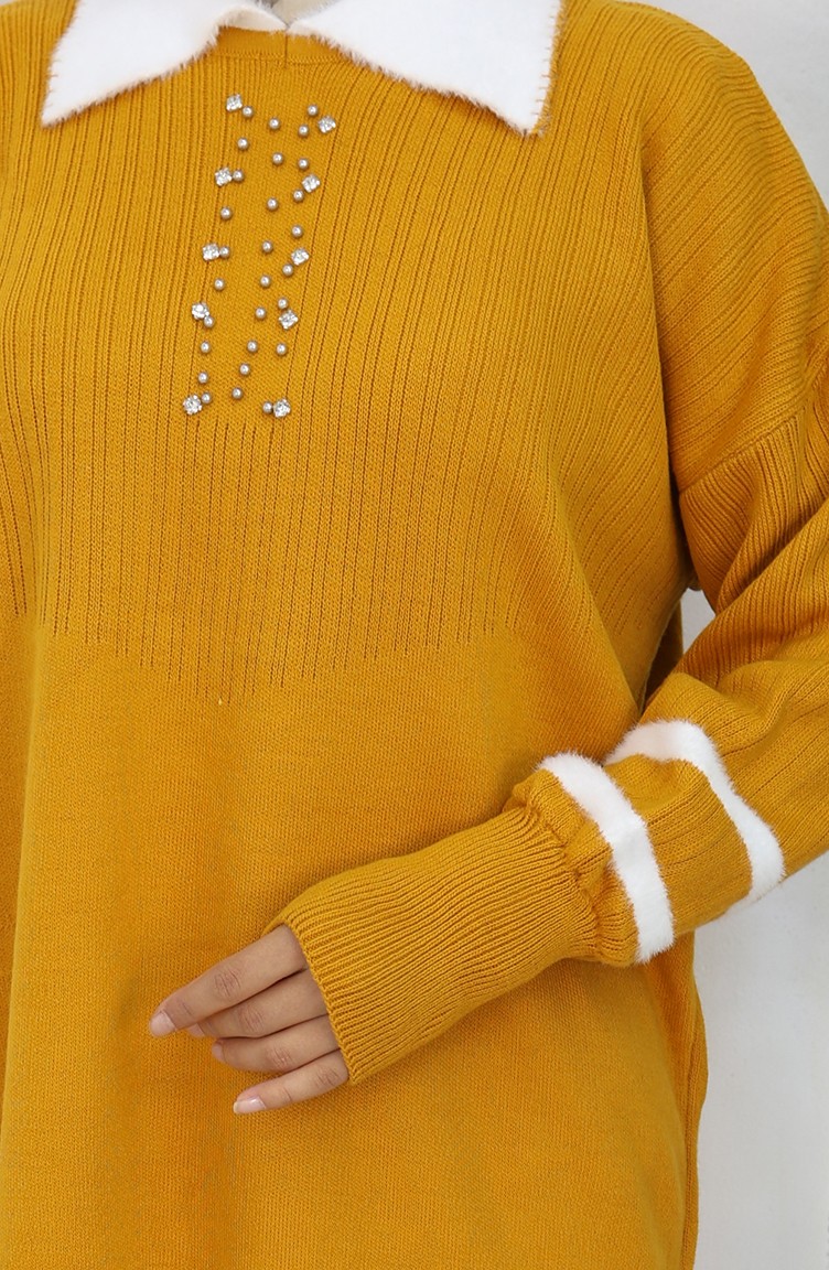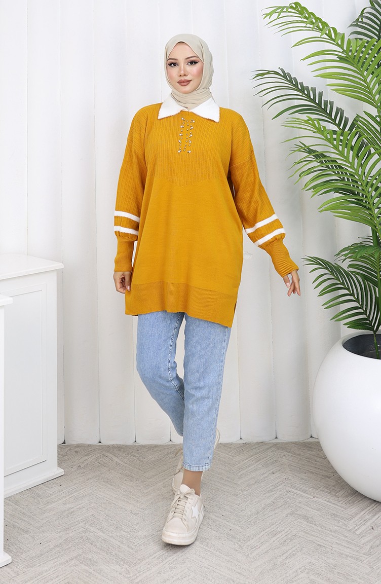 سترة محبوكة بأكمام منفوخة وياقة 3007-02 لون خردل 3007-02