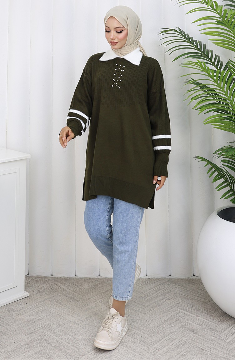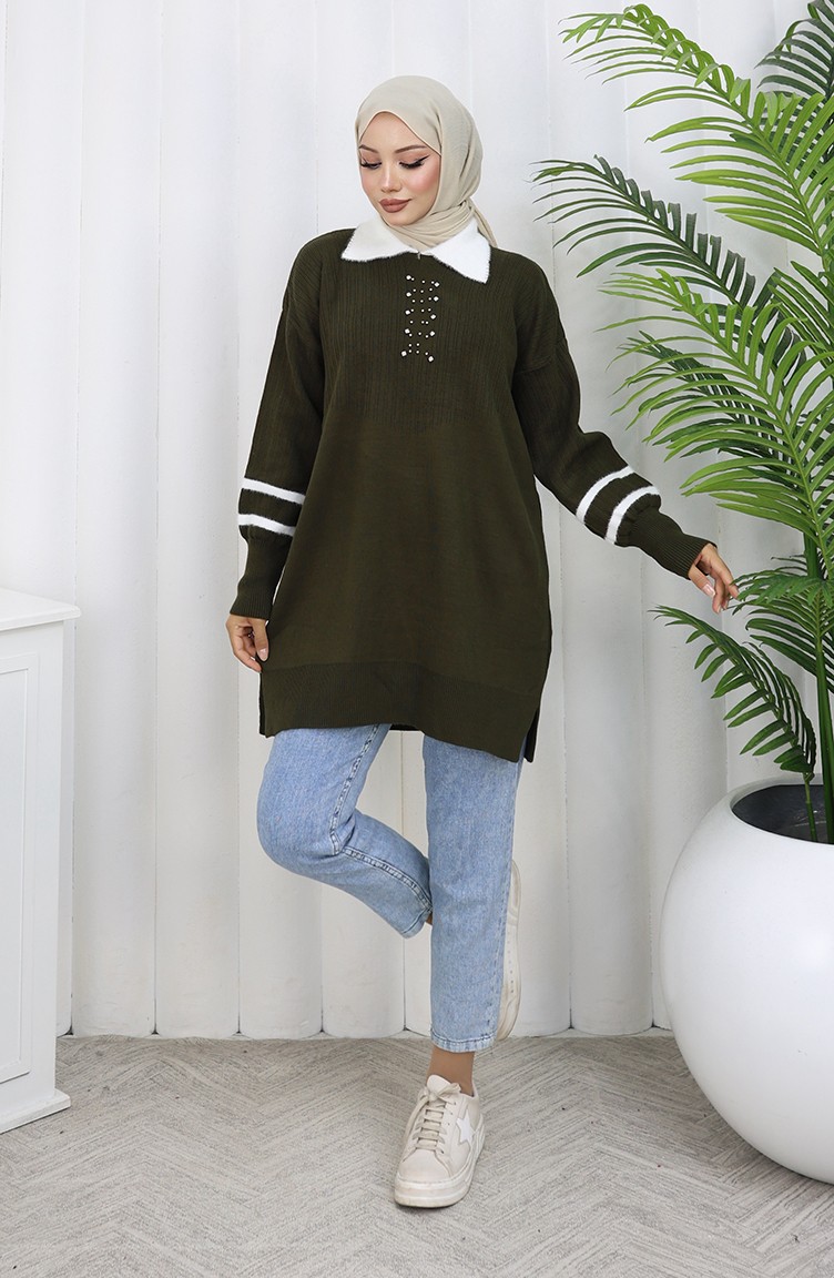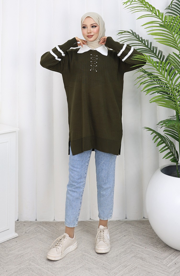 سترة محبوكة بأكمام منفوخة وياقة 3007-03 كاكي 3007-03