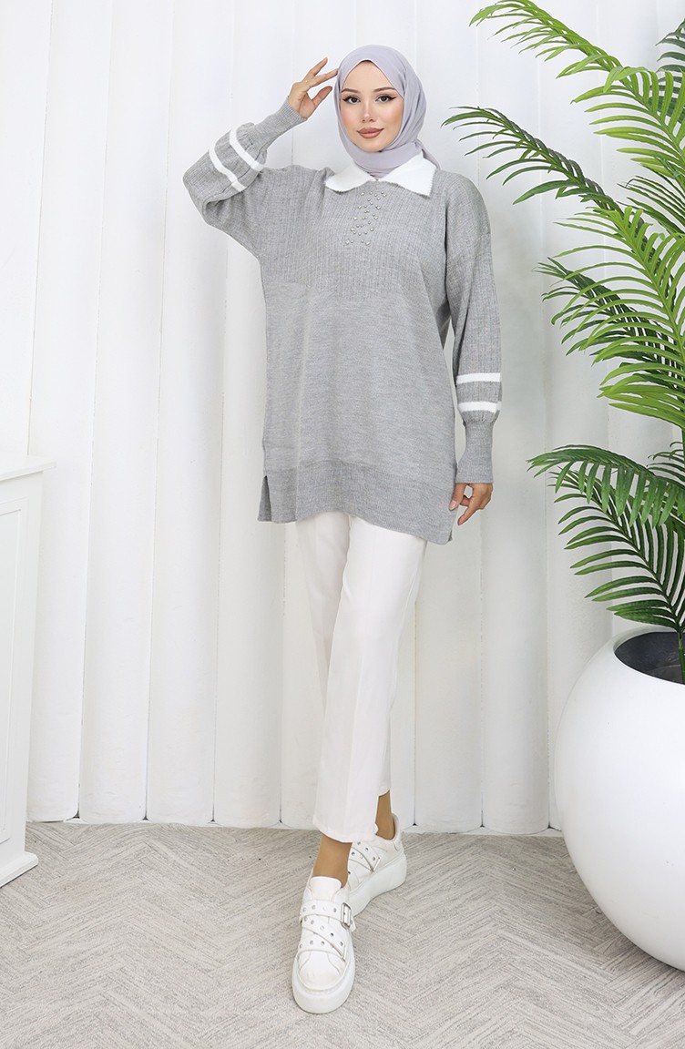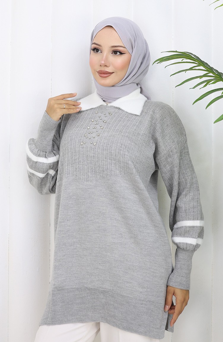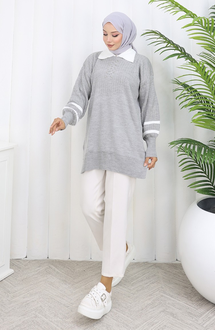 استعمل لون الرمادي. صممه النسيج الاكريليك. ذو مظهر سادة. التونيك عند لبسه مع قطعة اخرى تعطي تلاؤما جميلا. Balon Kol. مصممة من القماش السميك. القياس التي في الصورة هي قياس العارضة.