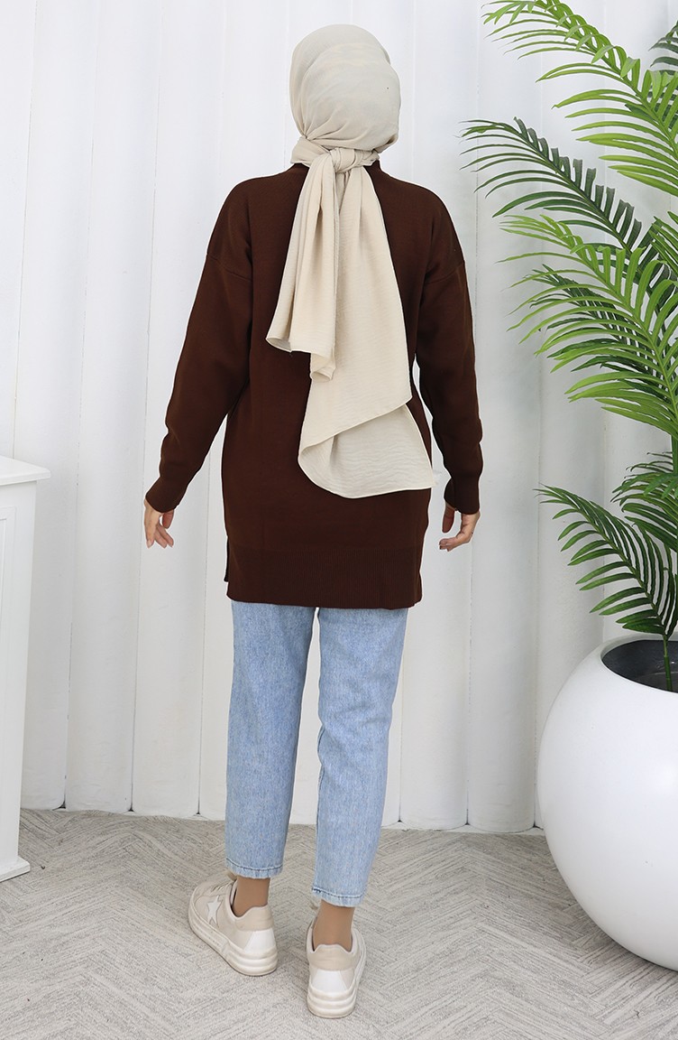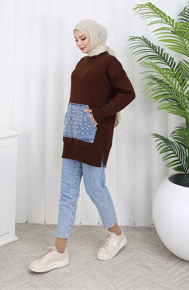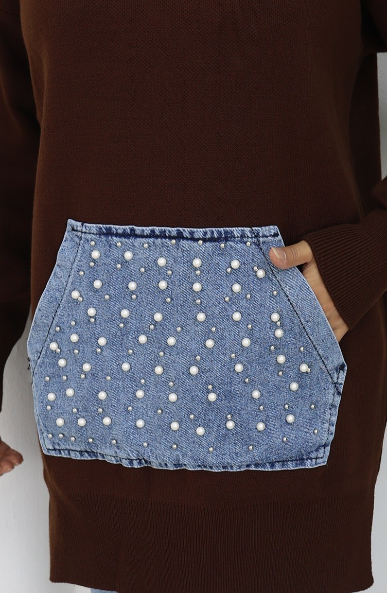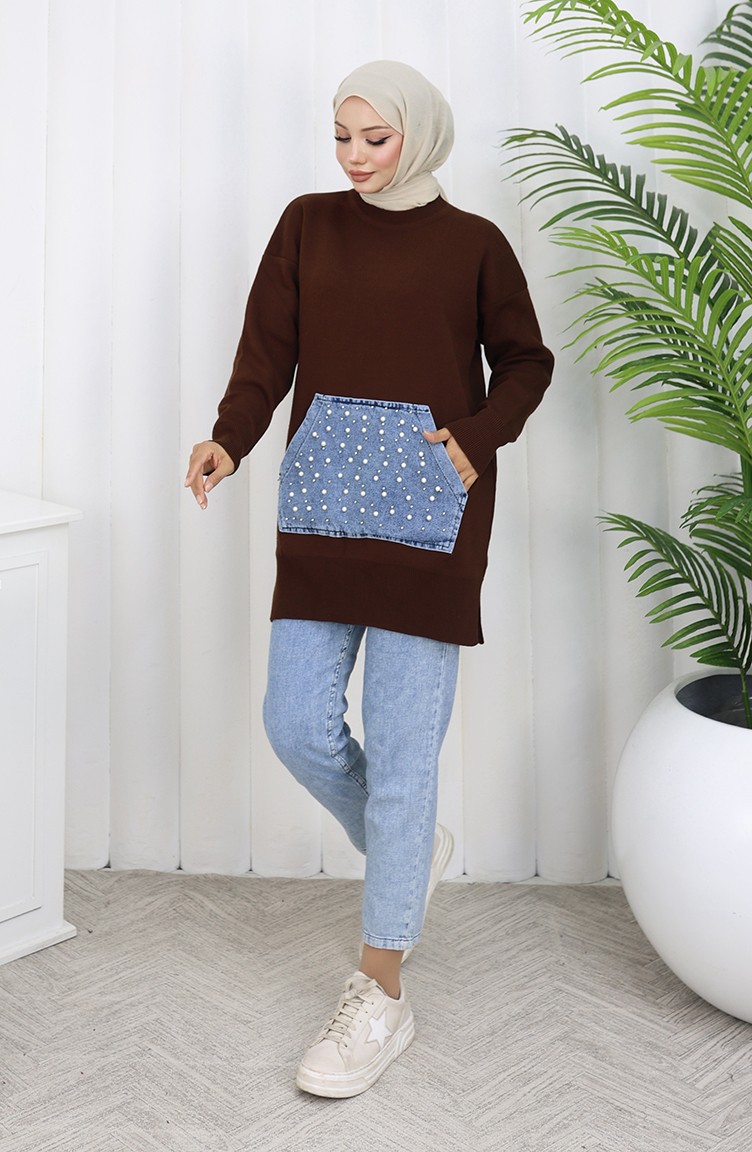 سترة محبوكة بجيوب الكنغر ومزينة باللؤلؤ 3030-01 باللون البني 3030-01