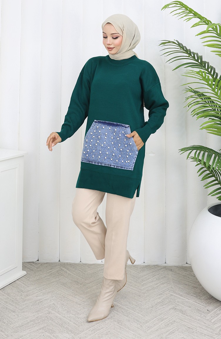 سترة محبوكة بجيوب الكنغر ومزينة باللؤلؤ 3030-06 بترولي 3030-06