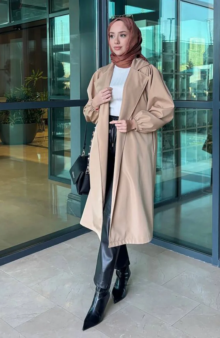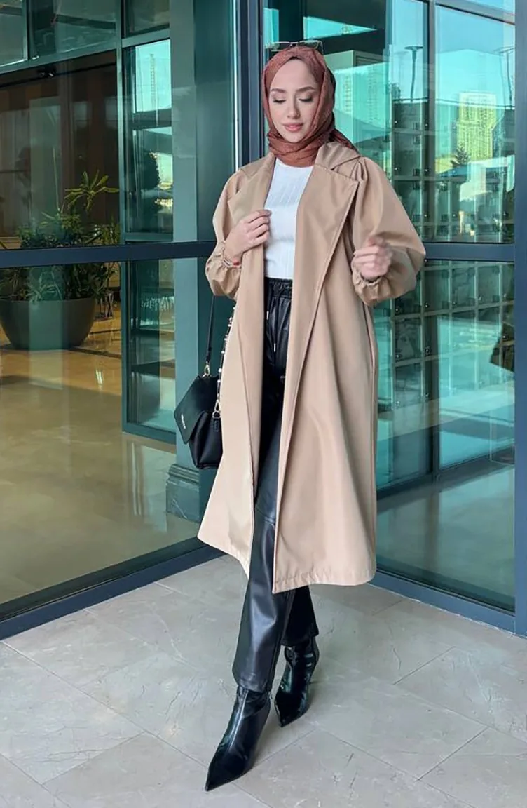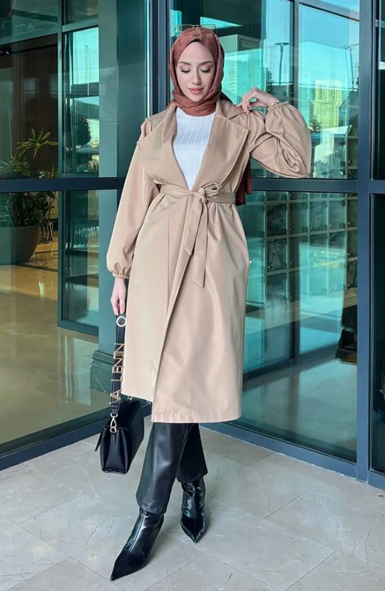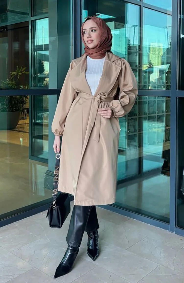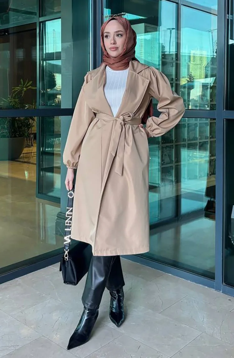 معطف واقٍ من المطر بتصميم حزام للخصر 4511-05 لون القهوة مع الحليب 4511-05
