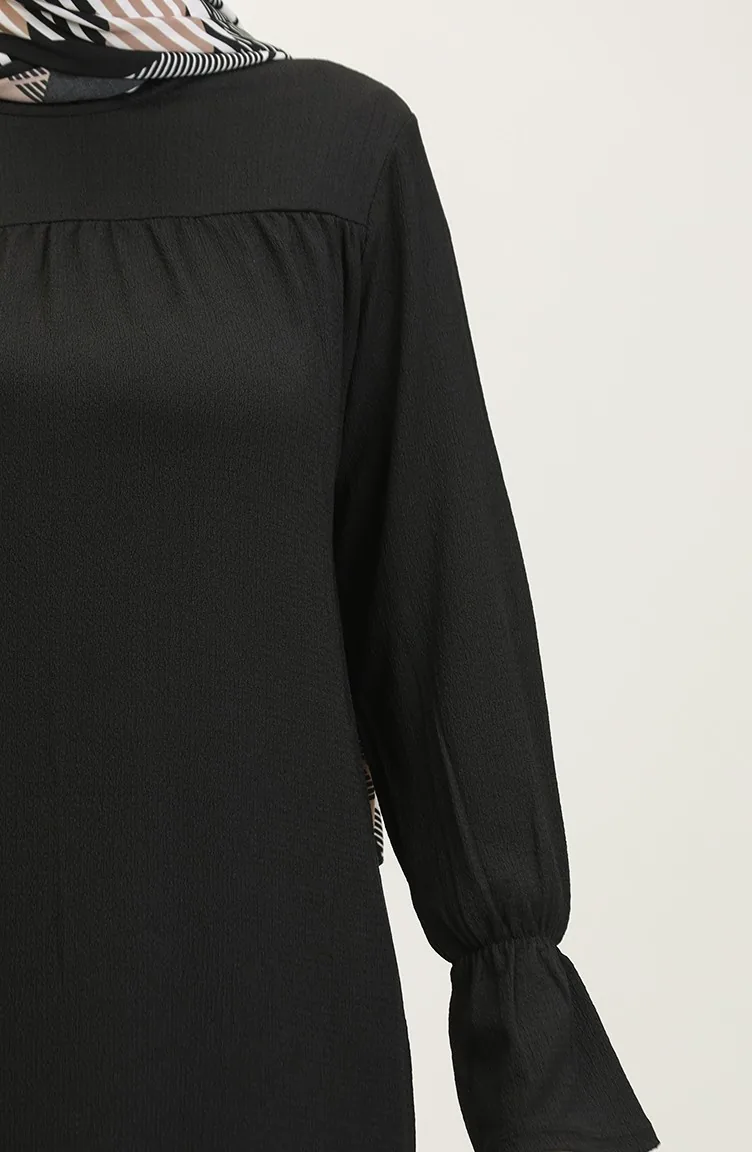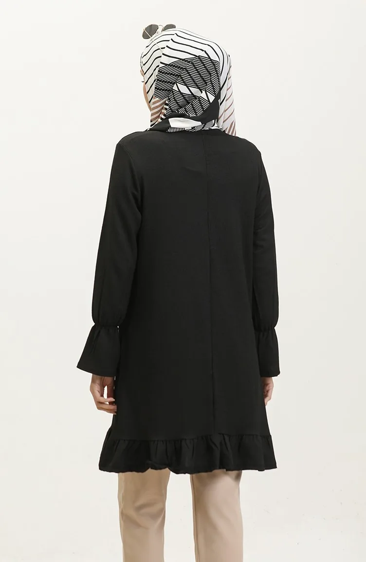 استخدم فيه اللون الأسود. صممه النسيج الشاش. ذو مظهر سادة. المنتج ذو الاستخدام بدون تبطين. المنتج طويلة الأكمام. من الممكن استعمال المنتج بدون ياقة مع كل ملابس. قماشه مناسب لجميع المواسم. هناك مقاسات كبيرة.