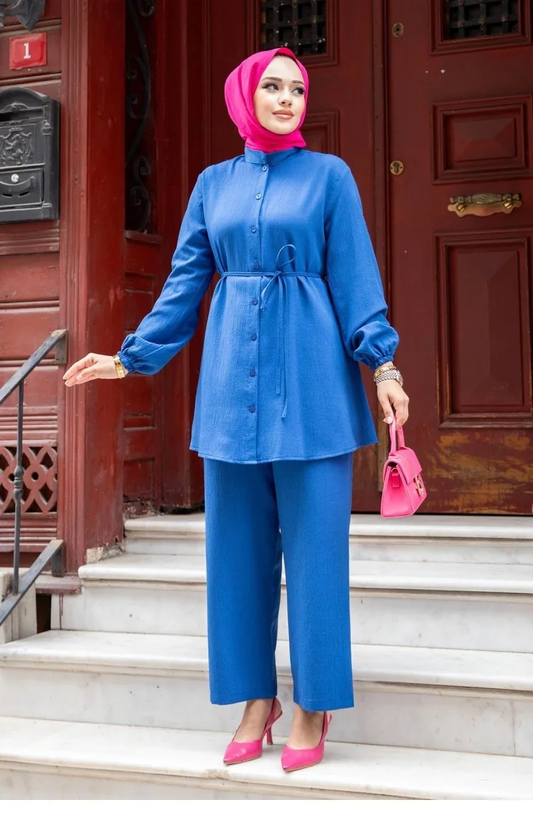 بدلة حجاب مفصلة بياقة القاضي باللون النيلي 466