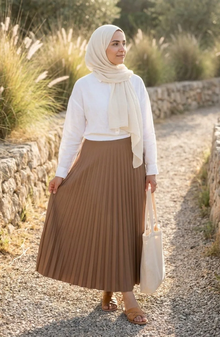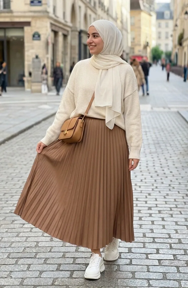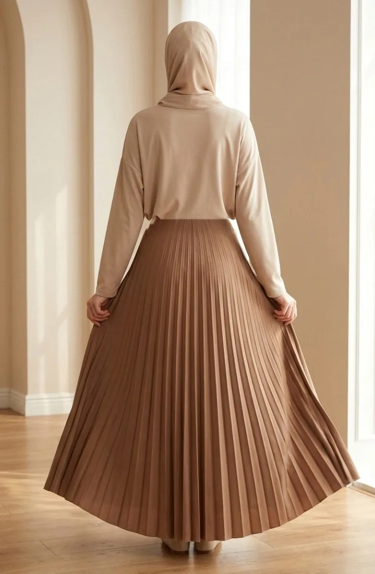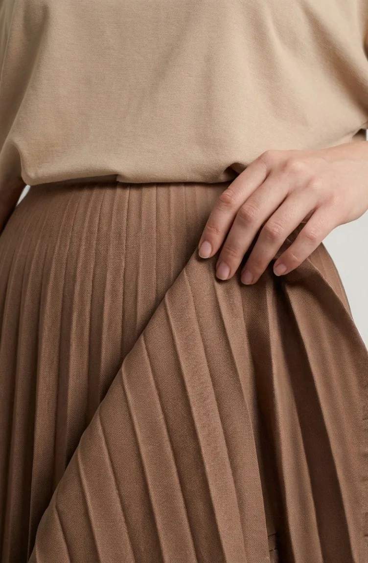 تنورة بخصر مطاطي وكسرات 0213-07 لون الكراميل 0213-07