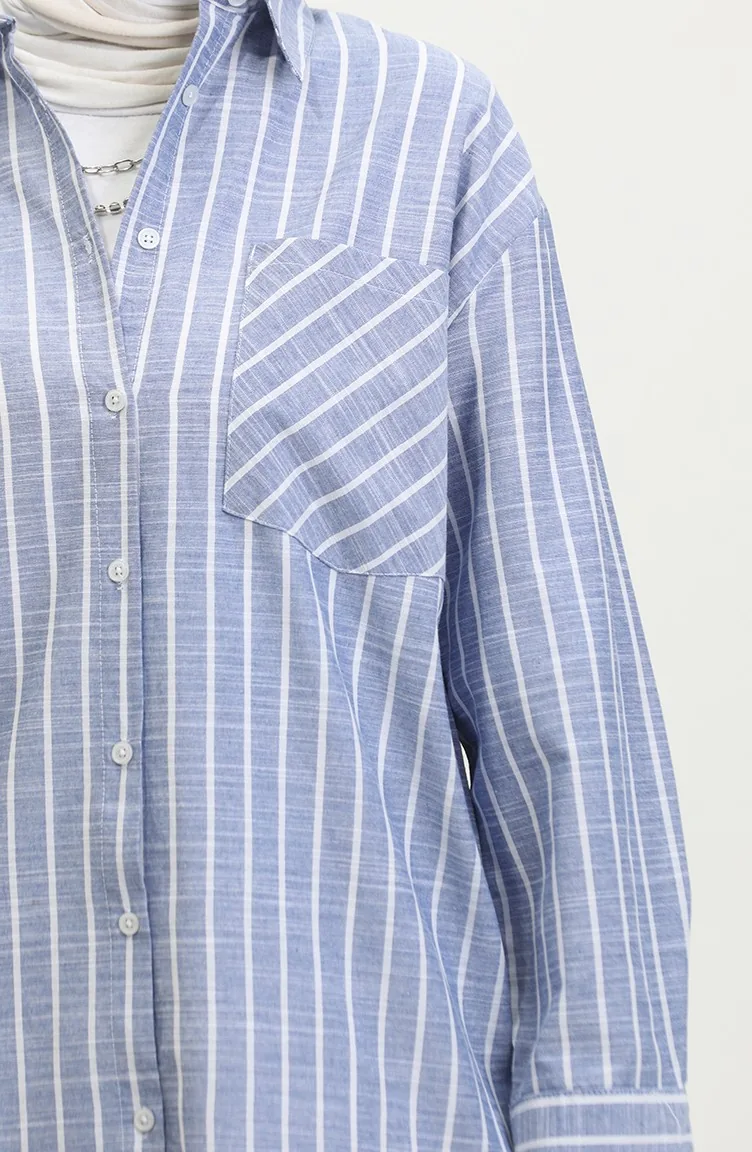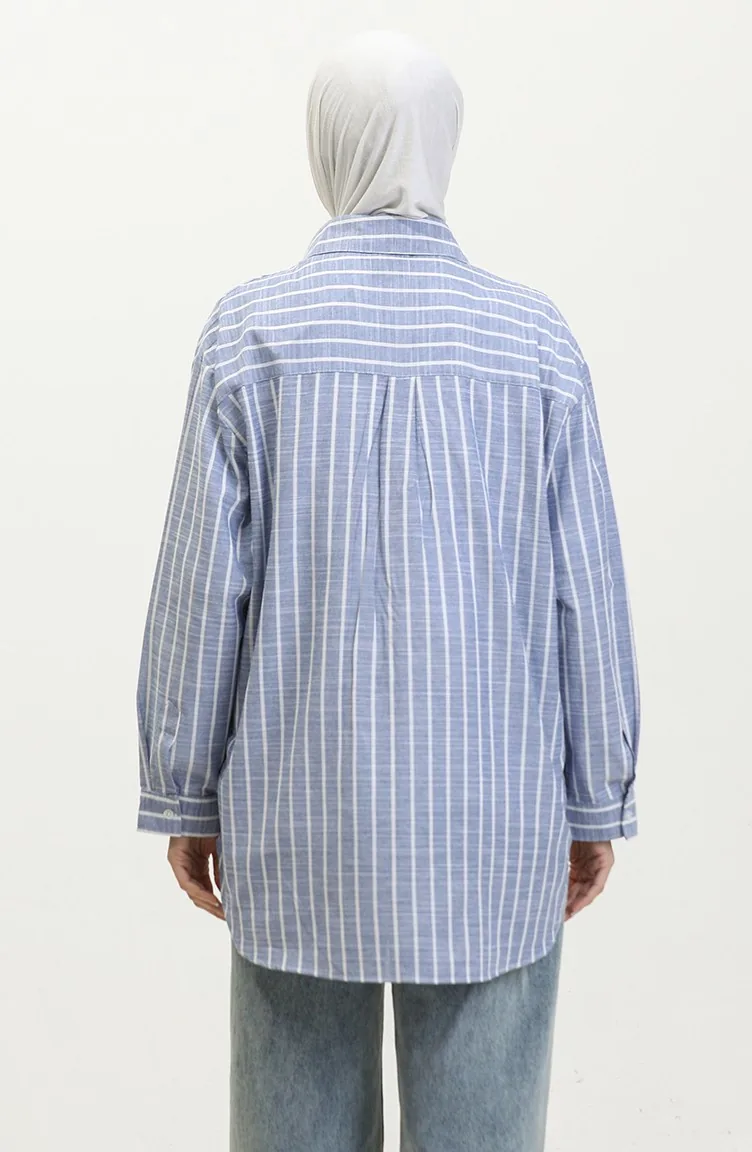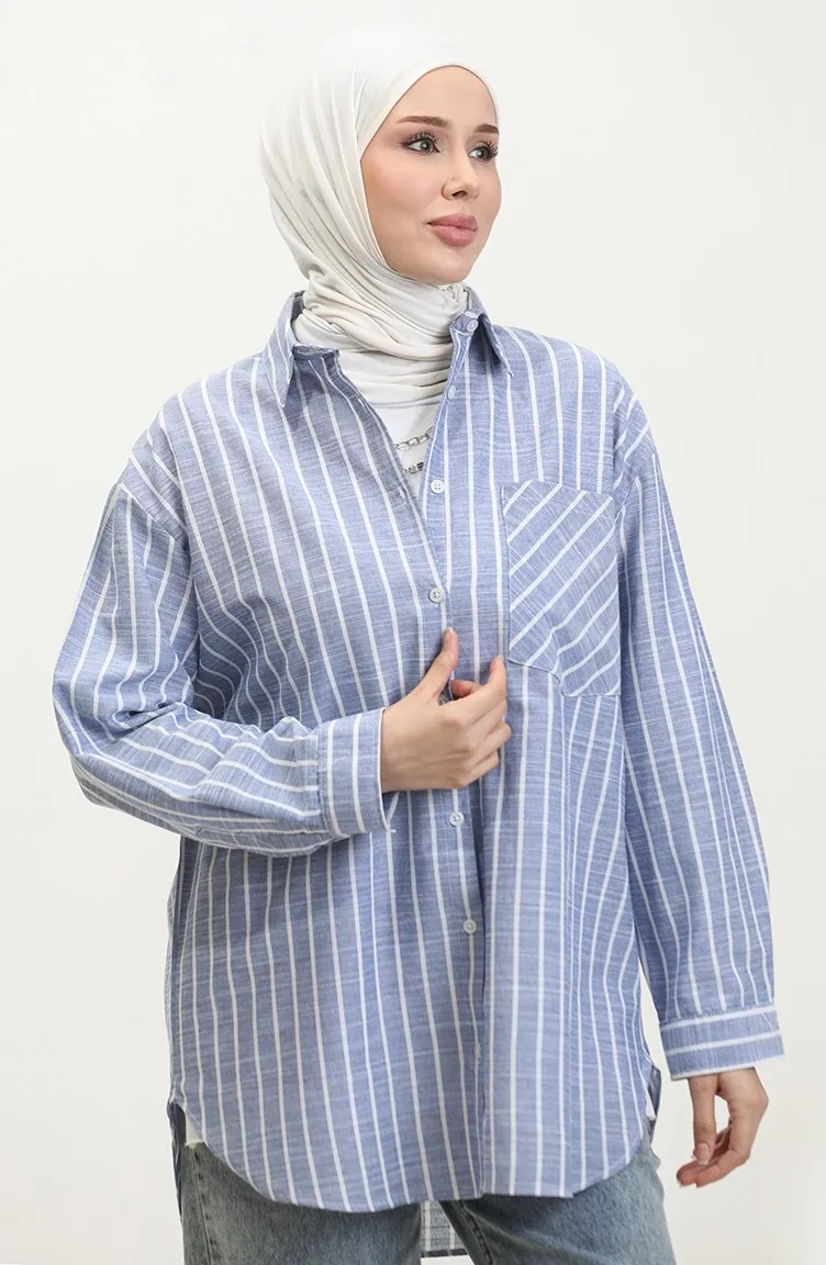 نيلي اللون استخدامها. نسيج القطن لديه نسيج ماص. صمم من القماش المخطط. المنتج ذو الاستخدام بدون تبطين. المنتج طويلة الأكمام. ياقة القميص تفضل في كثير من الكومبينات. مناسب لجميع المواسم. هناك مقاسات كبيرة.