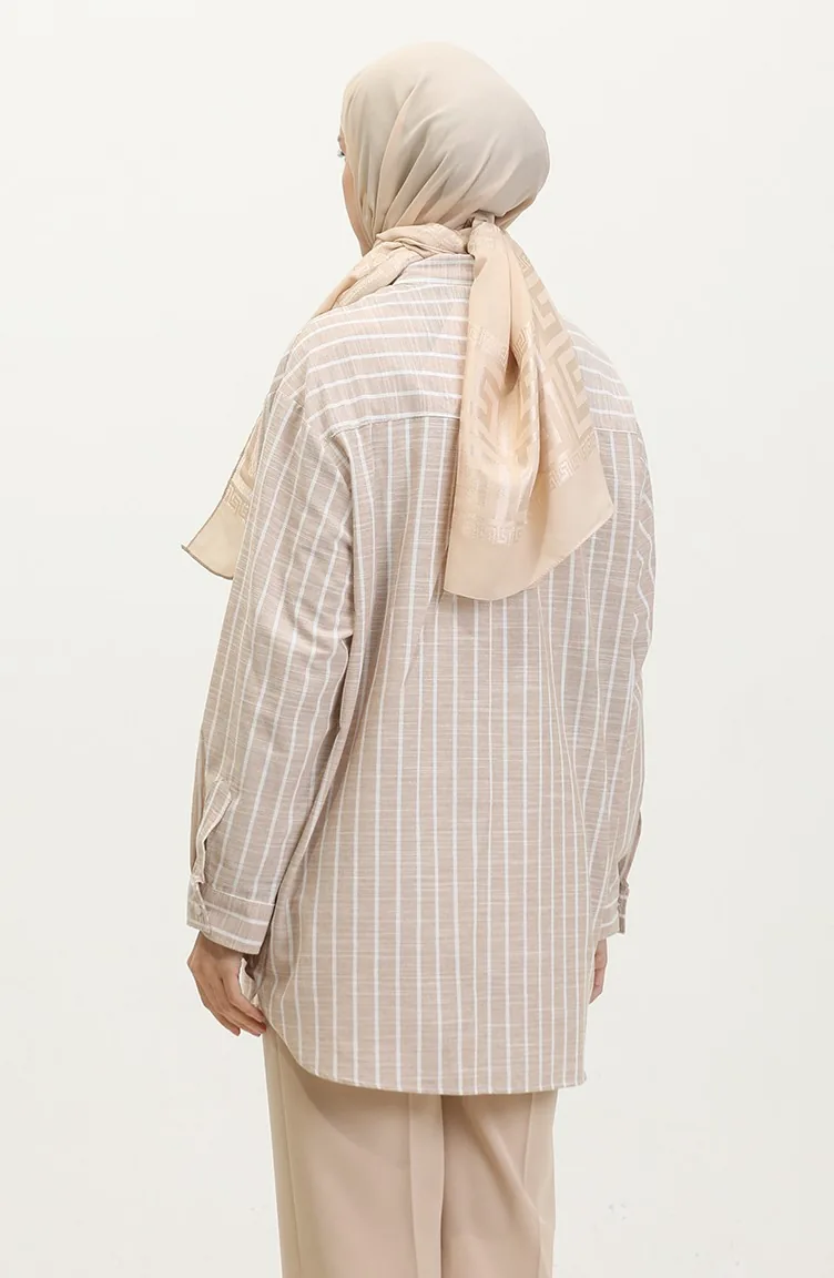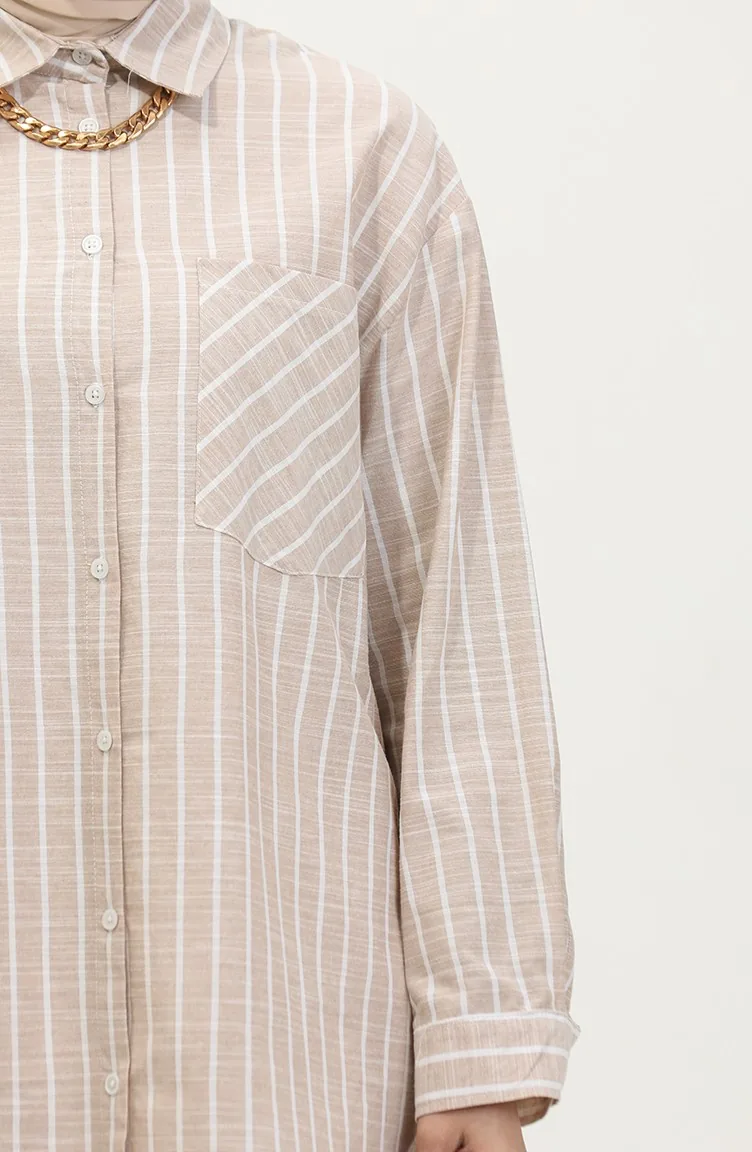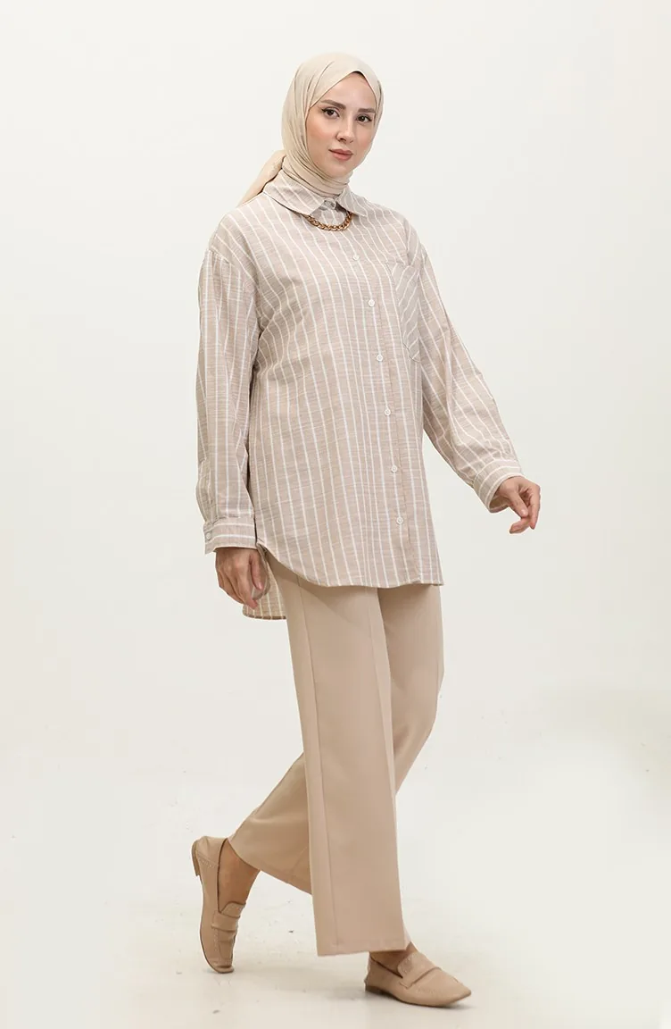 استخدم فيه اللون الشوكو. نسيج القطن لديه نسيج ماص. صمم من القماش المخطط. المنتج ذو الاستخدام بدون تبطين. المنتج طويلة الأكمام. ياقة القميص تفضل في كثير من الكومبينات. مناسب لجميع المواسم. هناك مقاسات كبيرة.