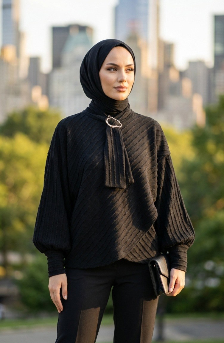 بلوزة برباط ياقة 71370-05 سوداء 71370-05