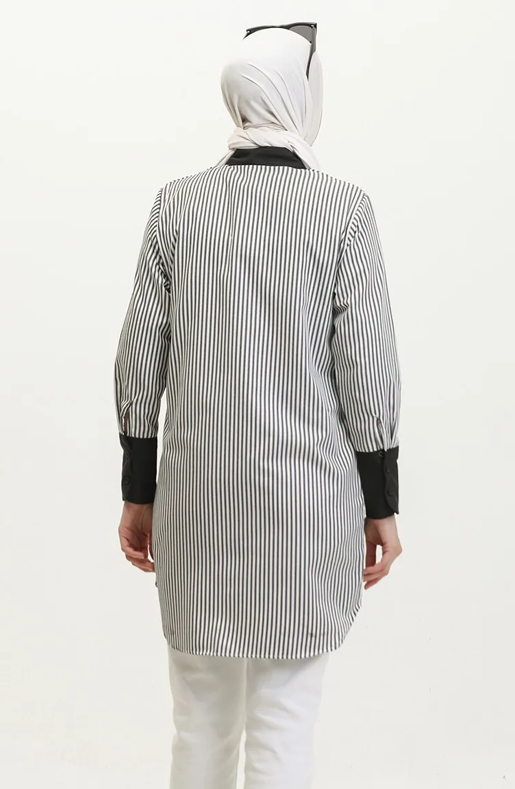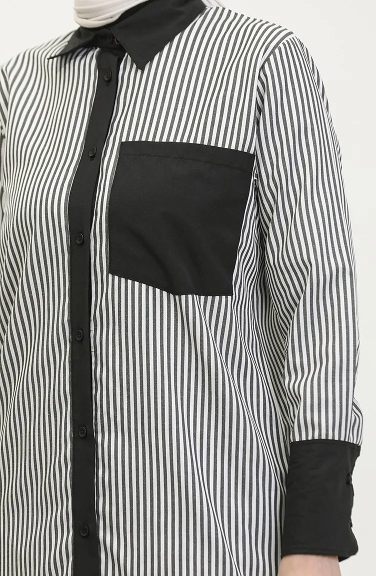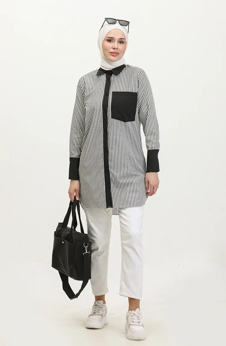 استخدم فيه اللون الأسود. نسيج القطن لديه نسيج ماص. صمم من القماش المخطط. المنتج ذو الاستخدام بدون تبطين. المنتج طويلة الأكمام. ياقة القميص تفضل في كثير من الكومبينات. قماشه مناسب لجميع المواسم. هناك مقاسات كبيرة.