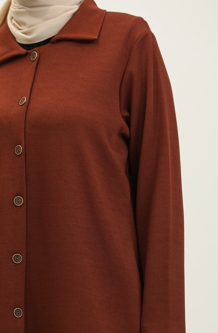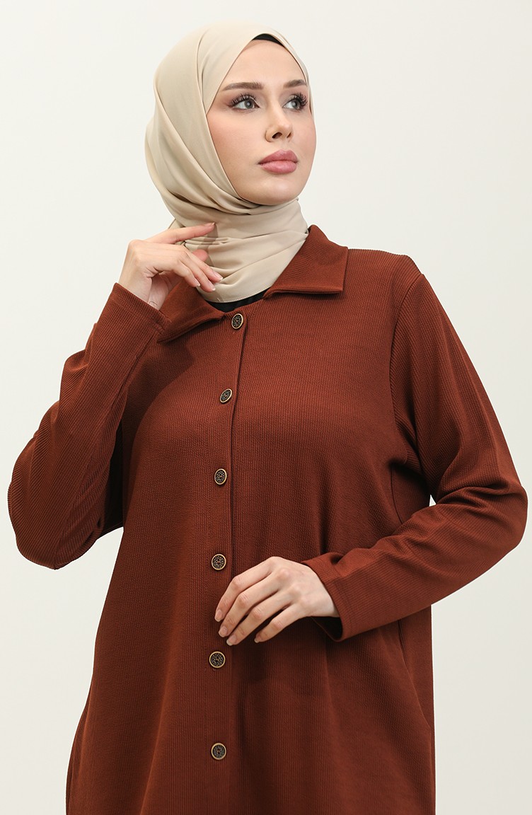 استخدم فيه اللون البني المحروق. استخدم فيه القماش المحاك. ذو مظهر سادة. المنتج ذو الاستخدام بدون تبطين. المنتج طويلة الأكمام. ياقة القميص تفضل في كثير من الكومبينات. قماشه مناسب لجميع المواسم. نساء. هناك مقاسات كبيرة.
