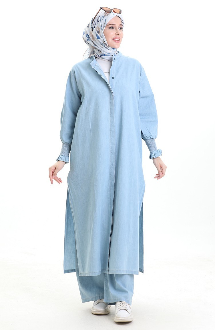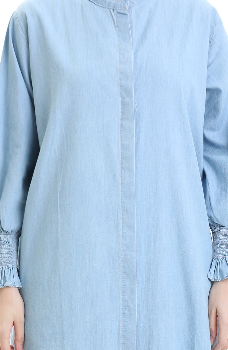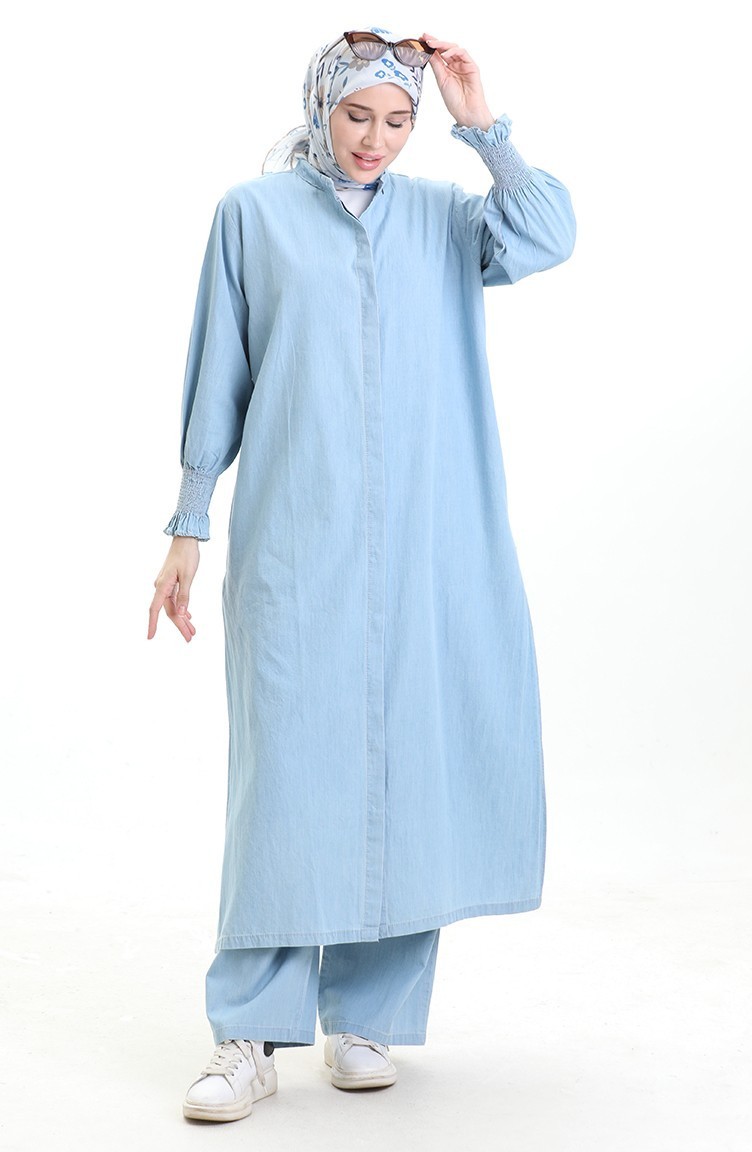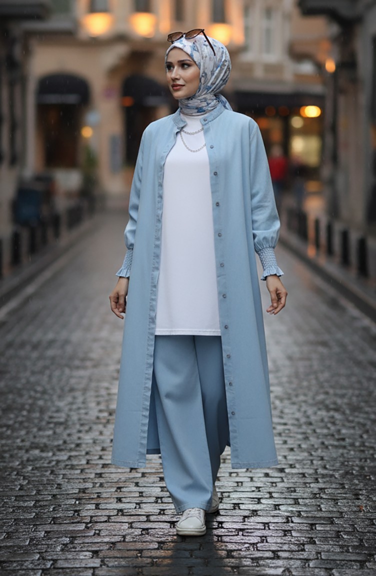 استخدم فيه اللون الأزرق الفاتح. ذو مظهر سادة. استعملت الأزرار ليجعل المنتج سهولة الارتداء. مناسب لجميع المواسم. هناك مقاسات كبيرة.
